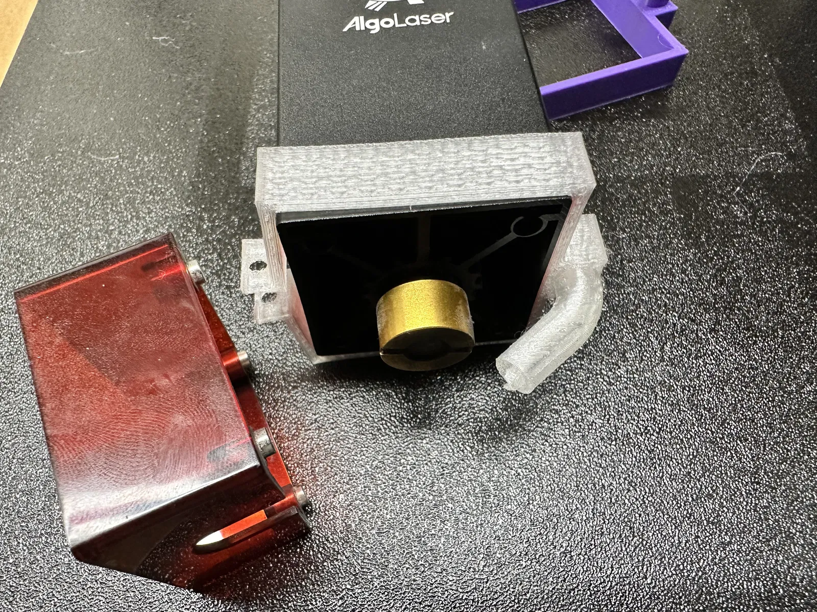 Phiên bản chế đơn giản, tùy chỉnh lại để phù hợp với đầu laser Algolaser 5w DIY. Có thể dùng cho các loại có cùng kích thước. Đừng bận tâm ống kính laser hơi bám bụi, đó chính là lý do cần có bộ hỗ trợ khí này.