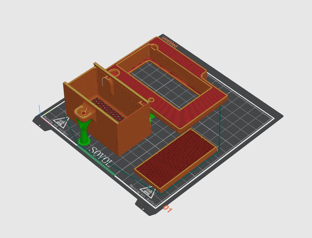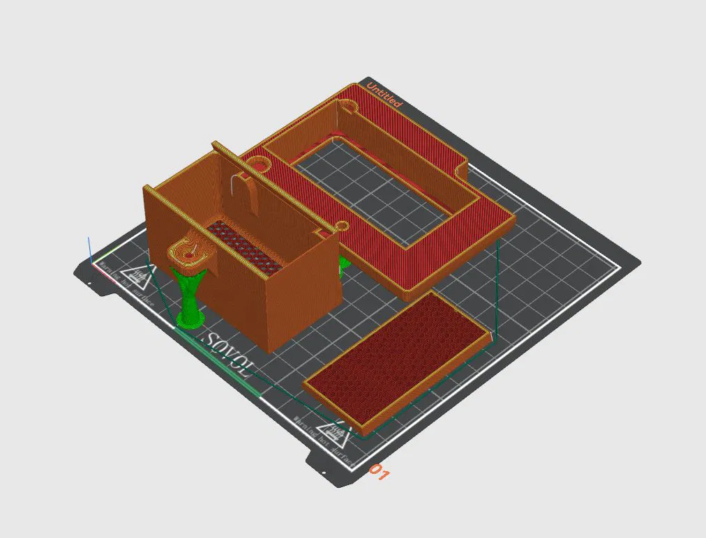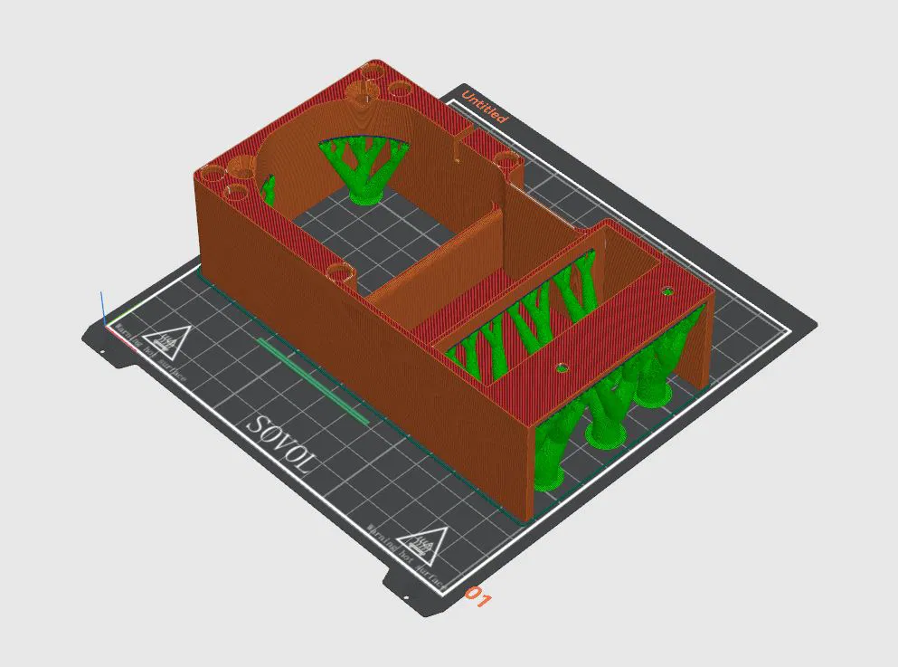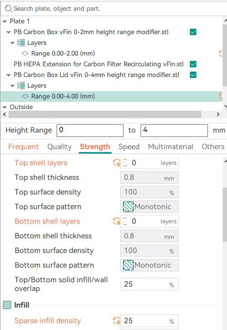 Đối với hộp carbon và nắp, hãy dùng tính năng điều chỉnh khoảng cách chiều cao (height range modifier) trong phần mềm slicer nha. Tui đã dùng kiểu lưới tổ ong (honeycomb) với độ dày 25%.