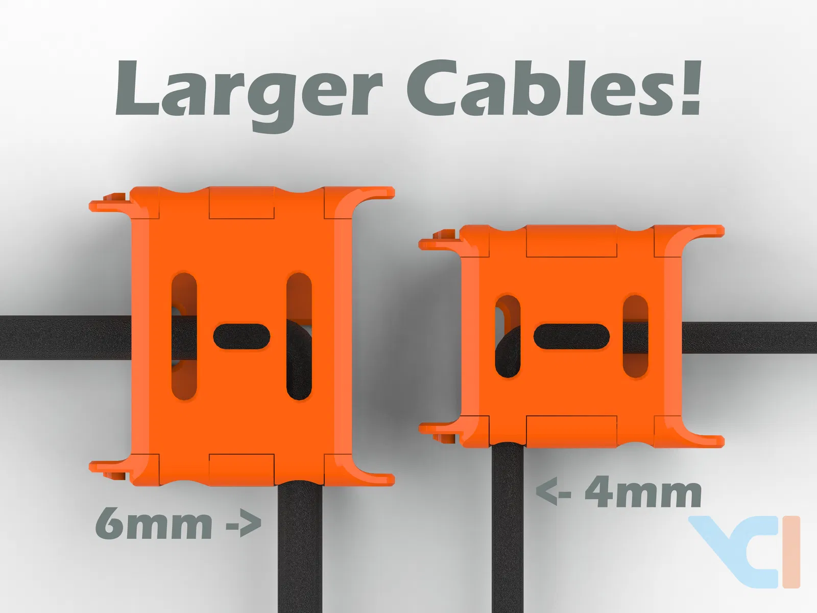 FlexiLink XL mở rộng ý tưởng FlexiLink ban đầu với các mắt nối rộng hơn và dung lượng cáp lớn hơn — lý tưởng cho dây dày hoặc bó dây. Nó cung cấp gấp đôi không gian bên trong so với phiên bản tiêu chuẩn, và các khe mở bên lớn hơn hỗ trợ cáp có đường kính lên tới 8 mm.