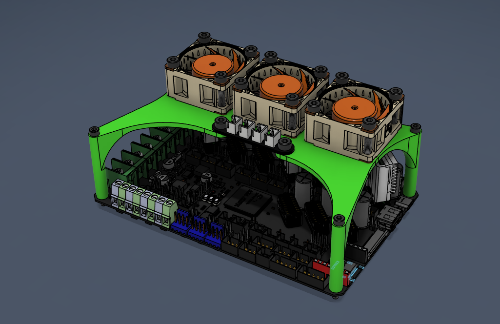 Thiết kế này tối ưu cho quạt 40×40×20 mm, cung cấp luồng gió mạnh, trực tiếp lên tất cả các driver stepper để cải thiện độ ổn định nhiệt trong quá trình in lâu, dòng điện motor cao hơn, hoặc khi đặt trong môi trường kín. Nó cũng hoạt động hoàn hảo với quạt 40×40×10 mm, chỉ cần dùng ốc bắt dài hơn một chút.