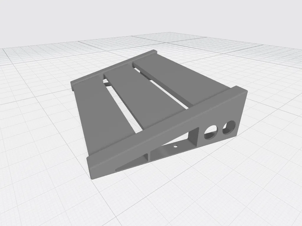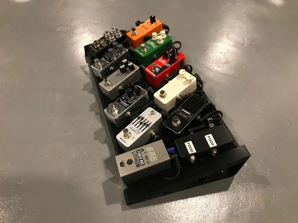 Tao lấy cảm hứng từ mấy cái chân đế pedalboard khác mà tao thấy, nhưng mà tao muốn có cái đáy phẳng để tao có thể dán đế lên để giữ cho nó khỏi bị trượt. Cái này được thiết kế để xài mấy miếng ván gỗ dương 1/2” x 2-1/2” mà mày có thể mua ở Home Depot. Độ khít phải đủ chặt để nó tự giữ được, nhưng mà có lỗ bắt ốc phòng trường hợp cần thiết.
