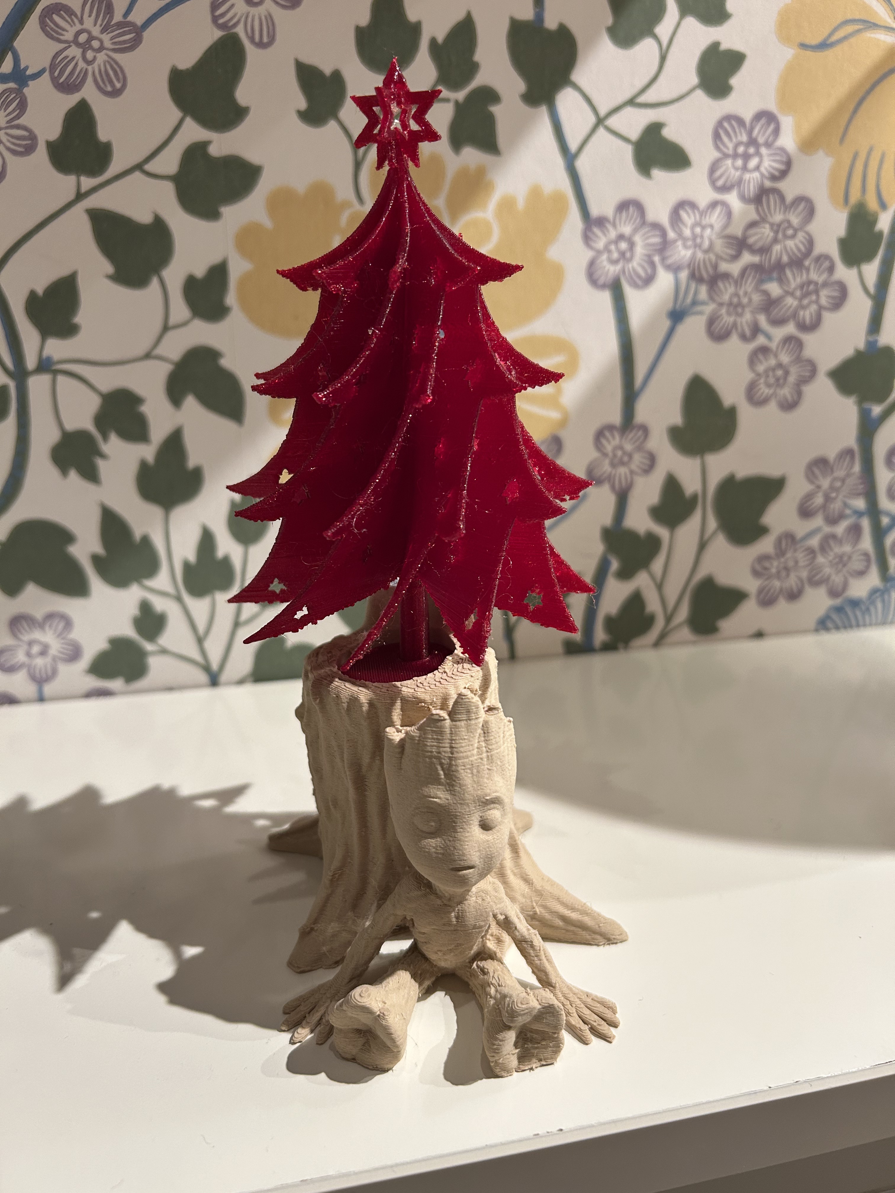 Thích bộ phim Vệ Binh Dải Ngân Hà, tôi rất thích Chậu Baby Groot của CalebTimoteo. Nay làm thêm Cây Thông Noel cho chậu này, gồm 3 phần: Cây, Chân đế và Vòng đệm. Có thể in với đầu phun 0.6mm, thu nhỏ kích thước 50% để phù hợp với máy in cũ.