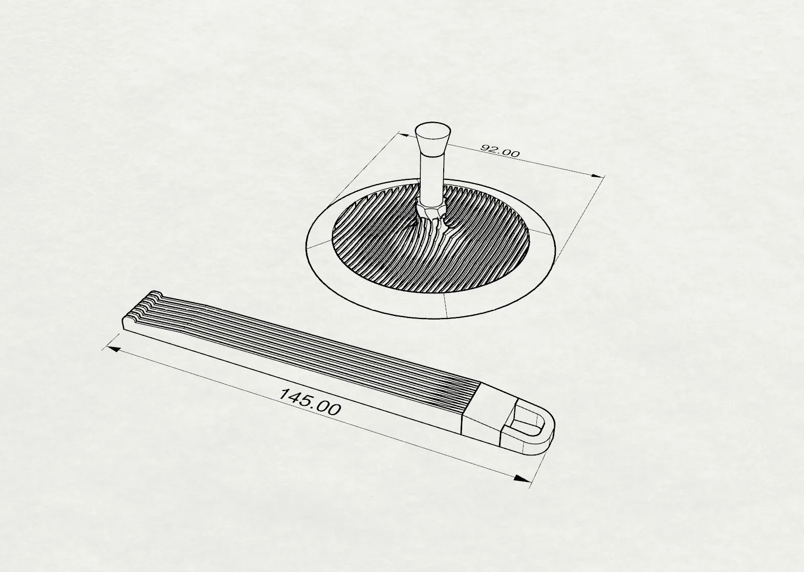 Khi vệ sinh lỗ thoát nước phòng tắm, lúc nào cũng khó tránh khỏi việc phải dùng tay chạm trực tiếp vào chỗ bẩn. Cái lọc này có thêm tay cầm cao, kèm theo cây cọ để làm sạch các khe của lưới lọc, giải quyết triệt để vấn đề đụng vào vết bẩn khi vệ sinh. Mẫu này không cần dùng support. Cá nhân tui hay xài loại đường kính 92mm. Tui có làm hai mẫu, một hình vuông và một hình tròn. Ngoài ra còn có mẫu đường kính 100mm, có lẽ là loại phổ biến hơn và dễ chỉnh sửa hơn.