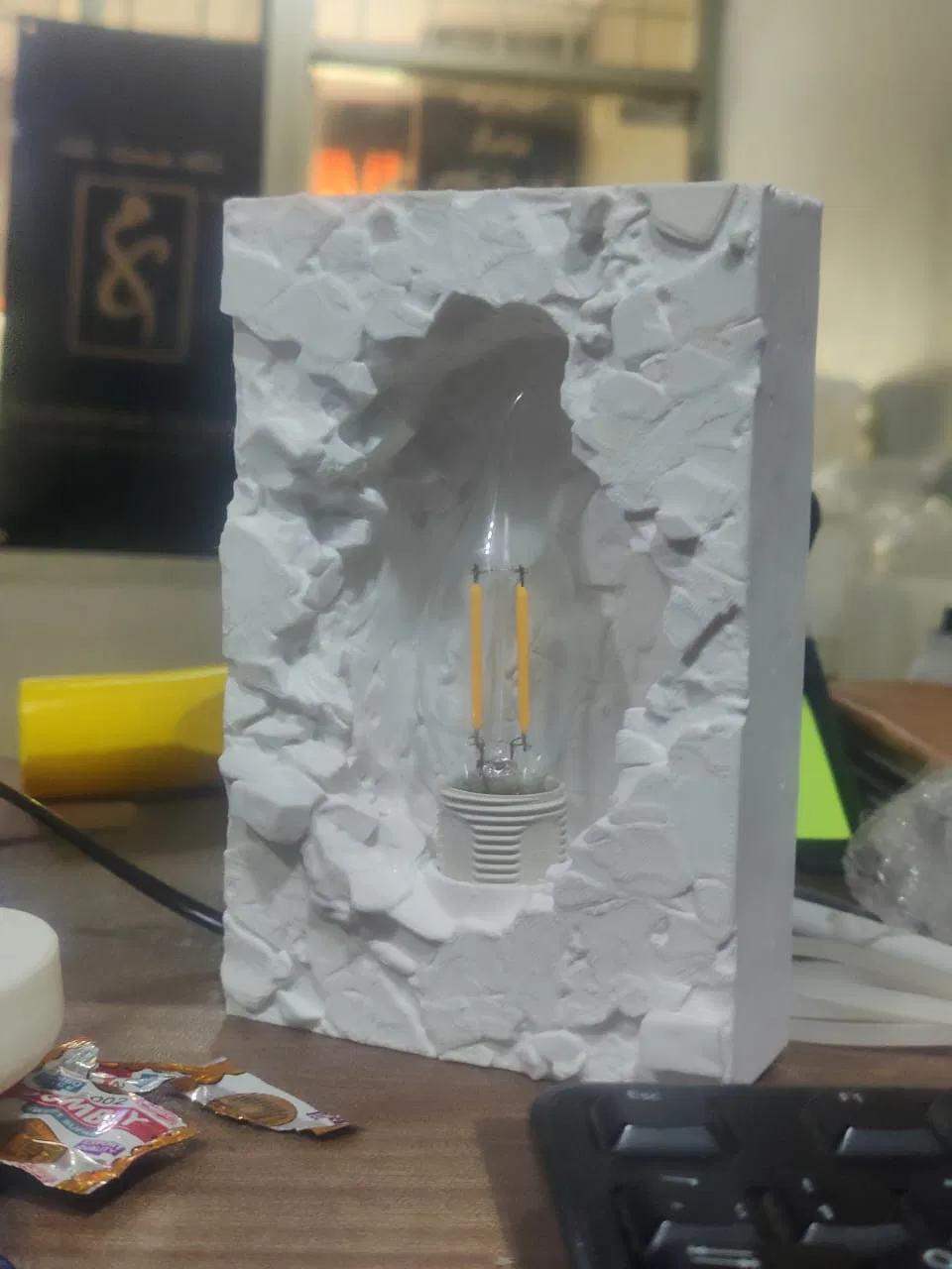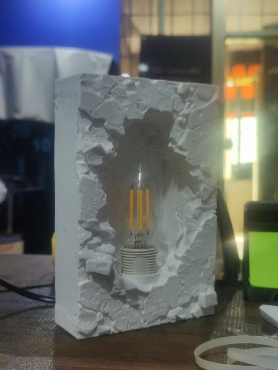 Khối Đá Hang Động là món đồ chiếu sáng độc đáo, pha trộn kiến trúc brutalist và hữu cơ. Với họa tiết đá thô ráp và ánh sáng ấm áp, thiết kế này hoàn hảo cho bàn đầu giường, bàn làm việc, hay kệ sách. Sử dụng PLA Trắng Mờ để có hiệu ứng chân thực nhất và BẮT BUỘC dùng bóng LED để đảm bảo an toàn.