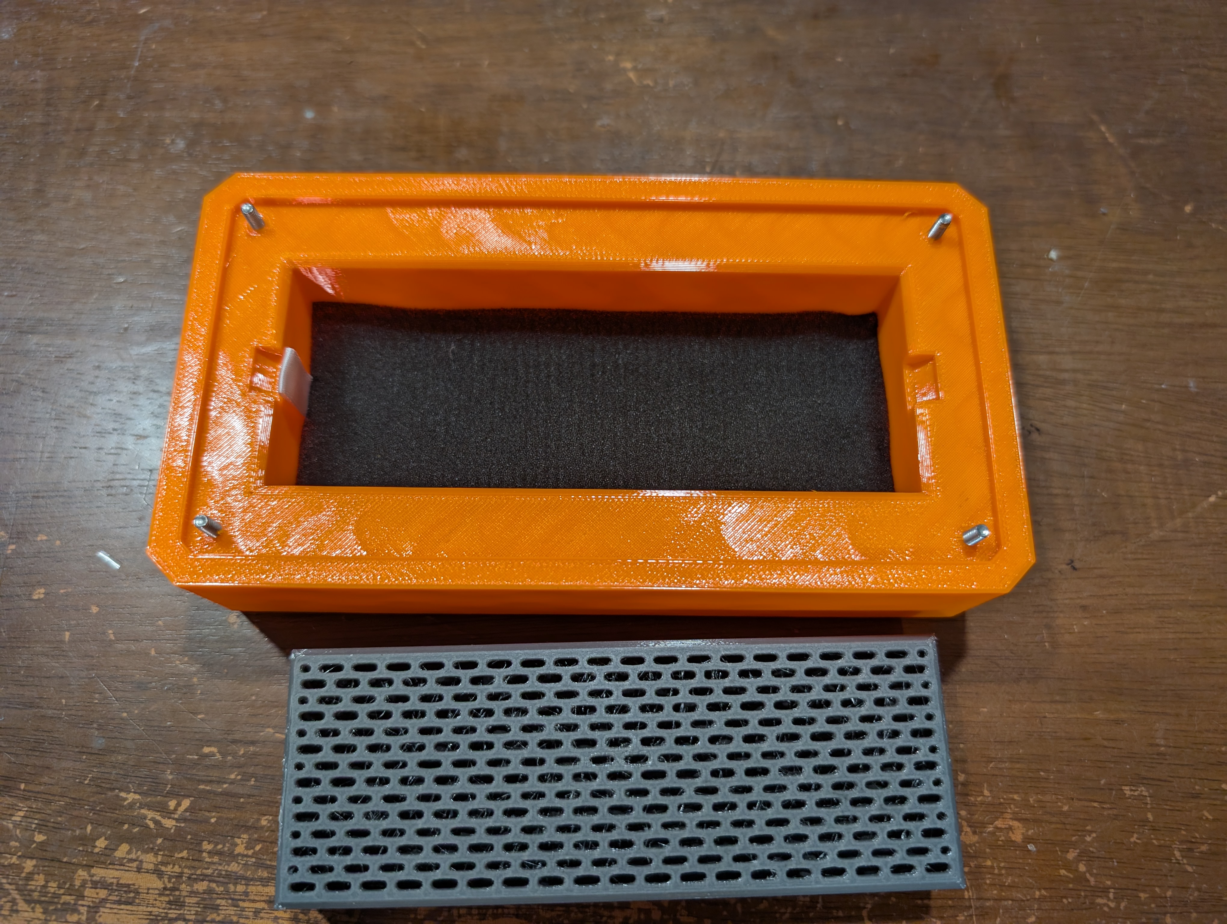 In hộp than với màu khác để có vẻ ngoài đẹp hơn (nhưng cái đó nằm bên trong!). Hộp bên ngoài được thiết kế với một trình sửa đổi tại chỗ có thể được sử dụng để có được lưới khác nhau bằng cách thay đổi mẫu độ lấp đầy.