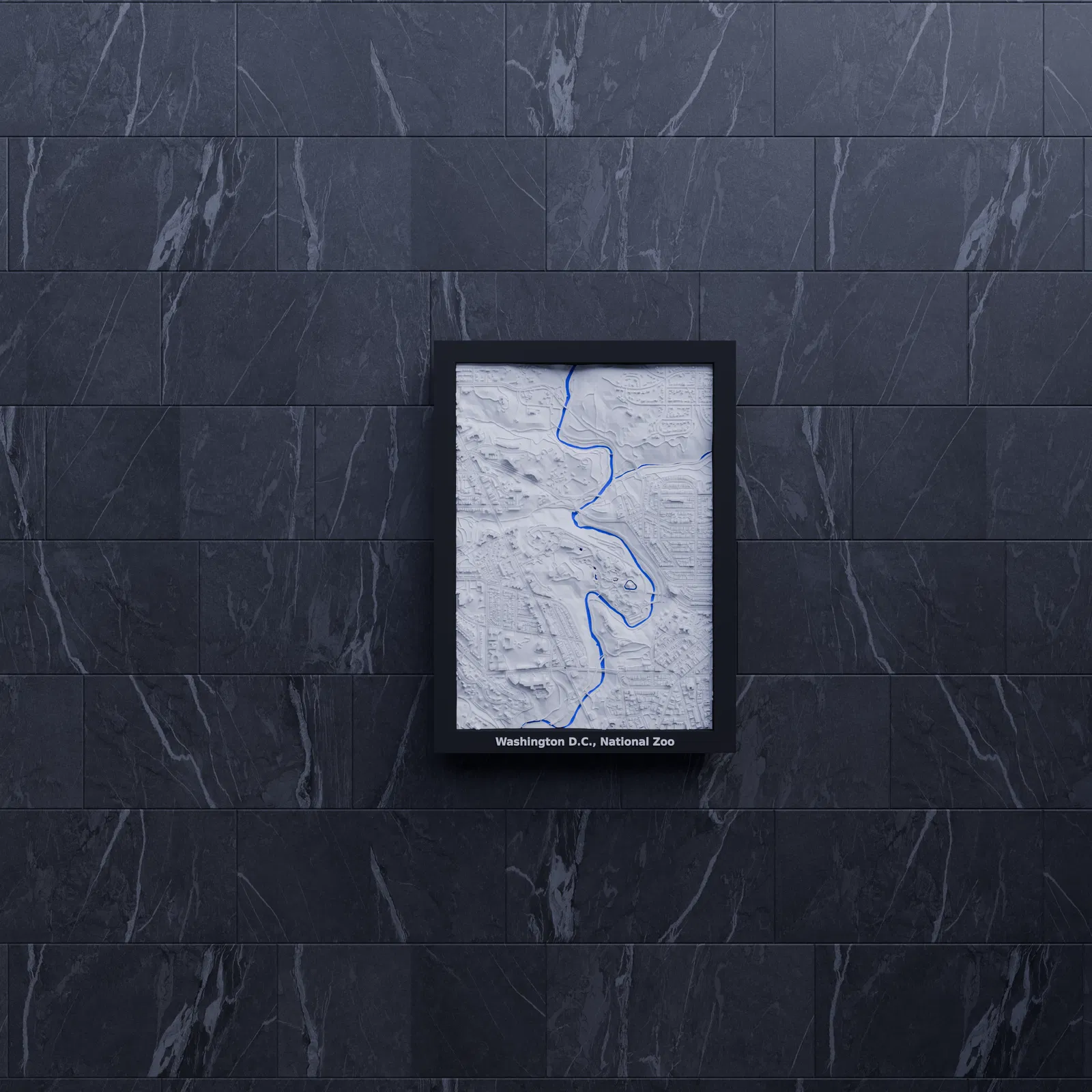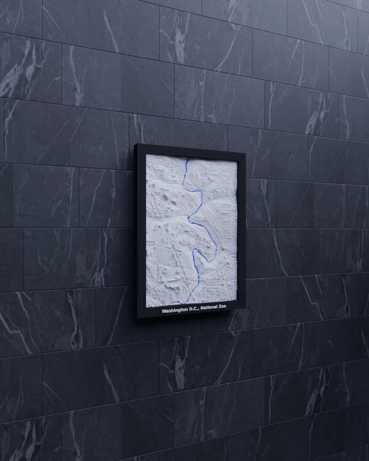 Mô hình địa hình 3D Vườn thú Quốc gia Washington D.C. thu nhỏ cảnh quan địa lý thực tế từ 1,734 km x 2,442 km xuống kích thước 119,5 mm x 170,5 mm. Lý tưởng cho giáo dục, trực quan hóa kiến trúc, hoặc trang trí.