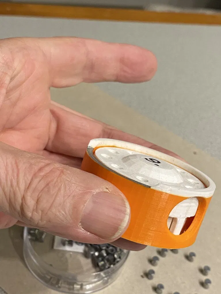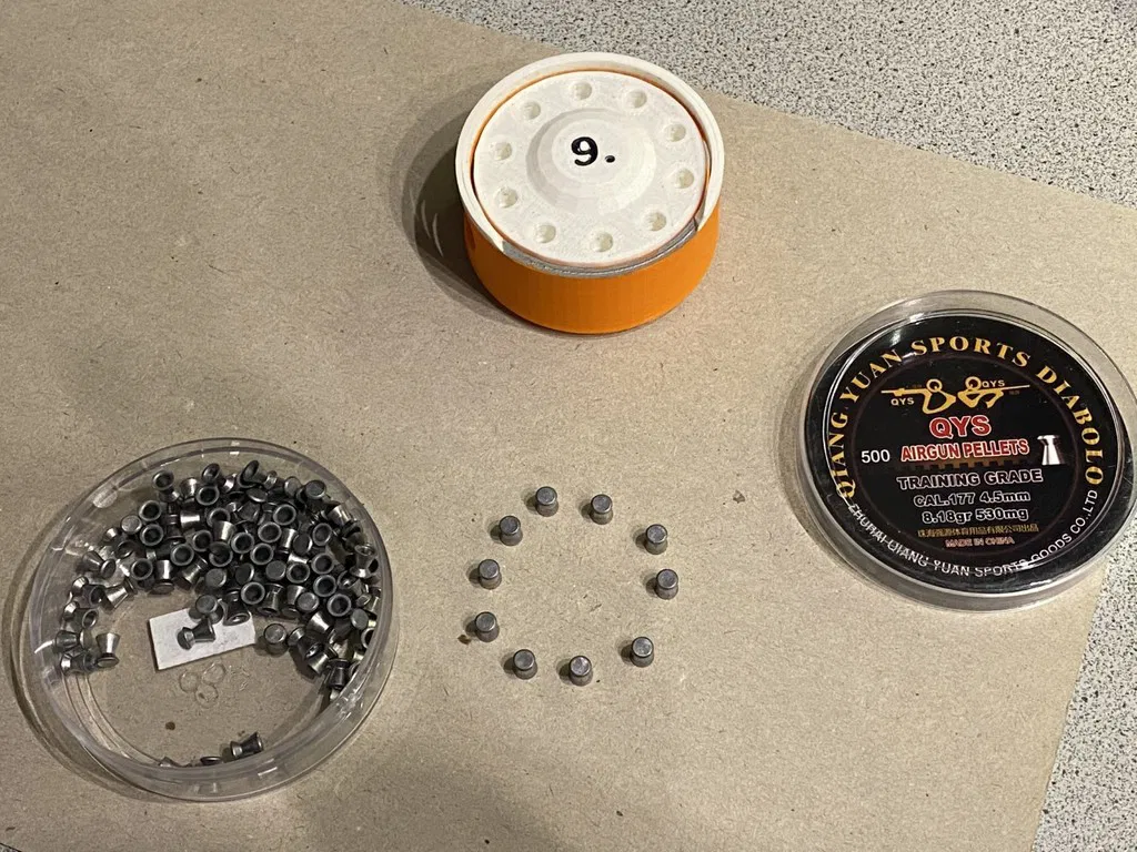 You lift the slider with one "left-over" finger, pour away the remaining pellets, best into its origin container! Then you quickly turn the device 180° and drop it on a "soft" surface. If you are lucky, and I bet you will after several trials, then you have ten shots nicley aligned in a circle.