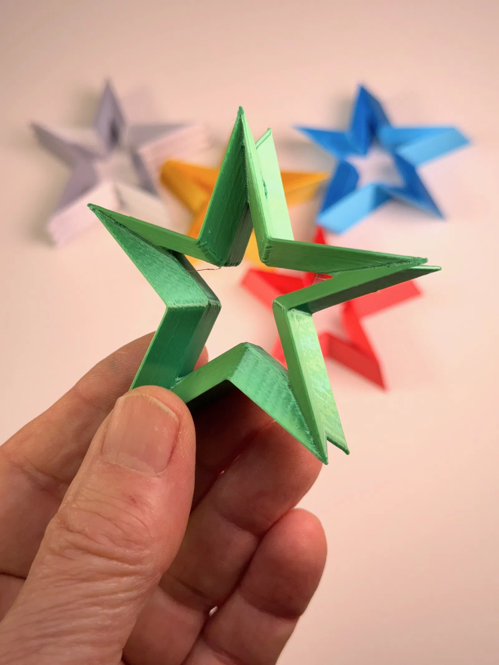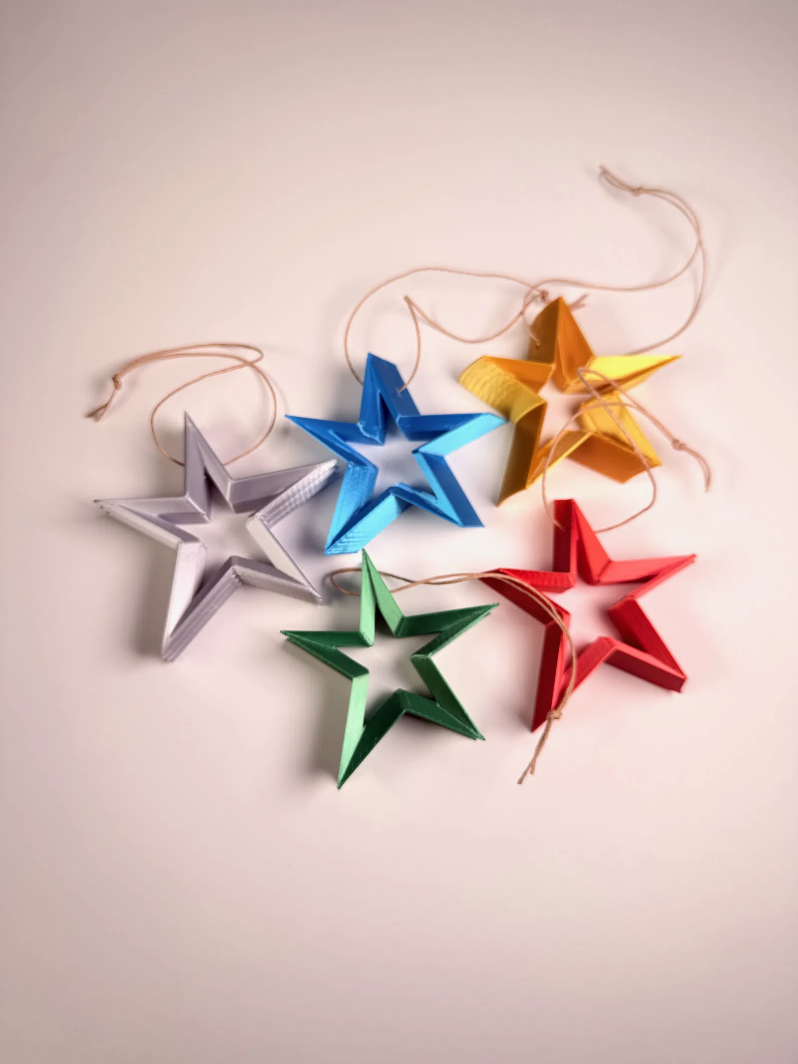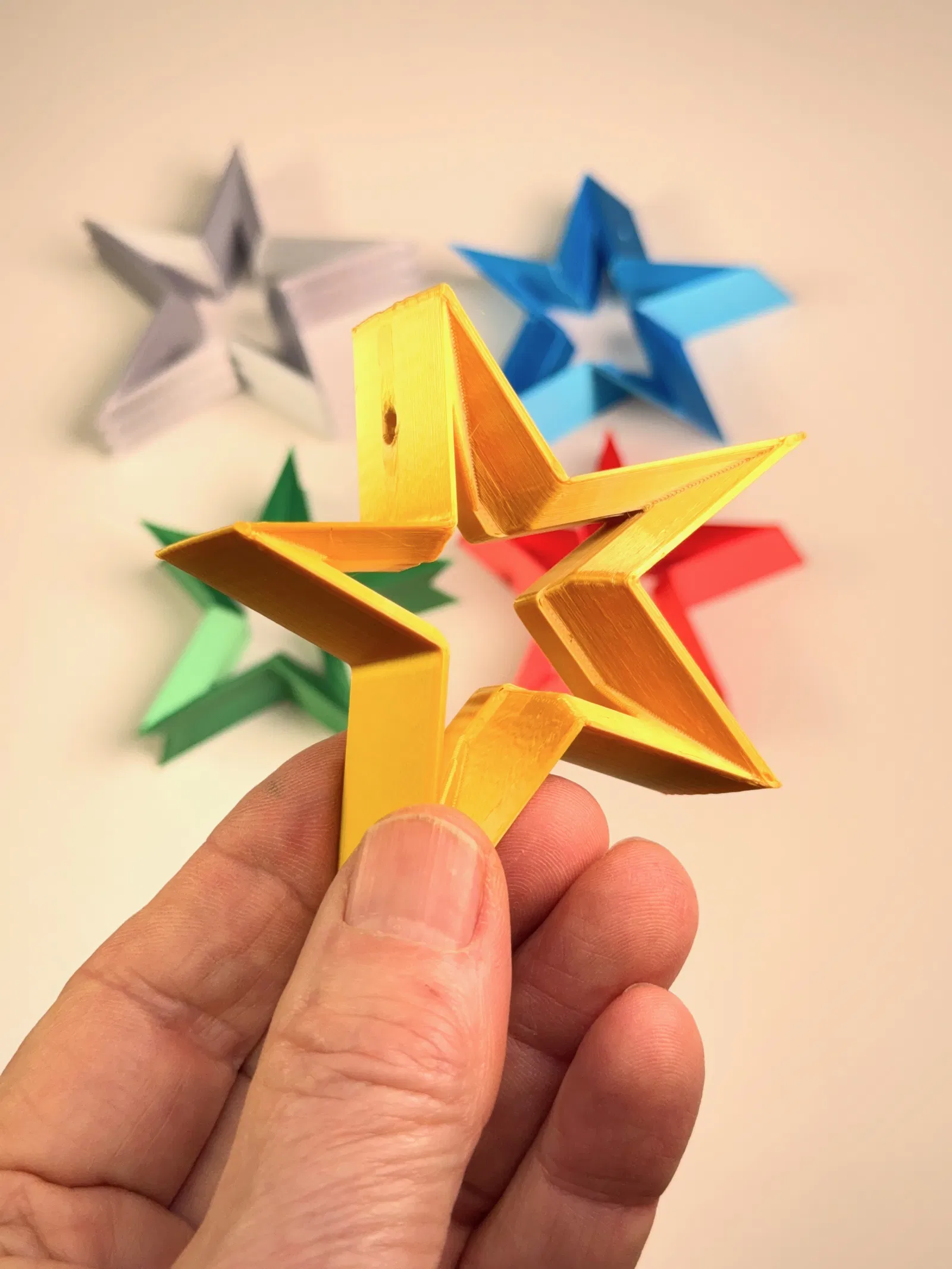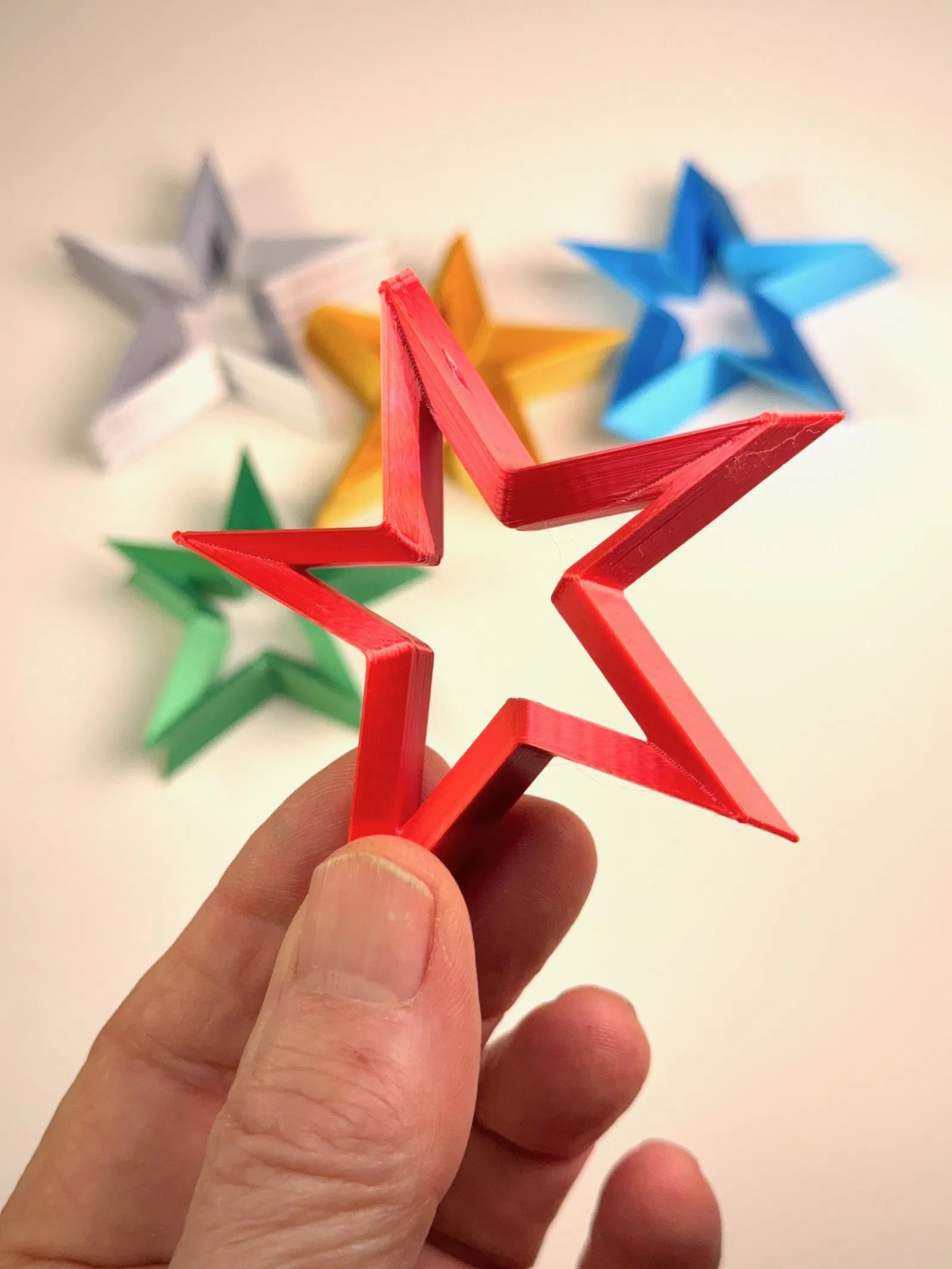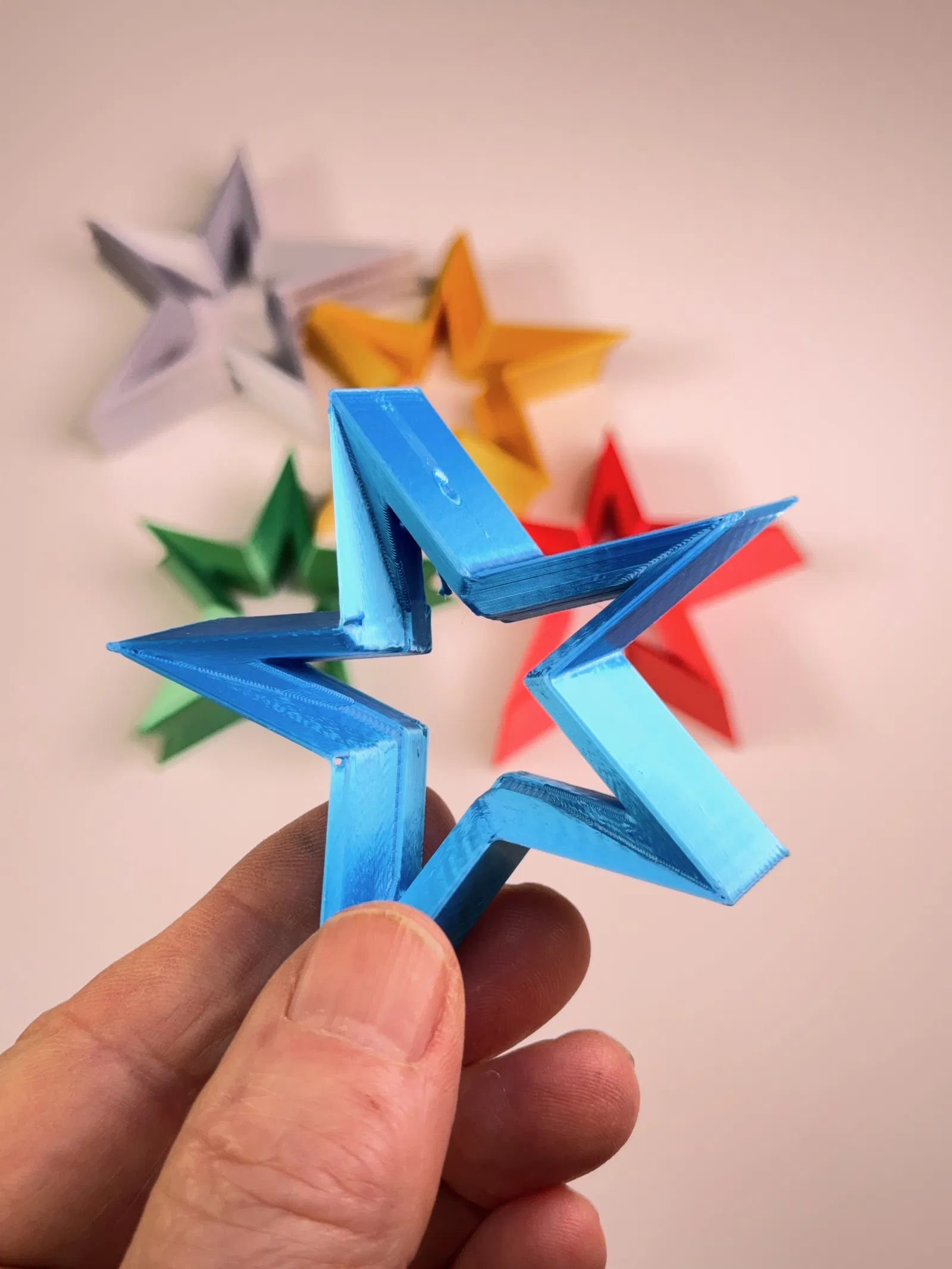 Hàng năm, tui đều thiết kế và làm một bộ sưu tập lớn các mẫu chuông sao và chia sẻ với cộng đồng nhỏ của tui cho một sự kiện lễ hội. Để mỗi gia đình có một món đồ trang trí độc đáo, tui đã thiết kế các mẫu sao 3D dựa trên cùng một đường viền 2D và in với nhiều màu sắc khác nhau.