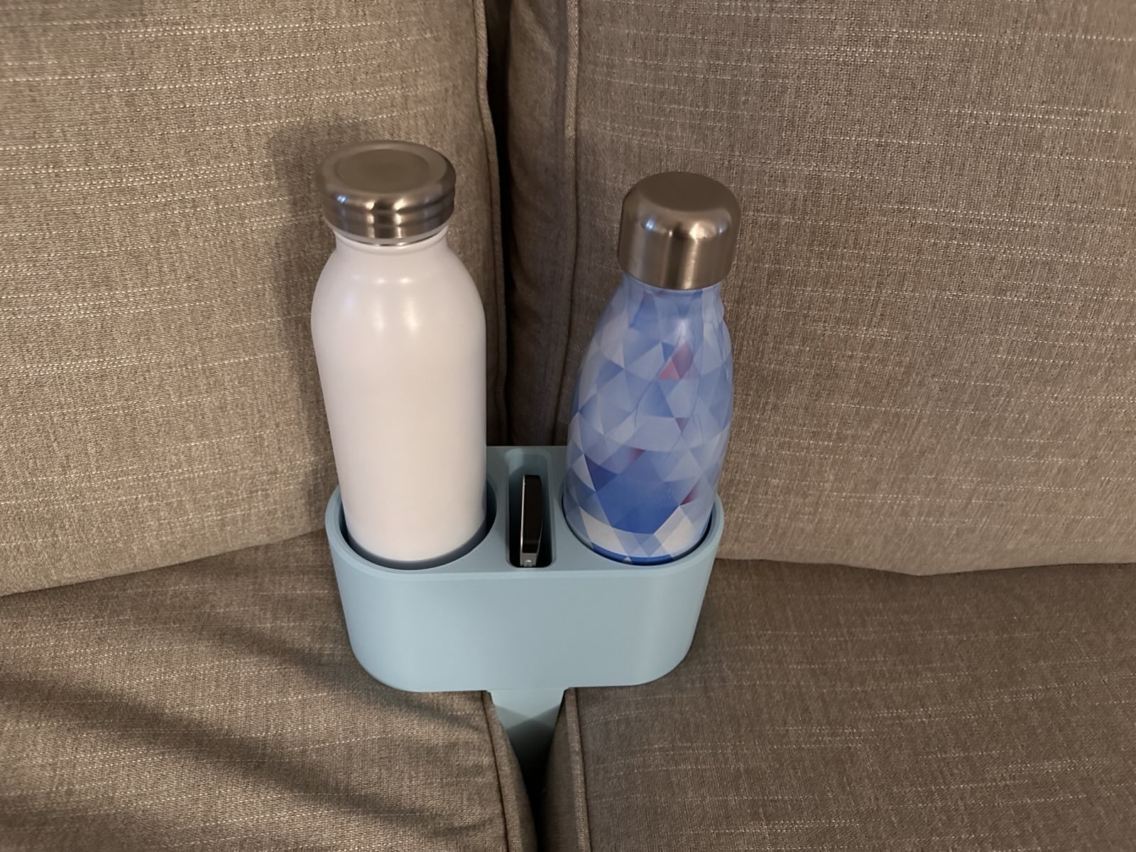 Biến thể của đế lót ly sofa có thể giữ chai nước loại nhỏ và cả remote. Có thêm miếng chêm lớn để giữ chắc chắn hơn trên ghế sofa nhà bạn.