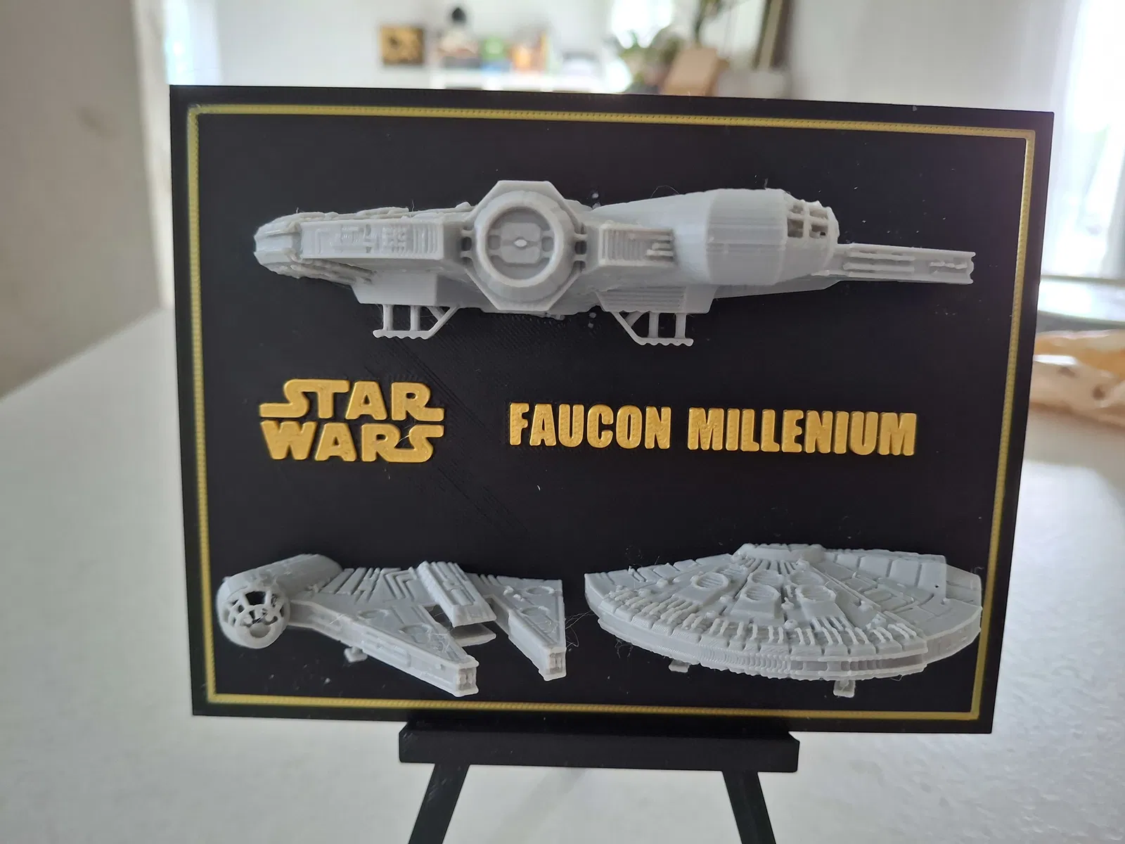 Trưng bày mô hình Faucon Millenium Starwars, một tác phẩm điêu khắc 3D độc đáo với hiệu ứng nổi và cắt lát. Kích thước 160 x 120 x 44, bạn có thể tùy chỉnh kích thước và màu sắc theo sở thích. Hoàn hảo cho người hâm mộ Starwars và dân mê in 3D.