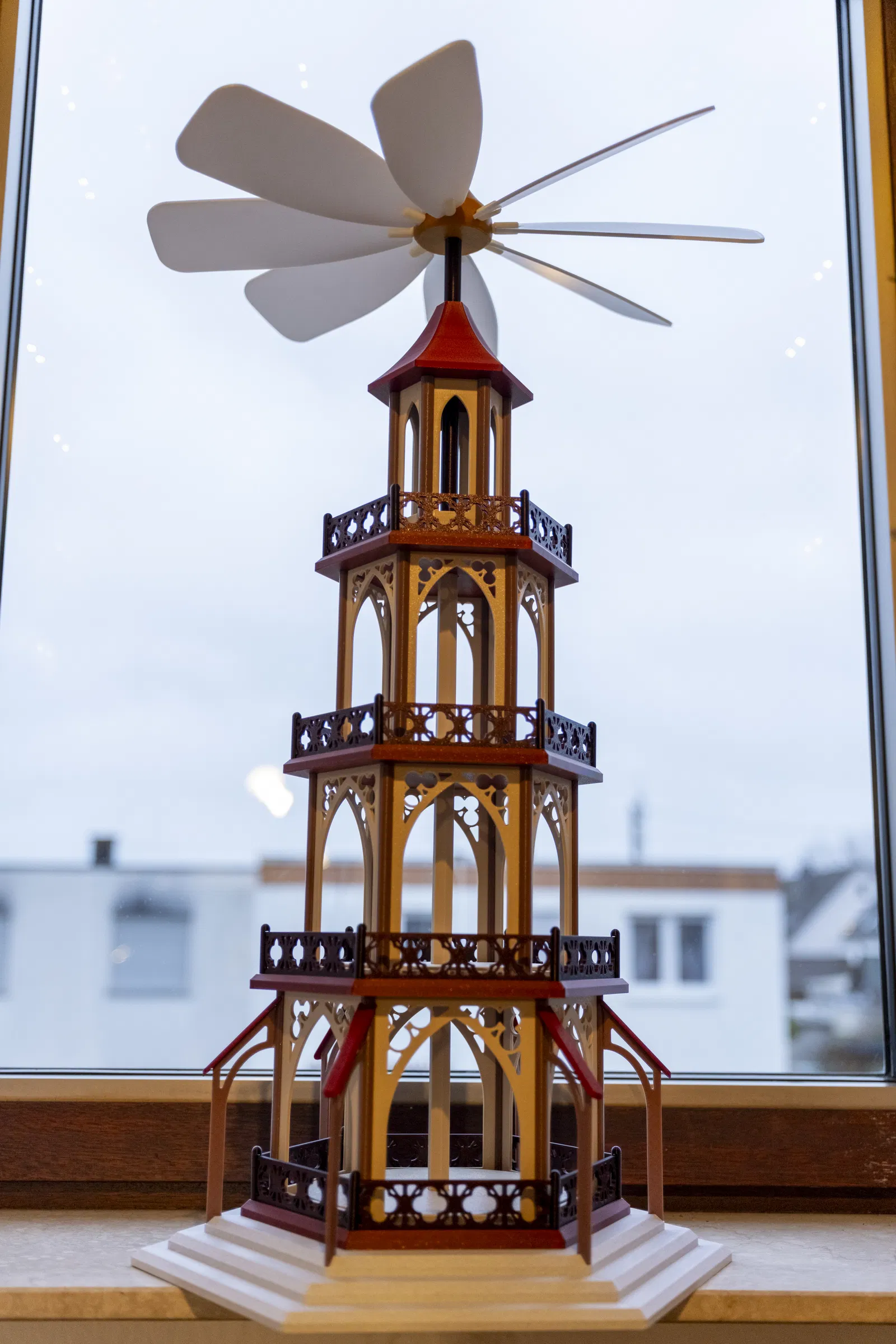 Mô hình kim tự tháp Giáng Sinh cổ điển, đã được chỉnh sửa để có thể in 3D. Thay vì dùng nến, bạn có thể dùng luồng gió từ quạt hoặc máy lọc không khí để xoay. Mô hình còn có không gian để gắn thêm động cơ nếu muốn. Bao gồm danh sách đầy đủ phần cứng và các chi tiết cần in, cùng hướng dẫn về supports và brim.