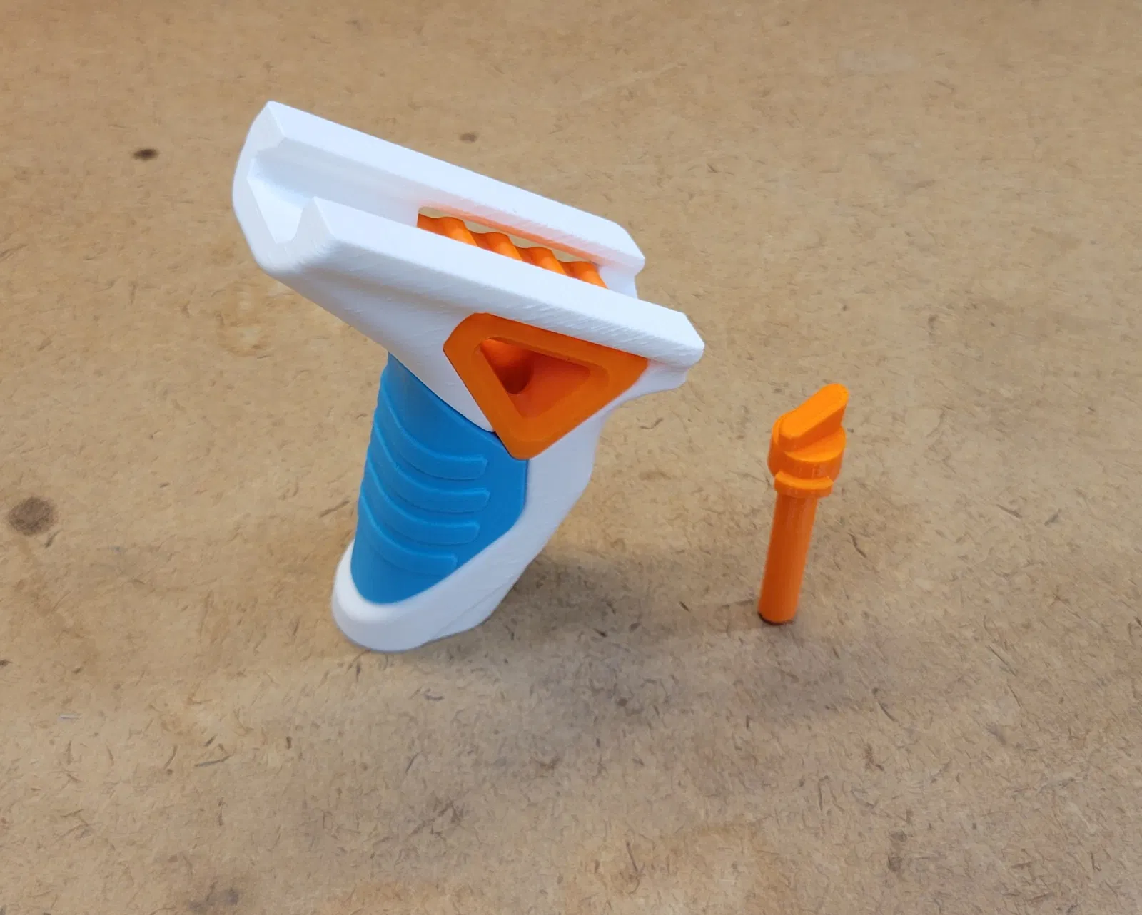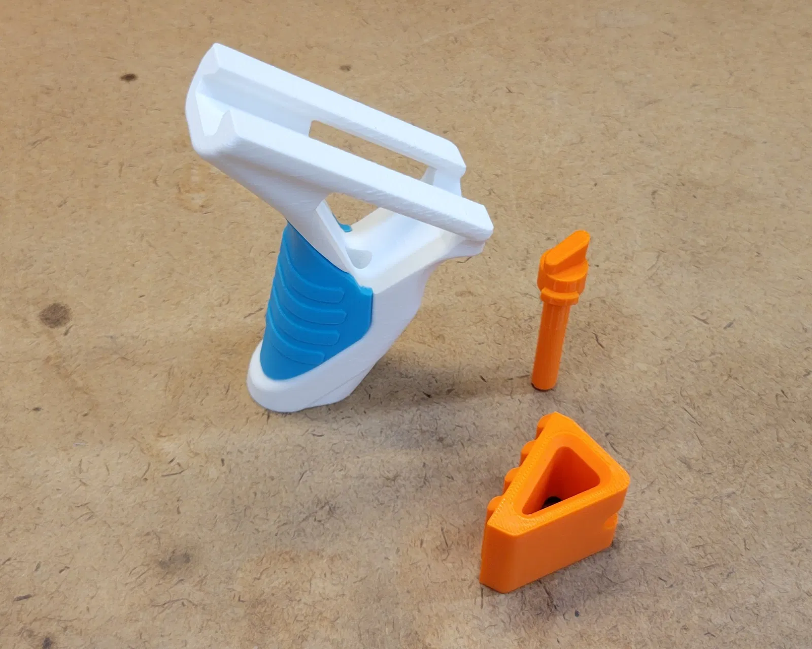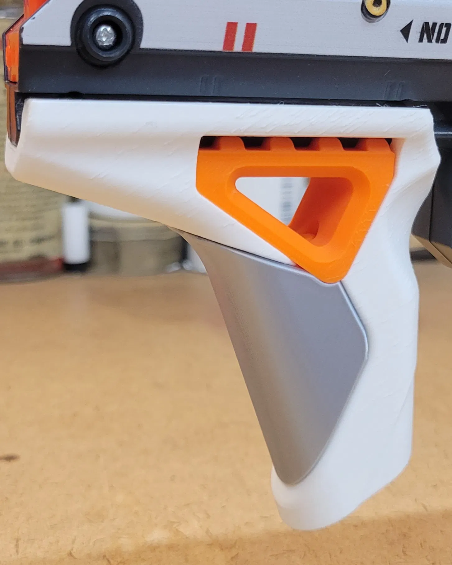 Một báng tay cầm góc cạnh theo chuẩn Picatinny, dễ in và dễ lắp ráp, không cần ốc vít và chỉ cần ít vật liệu hỗ trợ. Thiết kế này lấy cảm hứng từ các mẫu trước đó và mang lại cảm giác cầm nắm tốt, đặc biệt trên X-SHOT Pro Fury-X.