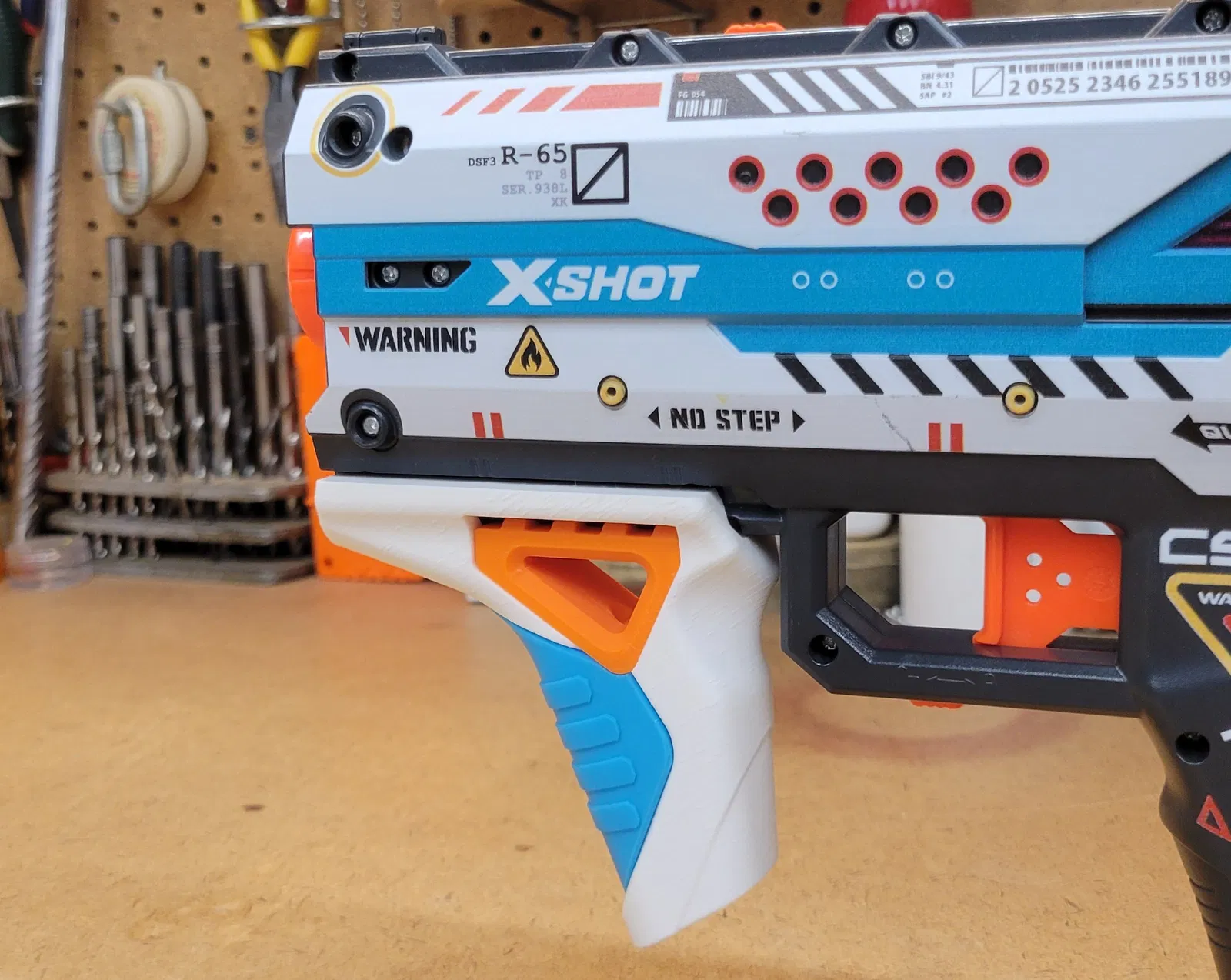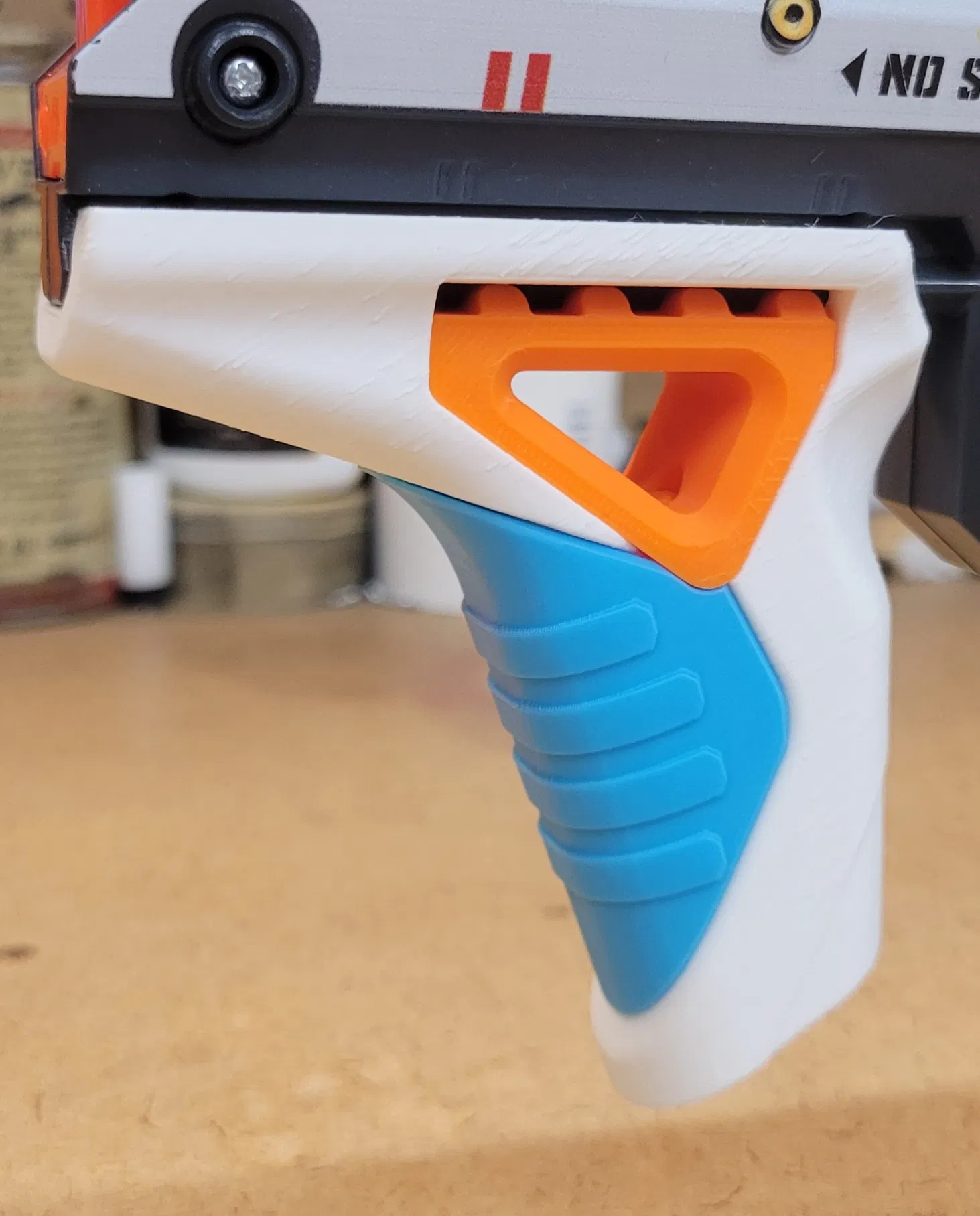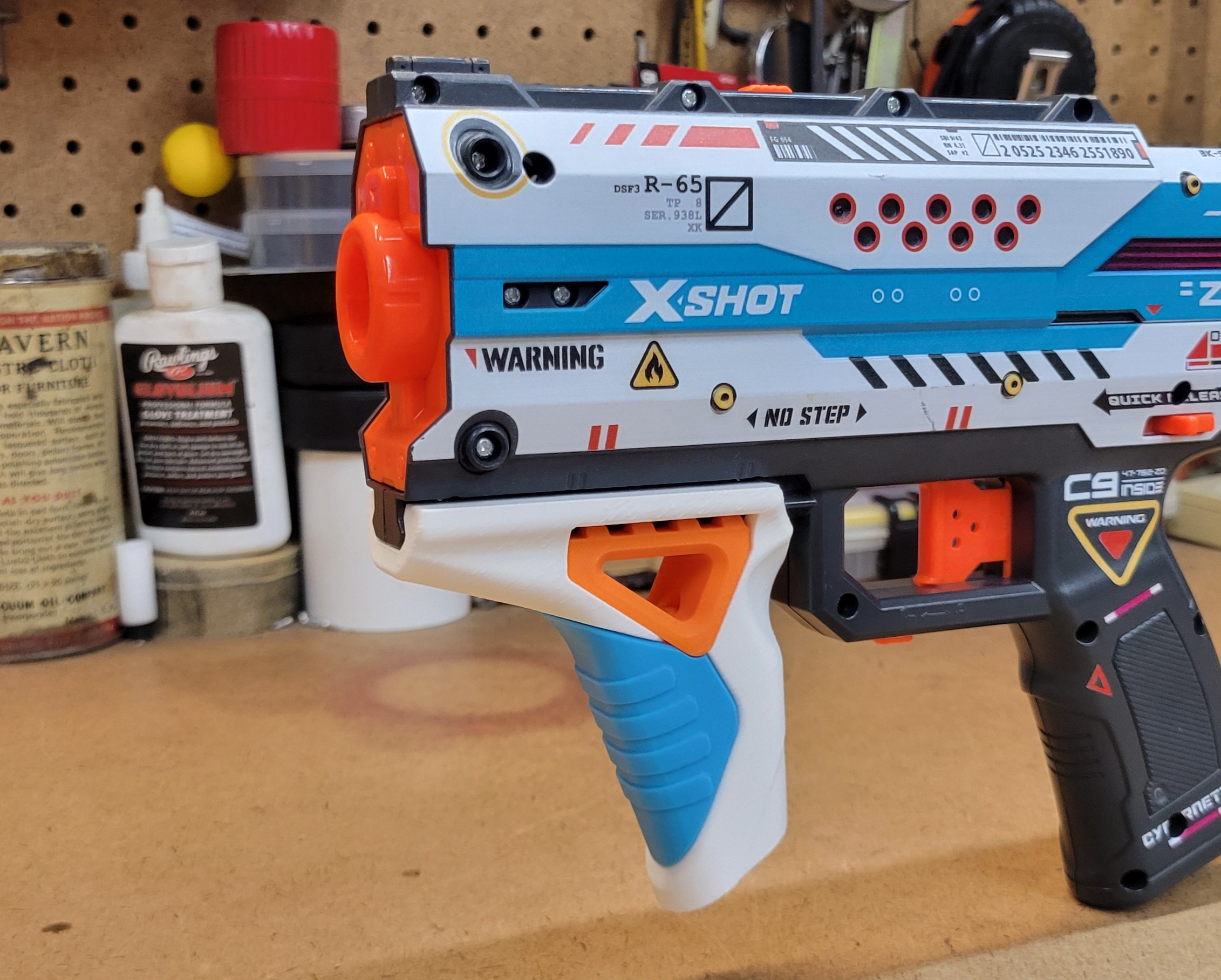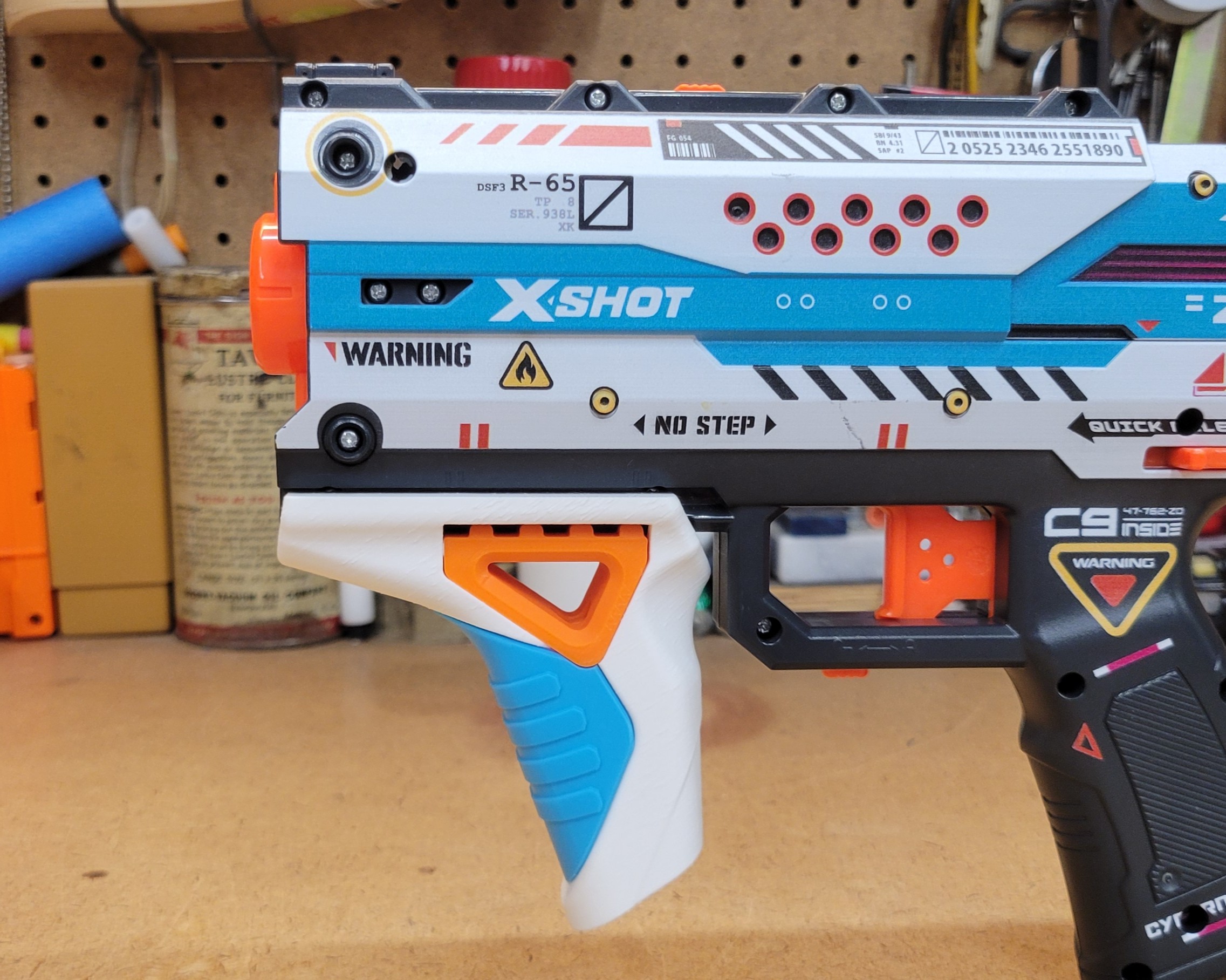 Một báng tay cầm góc cạnh theo chuẩn Picatinny, dễ in và dễ lắp ráp, không cần ốc vít và chỉ cần ít vật liệu hỗ trợ. Thiết kế này lấy cảm hứng từ các mẫu trước đó và mang lại cảm giác cầm nắm tốt, đặc biệt trên X-SHOT Pro Fury-X.