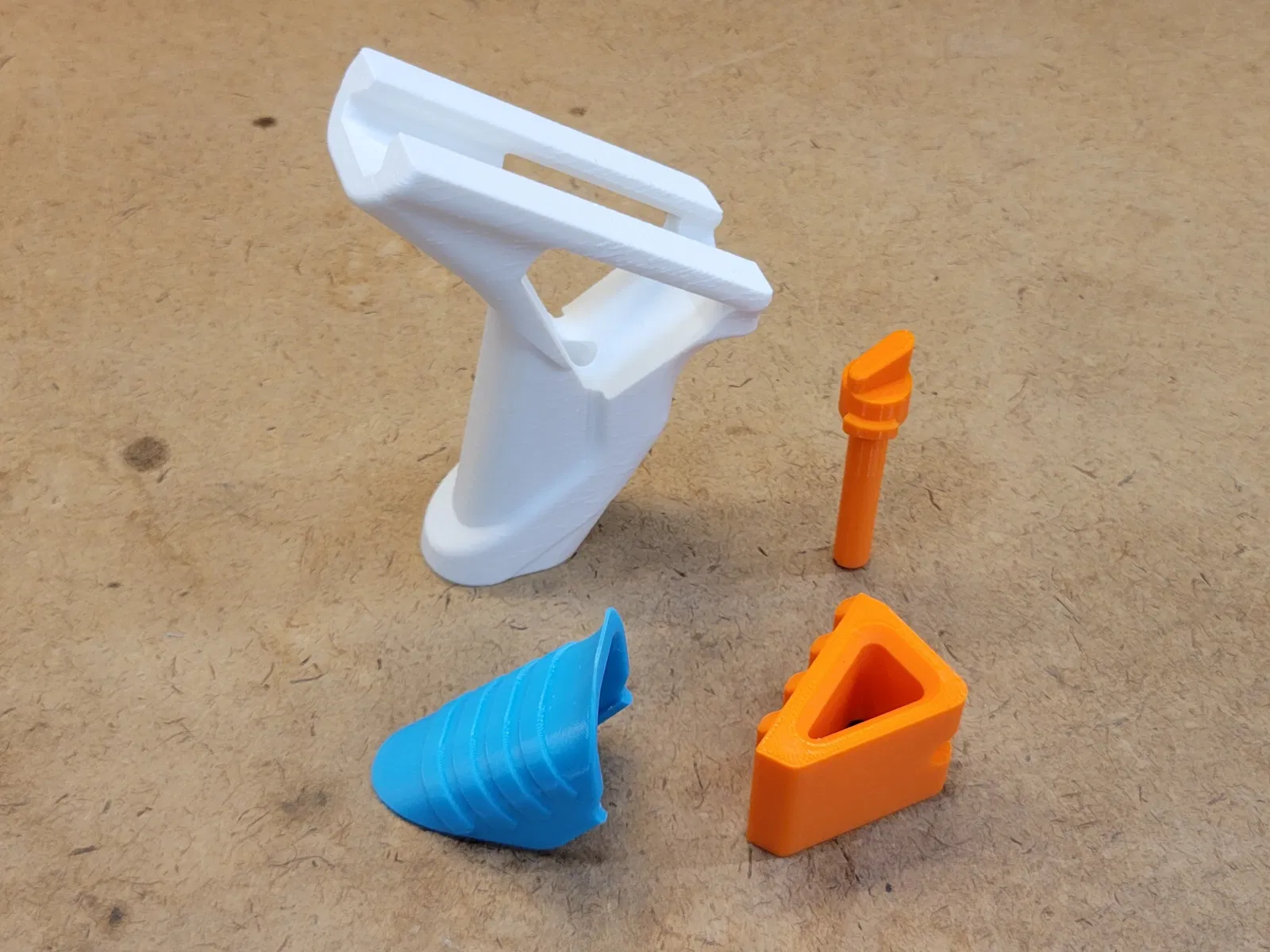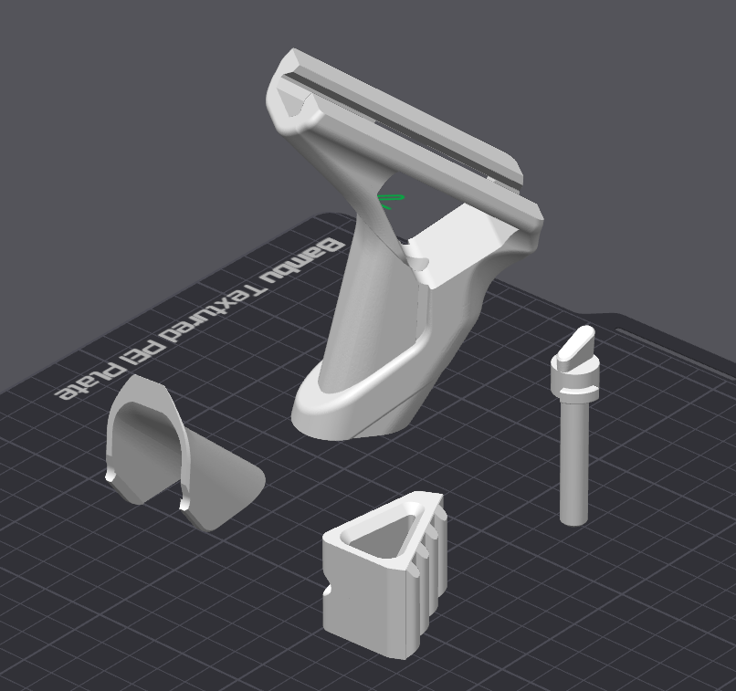 Cái báng tay cầm này gồm bốn bộ phận in ra và không cần bất kỳ ốc vít hay bu lông nào để gắn vào blaster của bạn. Cái miếng khóa là bộ phận duy nhất cần vật liệu hỗ trợ, và tui đề xuất hướng in như hình dưới đây để có kết quả tốt nhất về độ bền và bề mặt.