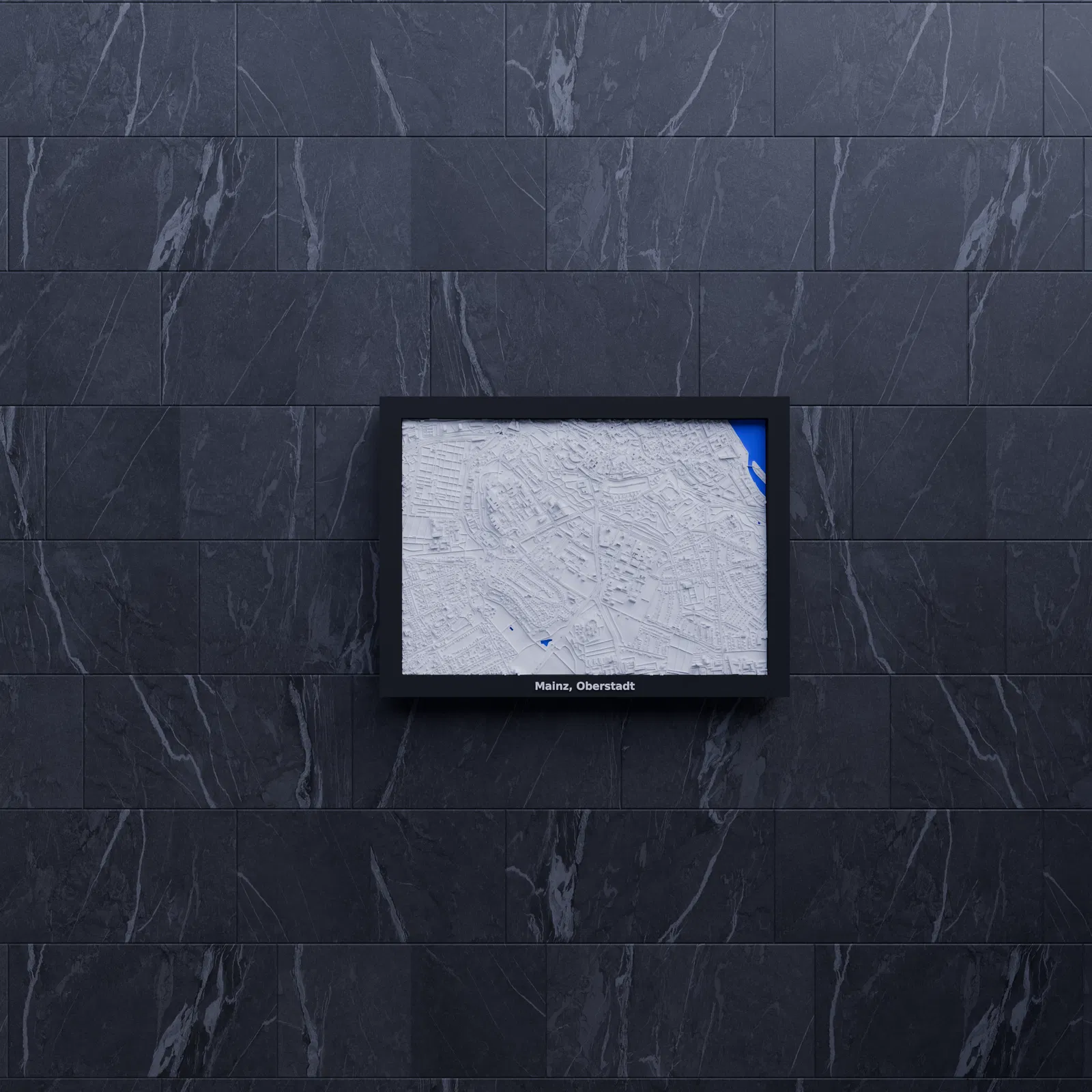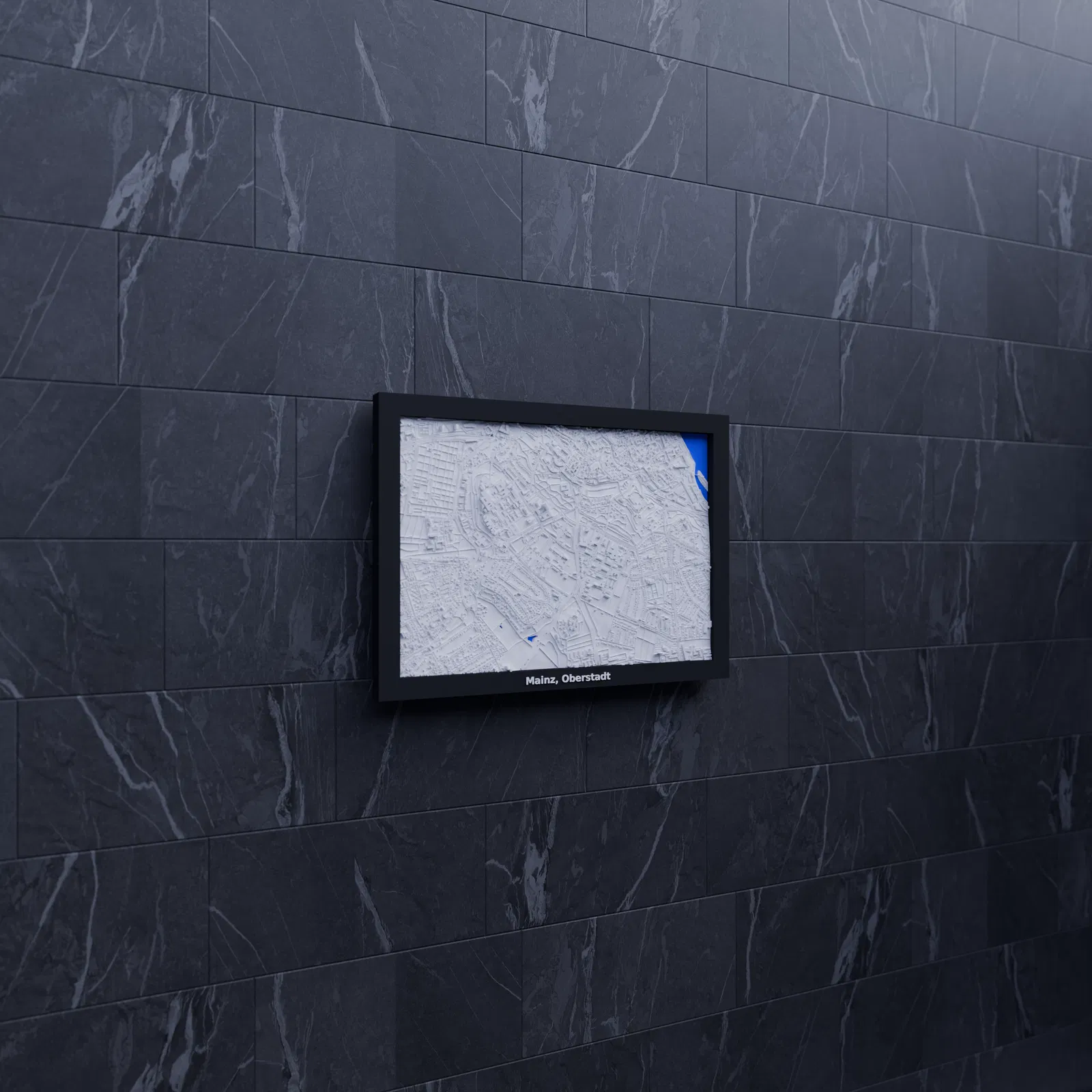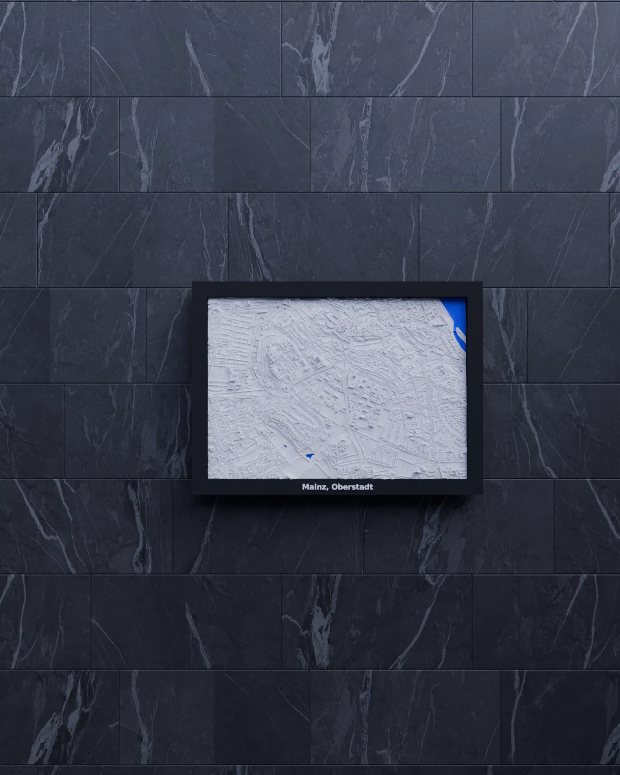 Mô hình địa hình 3D in được của Mainz, Oberstadt, Đức. Mô hình thu nhỏ này tái hiện cảnh quan địa lý với kích thước 170,5 mm x 119,5 mm, tỷ lệ ~16535:1. Lý tưởng để trang trí hoặc giáo dục.