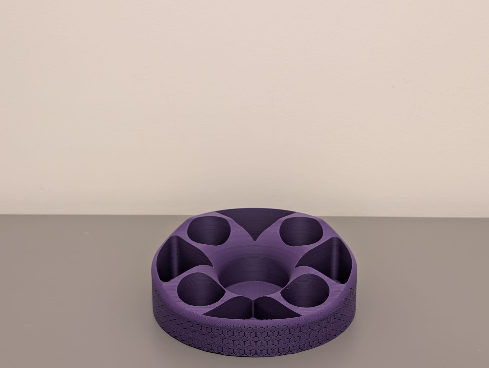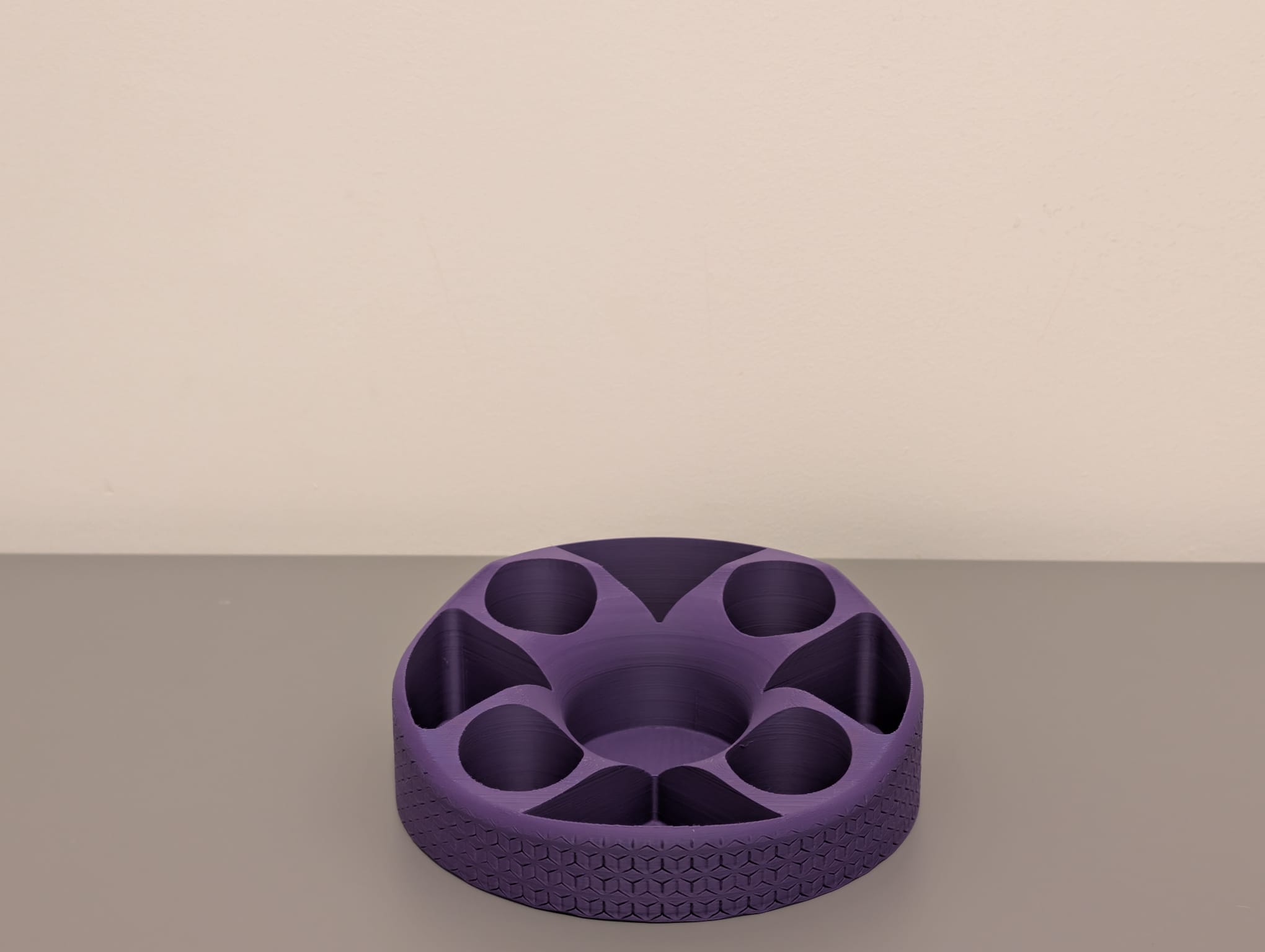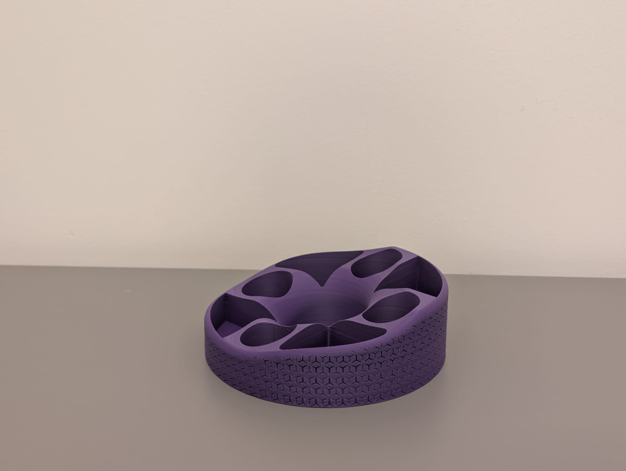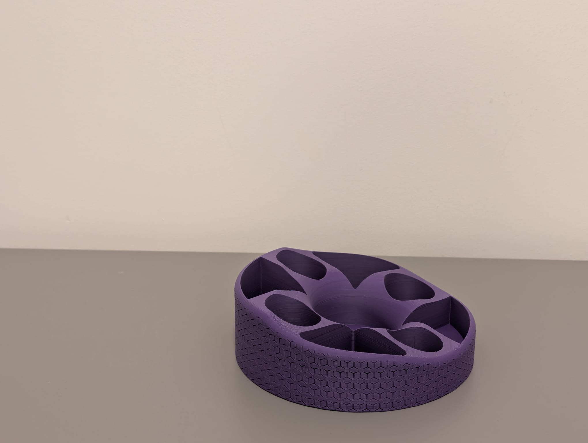 Cái kệ đựng đồ để bàn in 3D độc đáo này có thiết kế đơn sắc mạnh mẽ tông màu tím đậm, kết hợp hoàn hảo giữa tính năng và nghệ thuật đương đại. Cấu trúc của nó bao gồm một phần trên có hình dáng hữu cơ, với nhiều ngăn không đối xứng, thành trơn nhẵn, hoàn hảo để sắp xếp các vật dụng văn phòng phẩm khác nhau, đặt trên một chân đế hình trụ tương phản được bao phủ bởi một hoa văn lặp lại tinh tế.