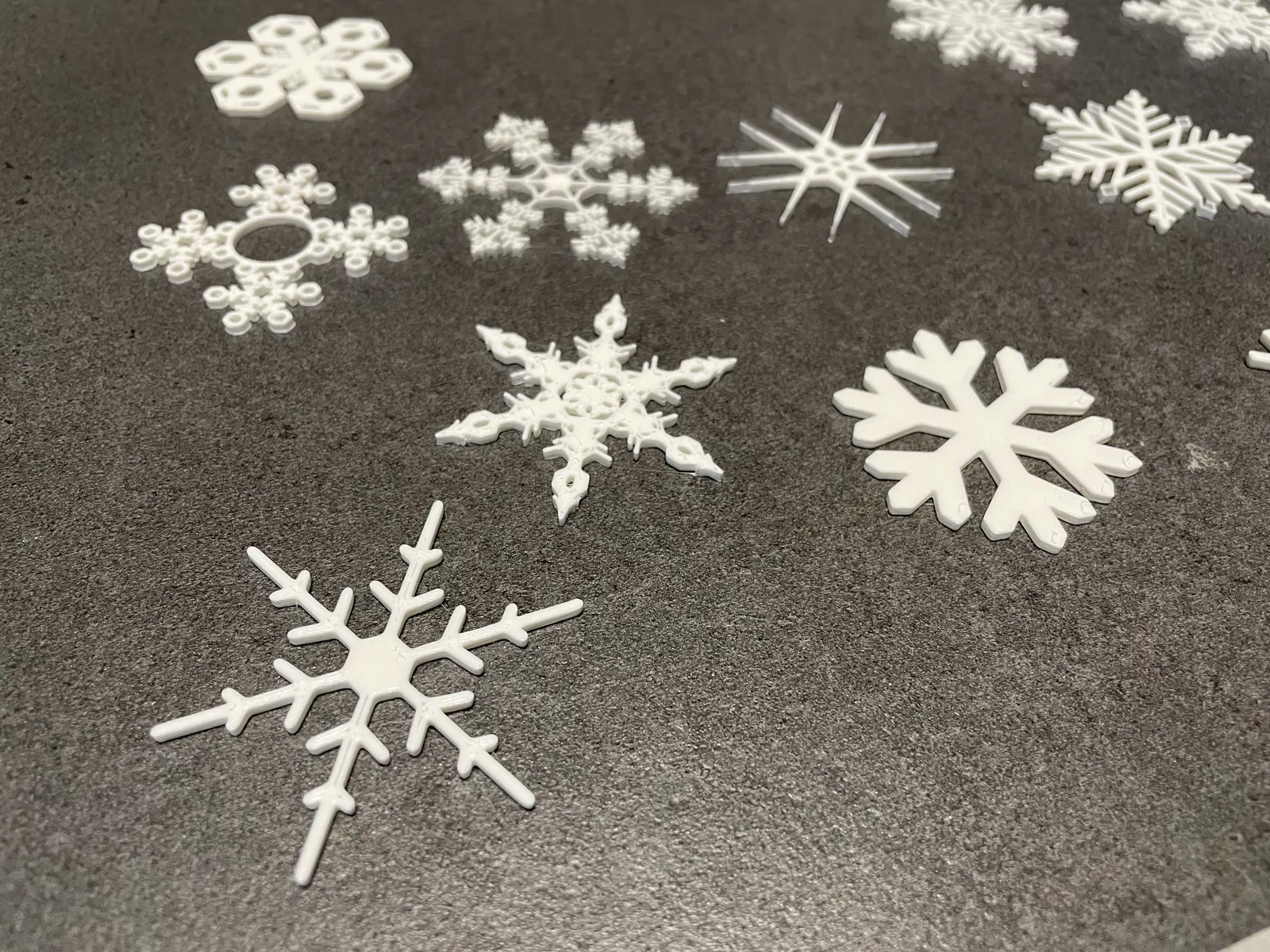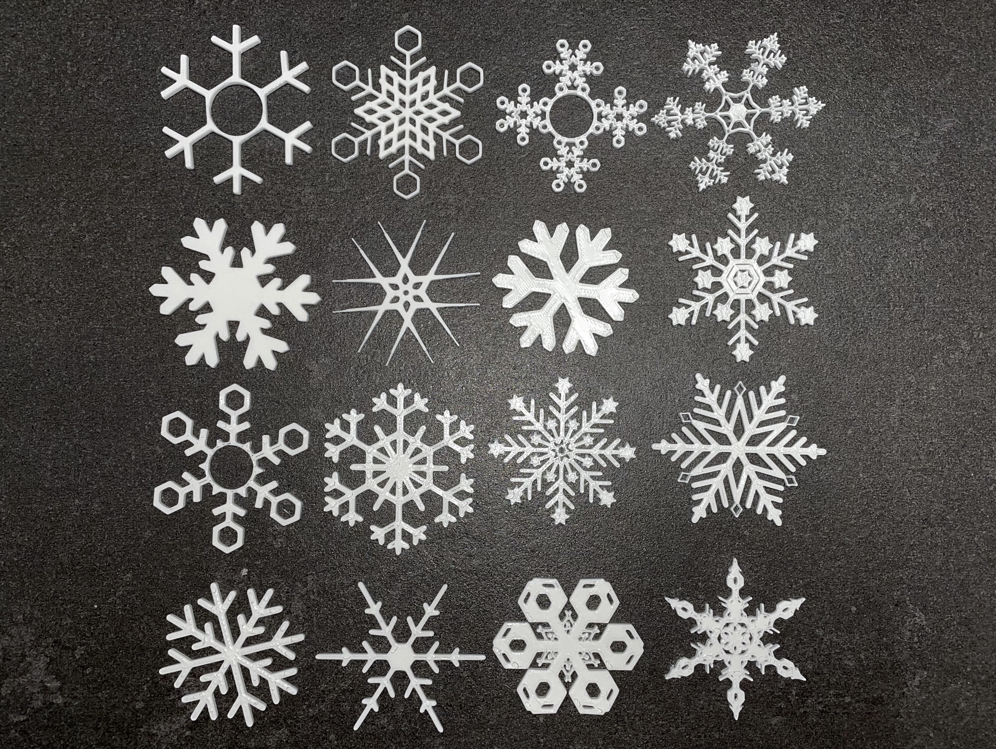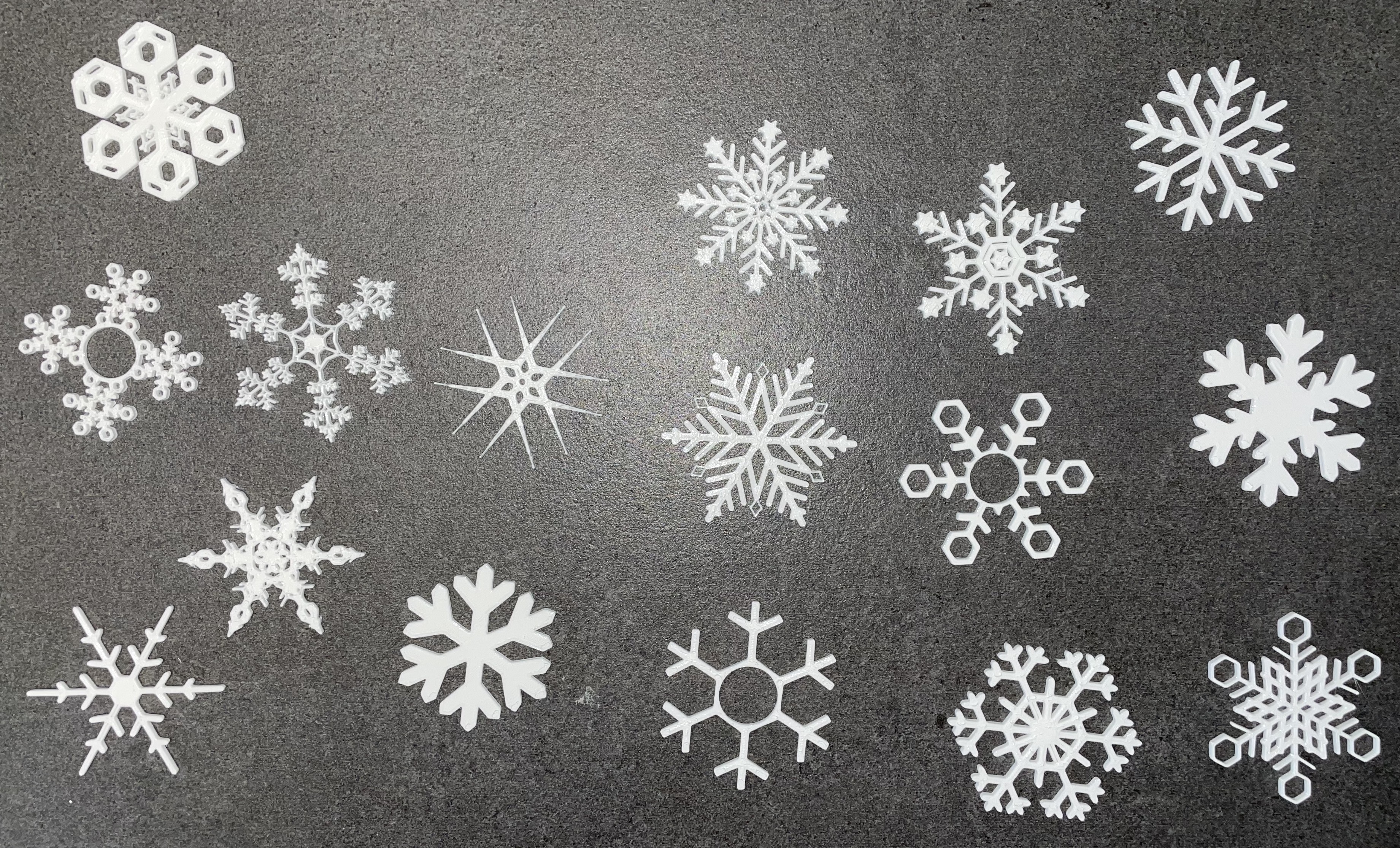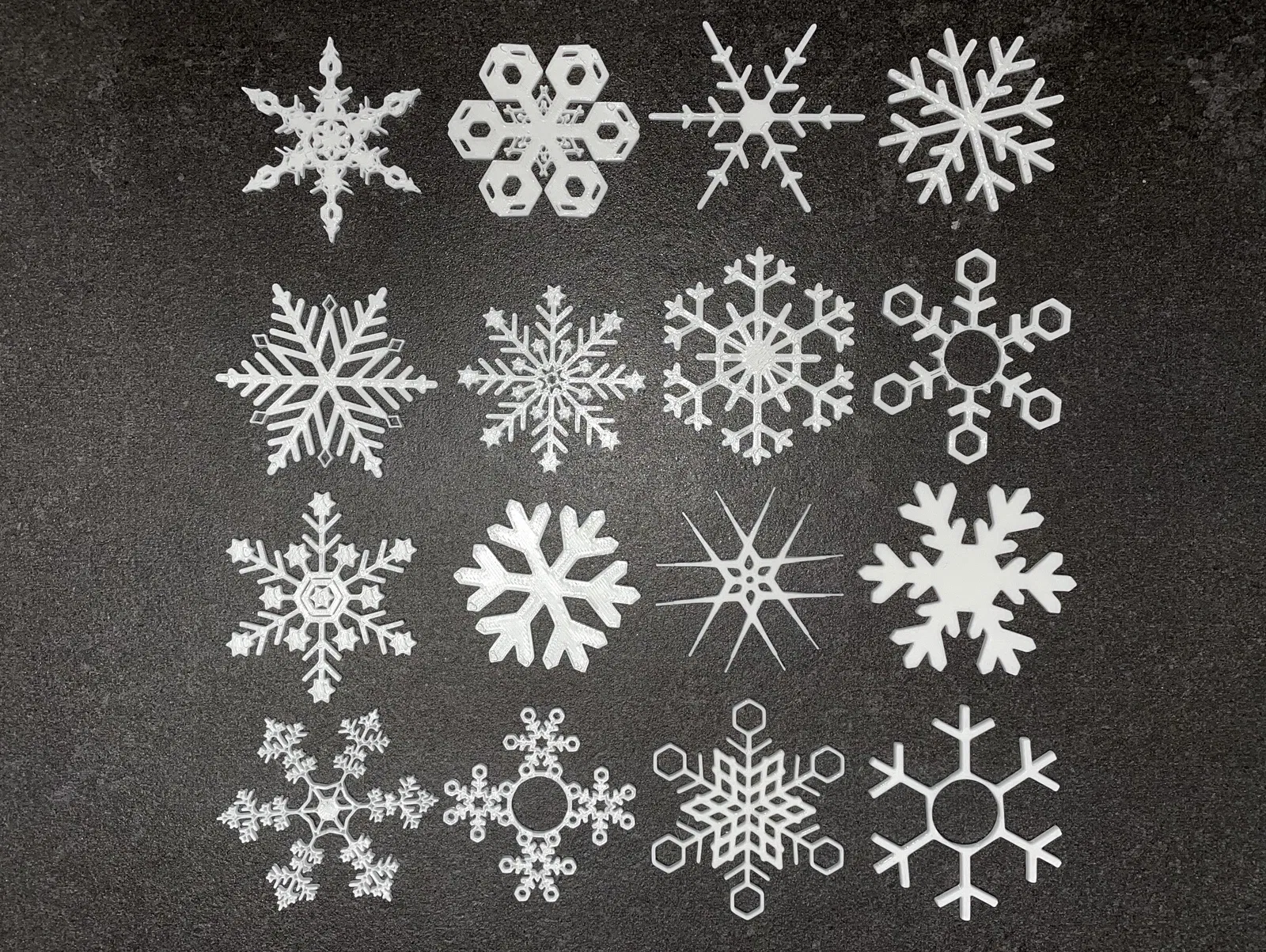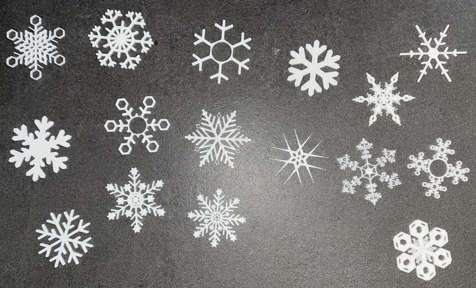 Bộ sưu tập 18 bông tuyết độc đáo, kích thước khoảng 50x50x2mm, hoàn hảo để trang trí cây thông Noel, cửa sổ, quà tặng hoặc bàn tiệc. In bằng PLA, không cần hỗ trợ.