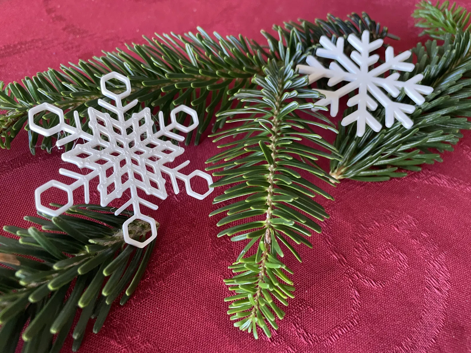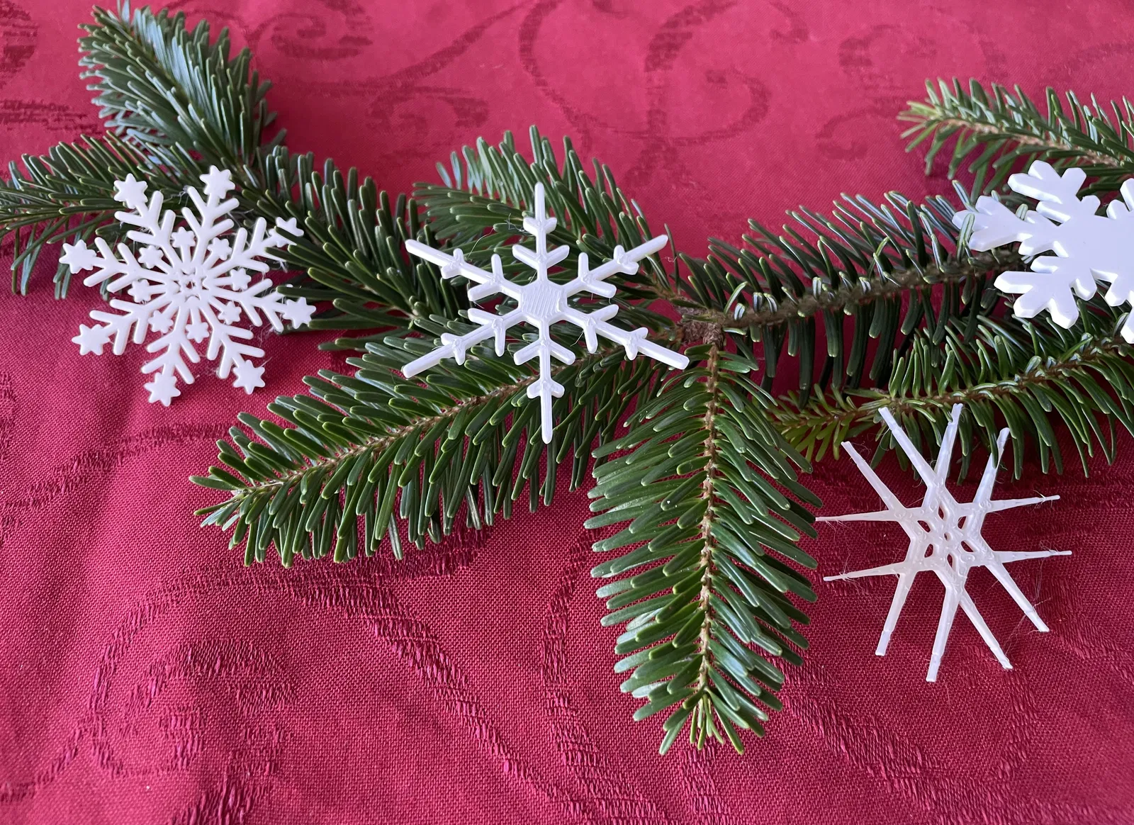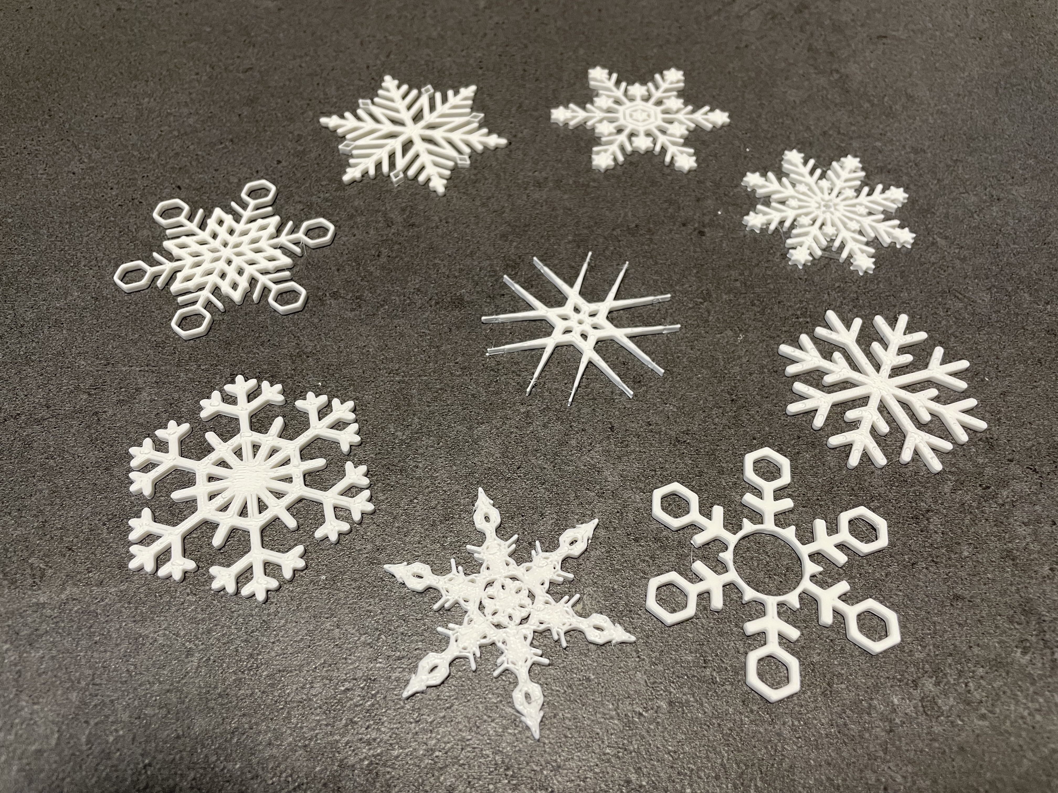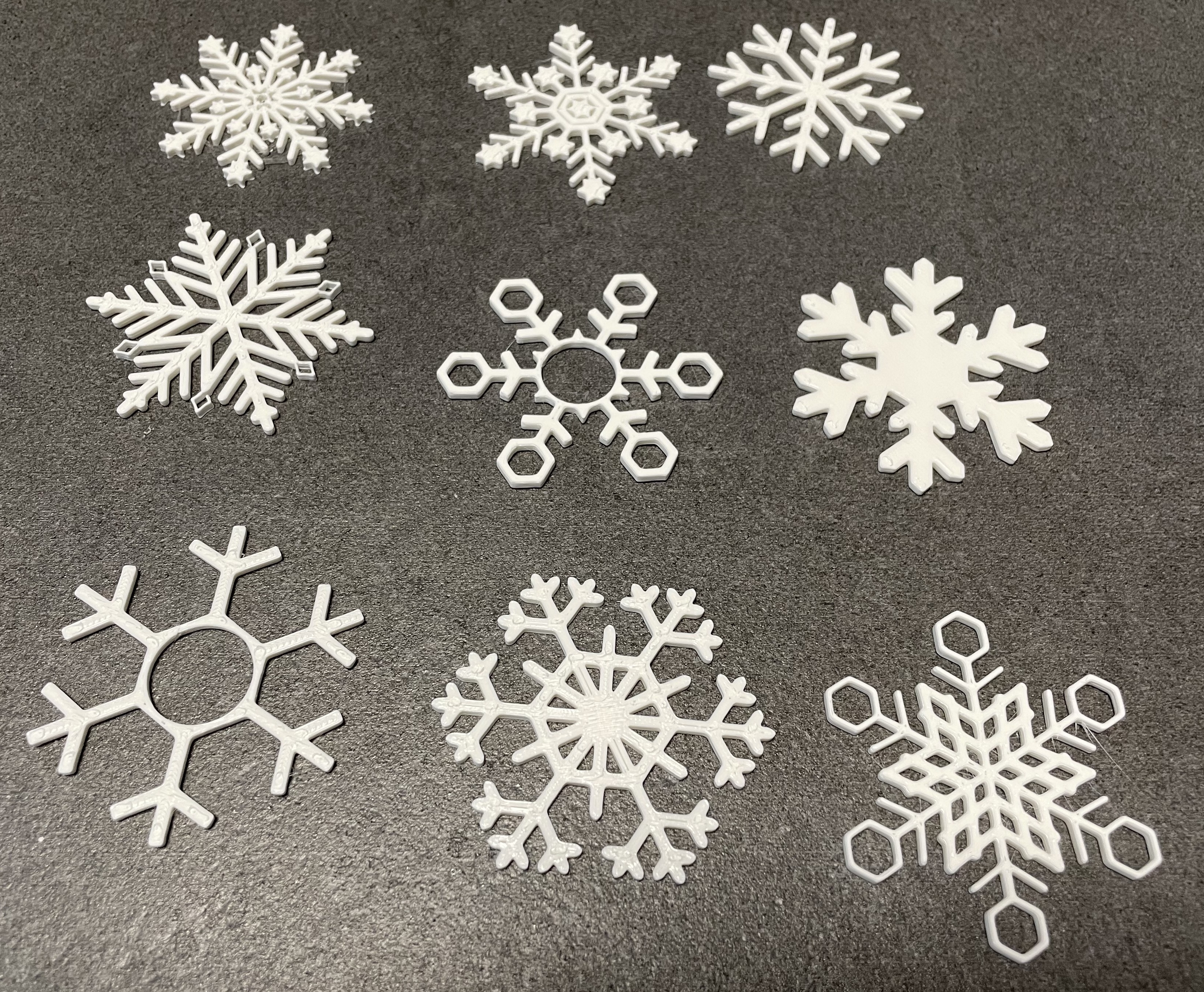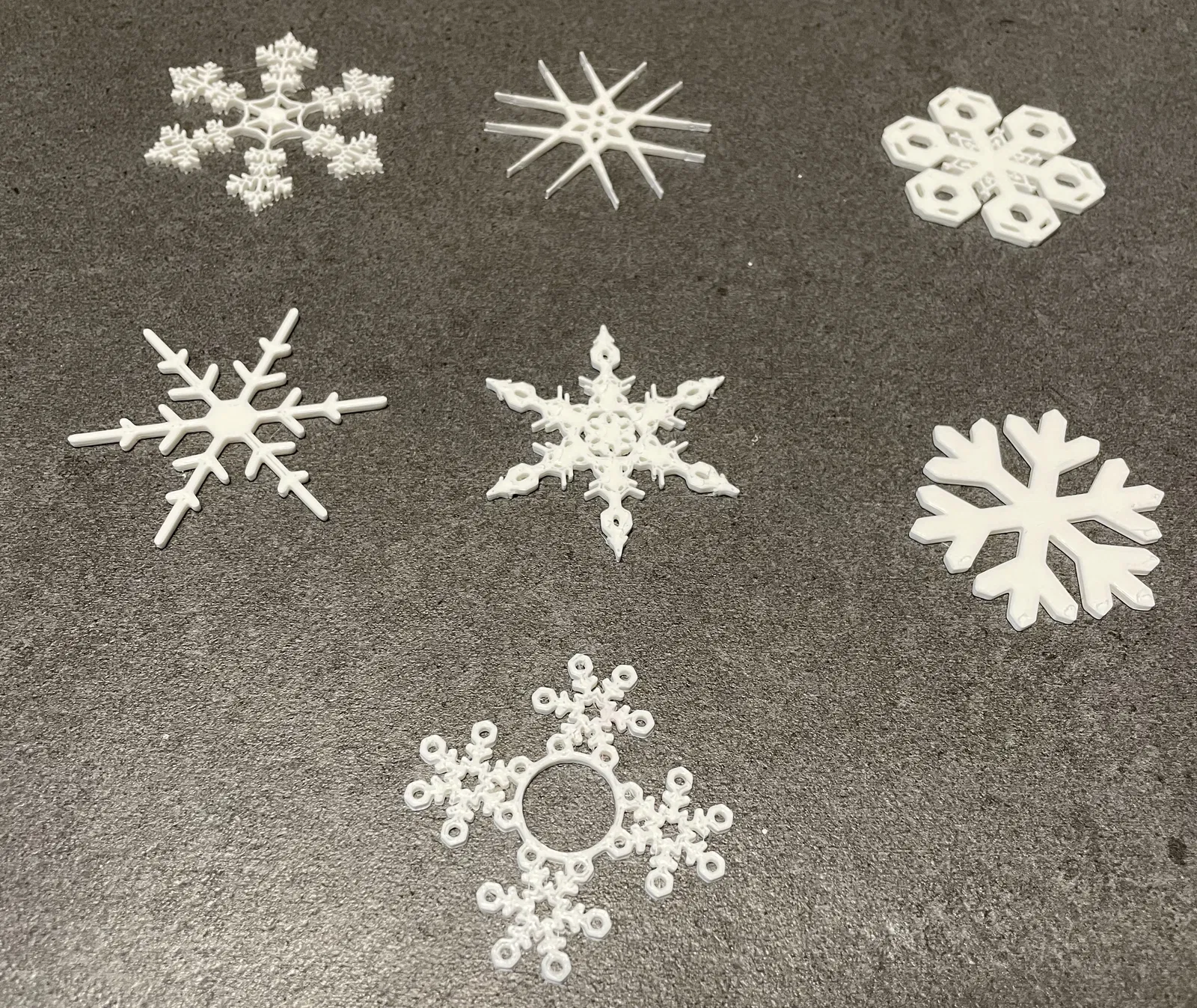 Bộ sưu tập 18 bông tuyết độc đáo, kích thước khoảng 50x50x2mm, hoàn hảo để trang trí cây thông Noel, cửa sổ, quà tặng hoặc bàn tiệc. In bằng PLA, không cần hỗ trợ.