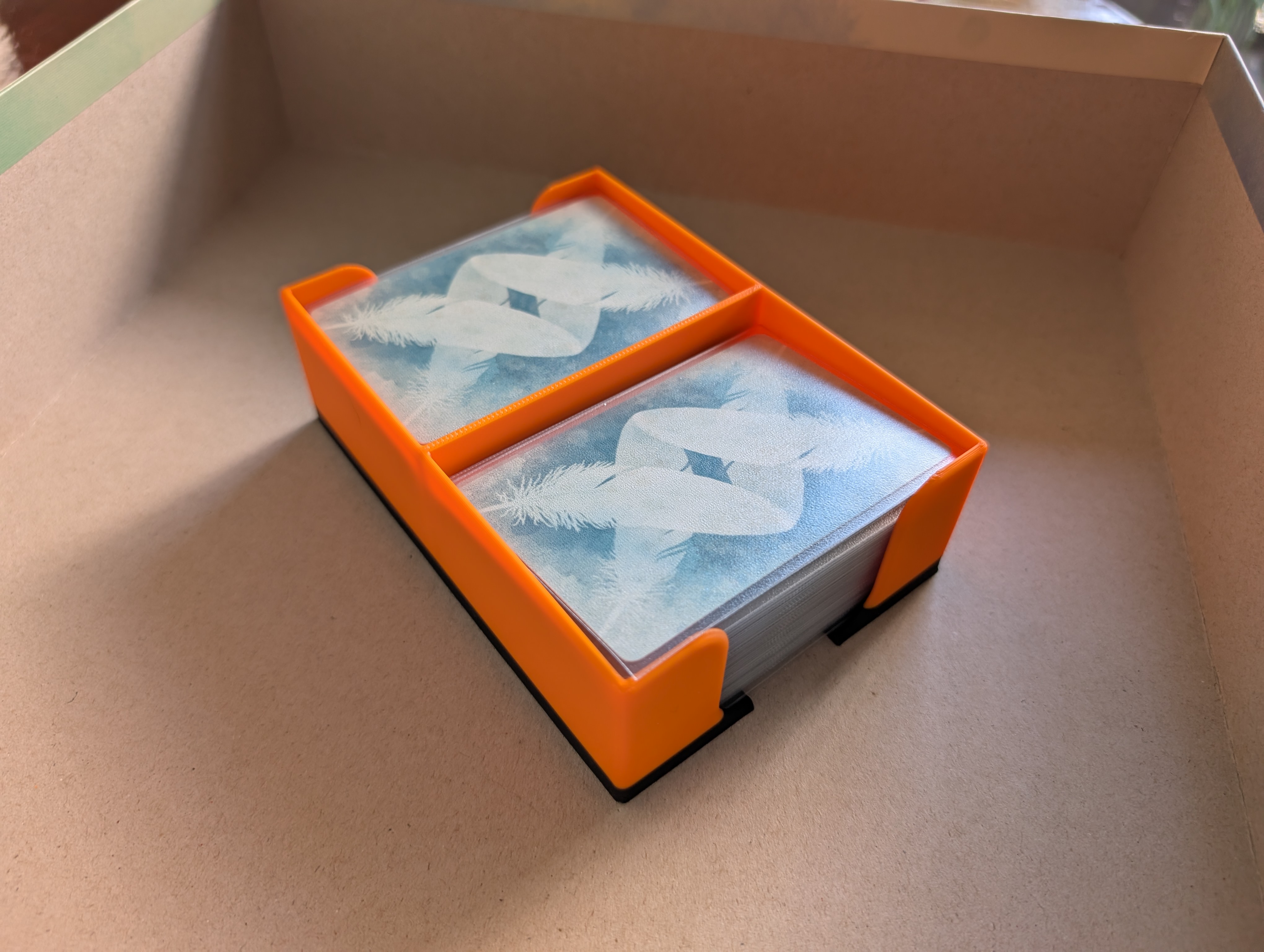 Tui đã dựng cái khay đựng thẻ này trên onShape, chỉnh lại cho vừa với thẻ Dragonshield có bọc sleeve và thêm cái lỗ khoét để dễ rút thẻ ra hơn.