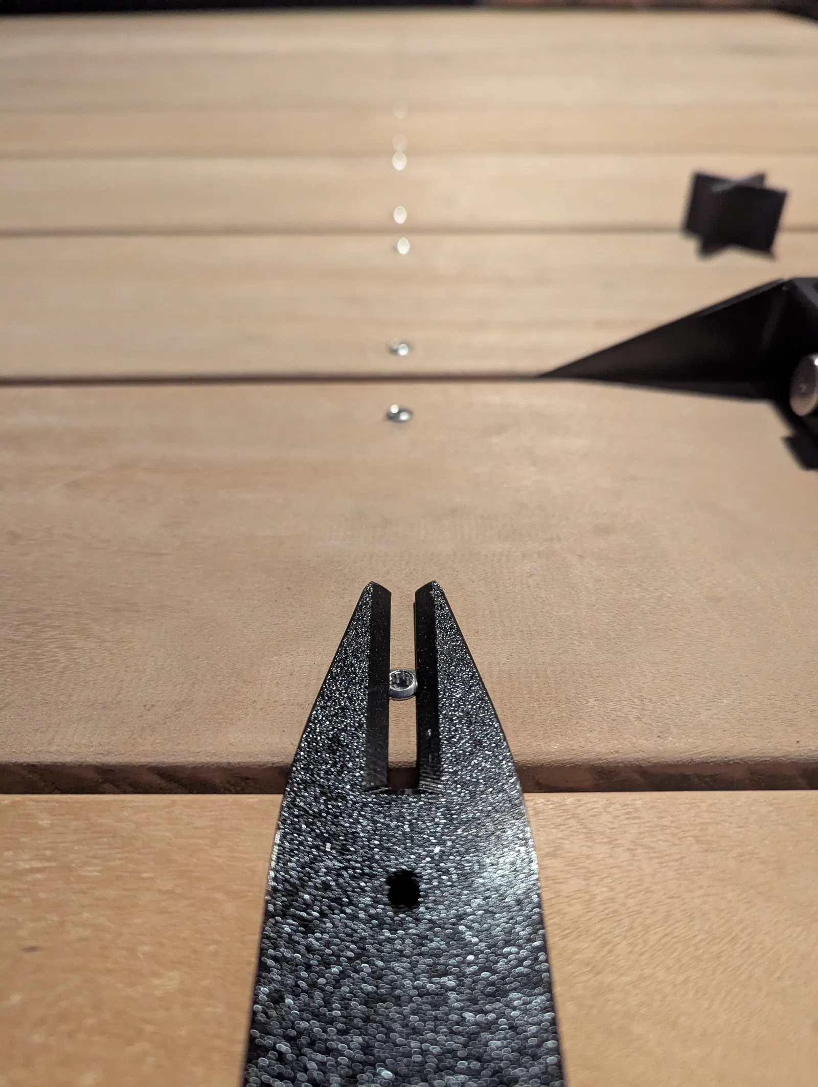 Cái khuôn khoan này được thiết kế để tối ưu hóa việc lắp đặt sàn gỗ ngoài trời. Dụng cụ có một đầu dạng ngạnh có khe hở, có thể lồng vào đầu của con vít đã được lắp trước đó trong khoảng trống giữa các ván. Điểm tham chiếu vật lý này đảm bảo các lỗ mồi tiếp theo được khoan thẳng hàng hoàn hảo với hàng trước đó, tạo ra một bề mặt hoàn thiện sạch sẽ và chuyên nghiệp trên toàn bộ sàn.