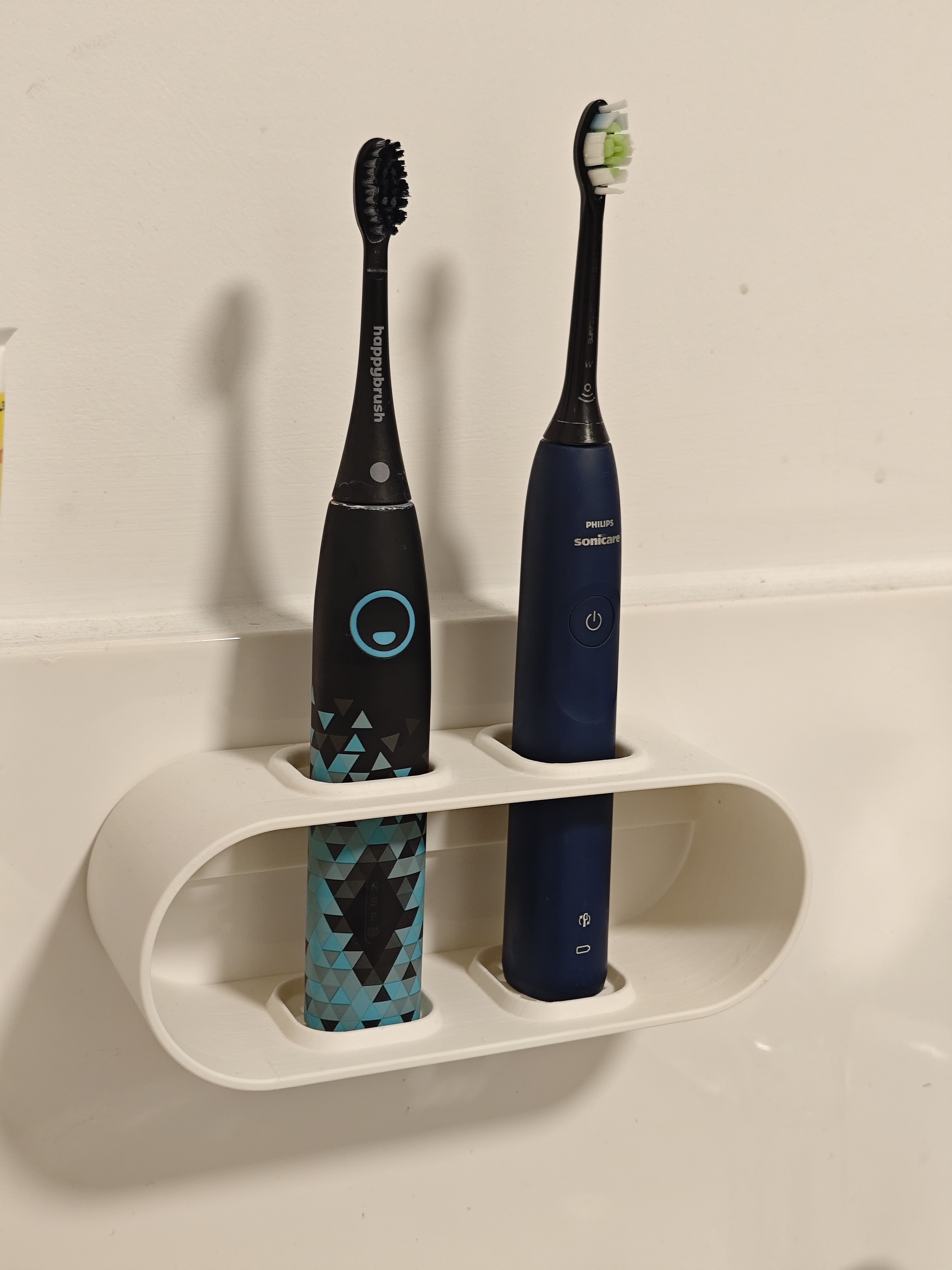Giá đỡ bàn chải đánh răng điện, thiết kế để đựng vừa một bàn chải Phillips Sonicare và một bàn chải happybrush. Có thể cần dùng vật liệu hỗ trợ do cấu trúc cầu dài của khe cắm happybrush.