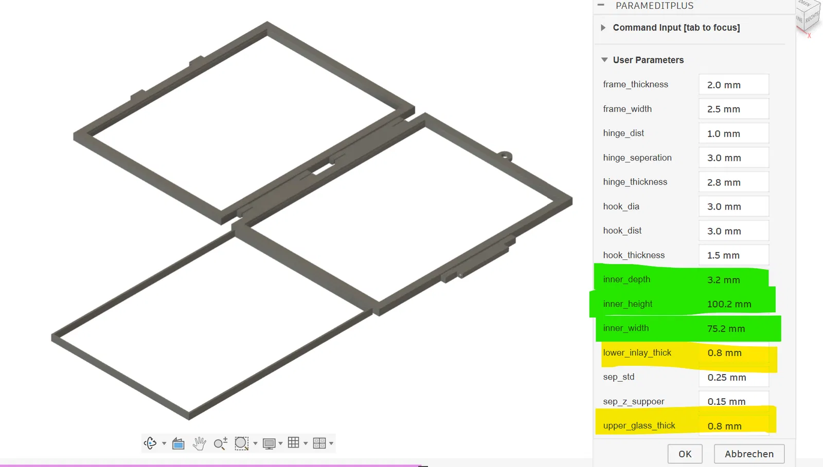 Chỉnh sửa các thông số cho phù hợp với nhu cầu của bạn. Tuy nhiên, tốt nhất là bạn chỉ nên chỉnh các thông số màu xanh (kích thước bên trong) và độ dày của mặt kính phía trước hoặc lớp lót phía sau (màu vàng).