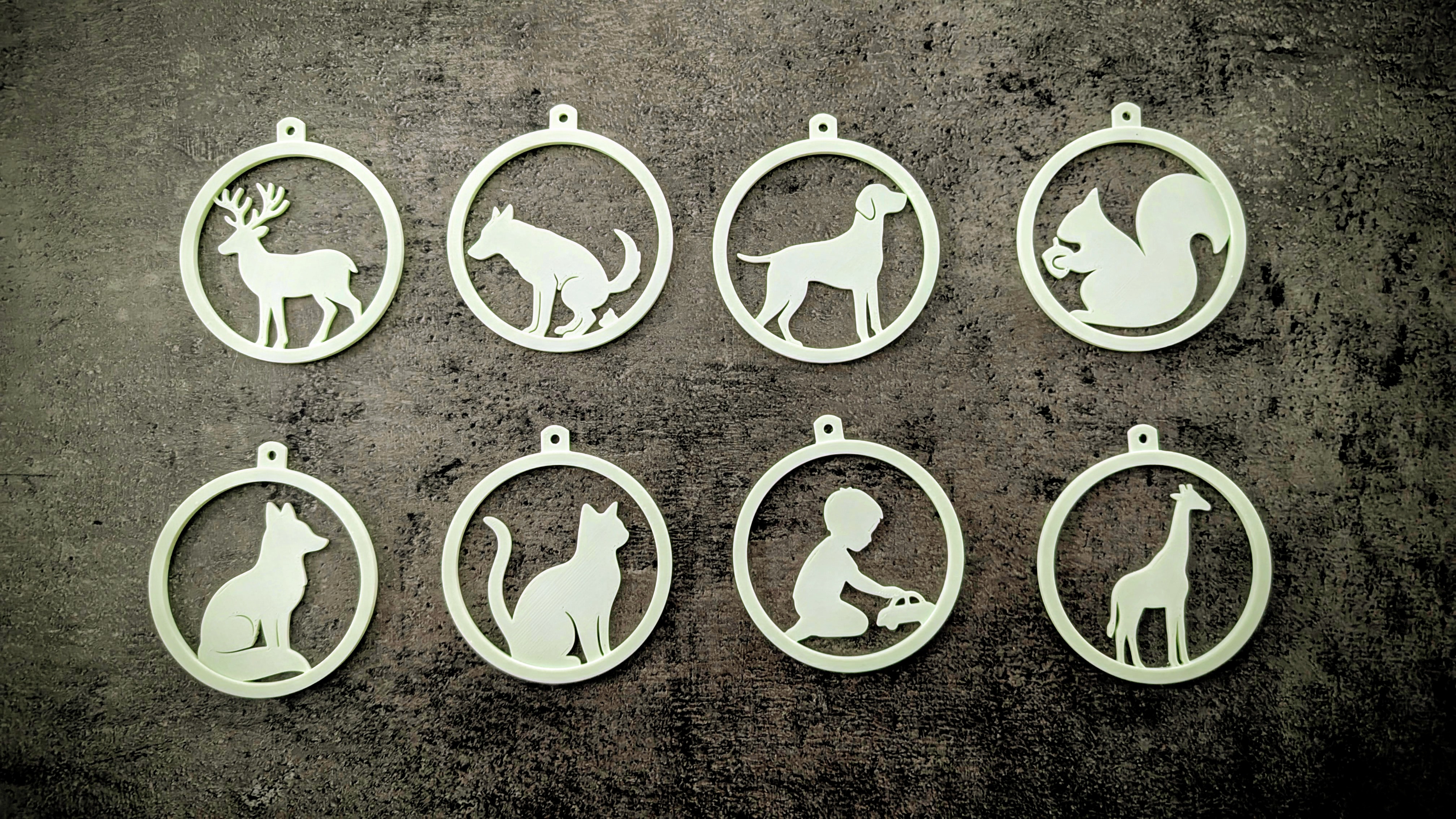 Những món đồ trang trí Giáng sinh phẳng, thiết kế để treo lên cây thông. Bộ sưu tập gồm nhiều con vật dễ thương như sóc, mèo, hươu, nai, cáo, chó, cùng với hình ảnh cậu bé chơi xe hơi và chú chó đặc biệt.