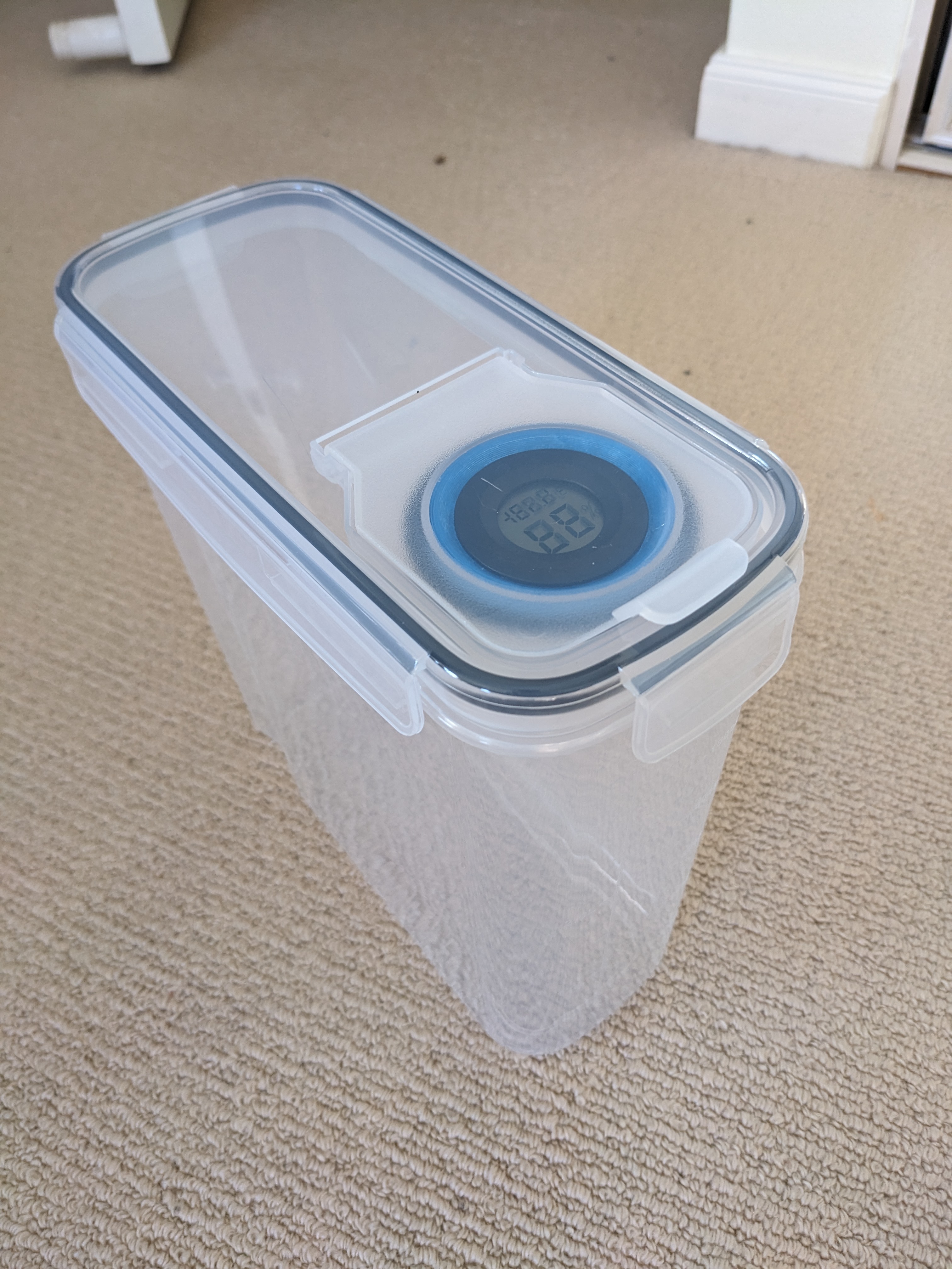 Giá đỡ máy đo độ ẩm cho hộp chống ẩm filament. Hộp chống ẩm filament là một hộp ngũ cốc mua trên Amazon - hộp ngũ cốc này có nhiều tên thương hiệu khác nhau, nhưng cái tôi có là ở đây: https://www.amazon.com.au/gp/product/B09WHXLRFF/ref=ewc_pr_img_1?smid=A25MCKE4999ECM&psc=1