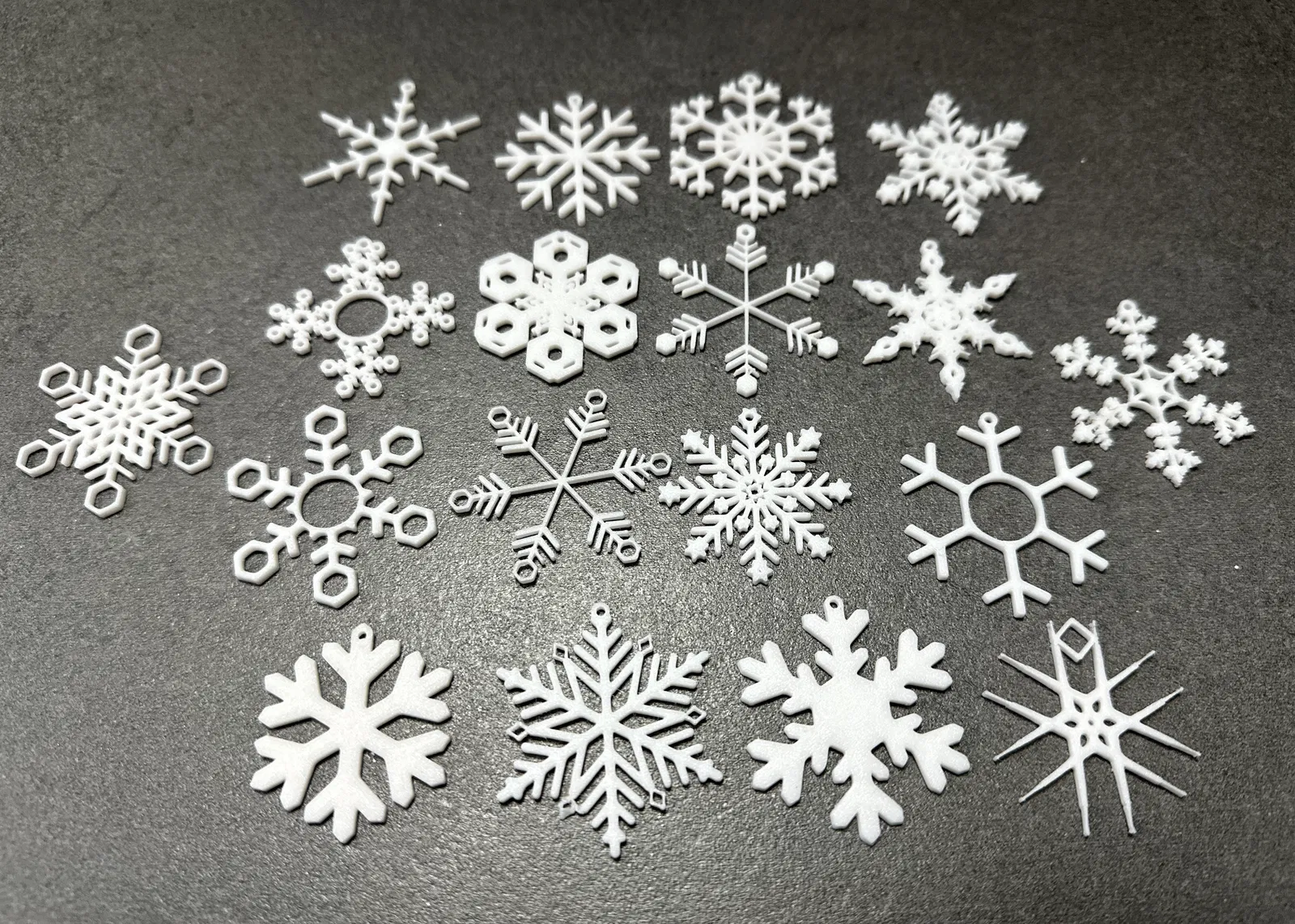 18 mẫu bông tuyết chi tiết với vòng treo nhỏ phía trên để dễ dàng treo lên cây thông Noel của bạn.