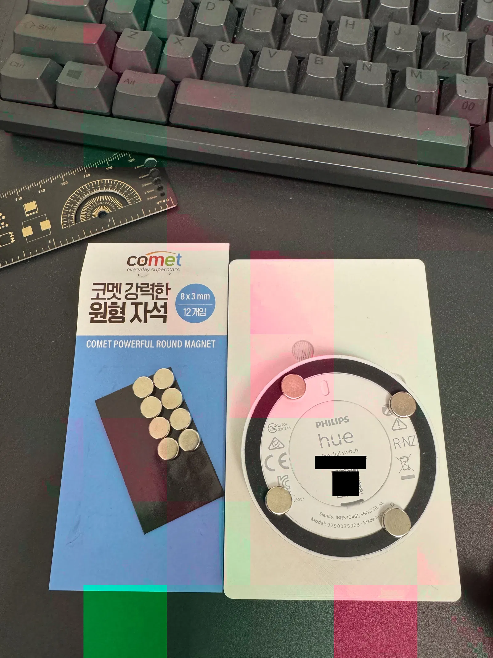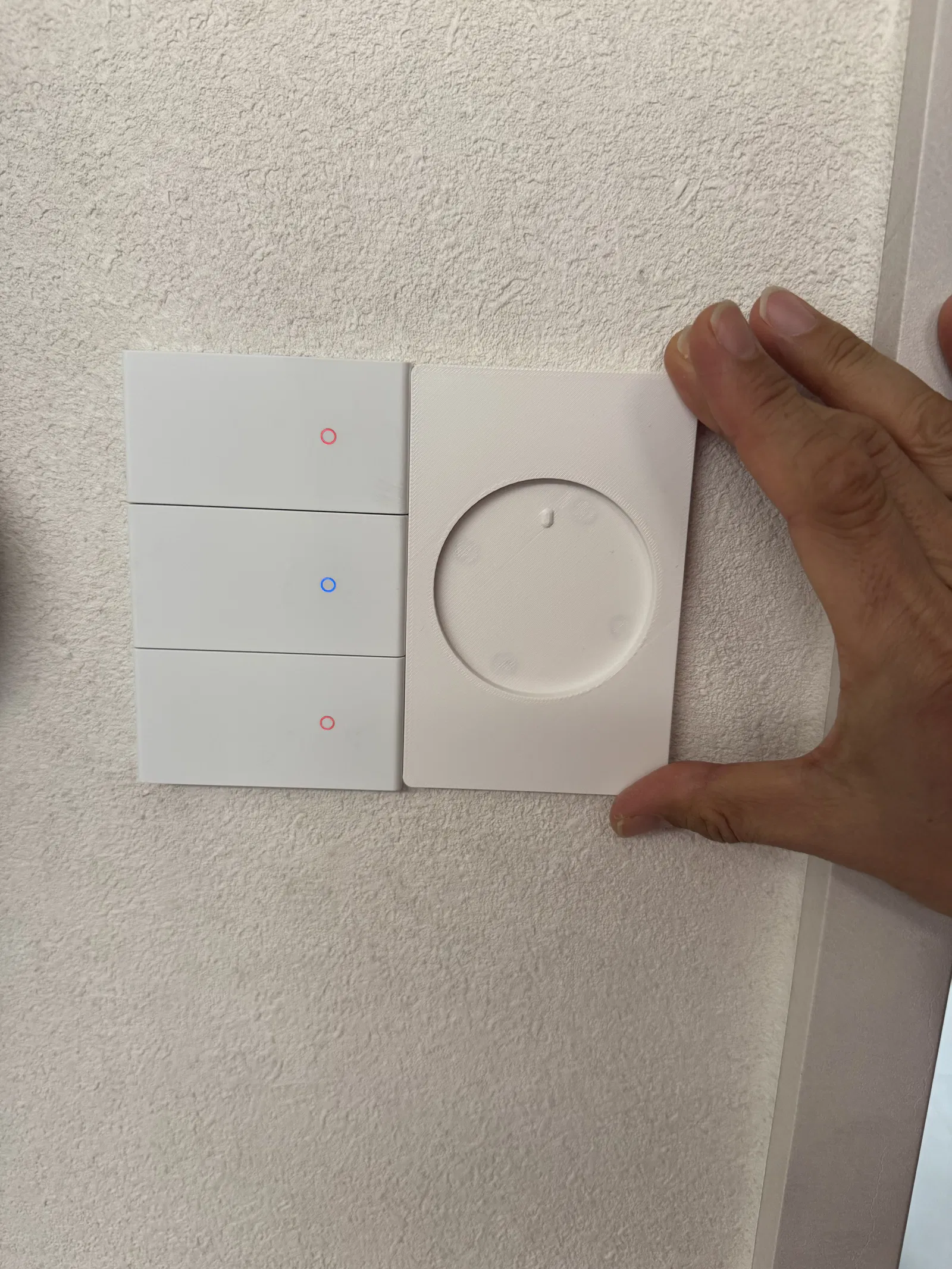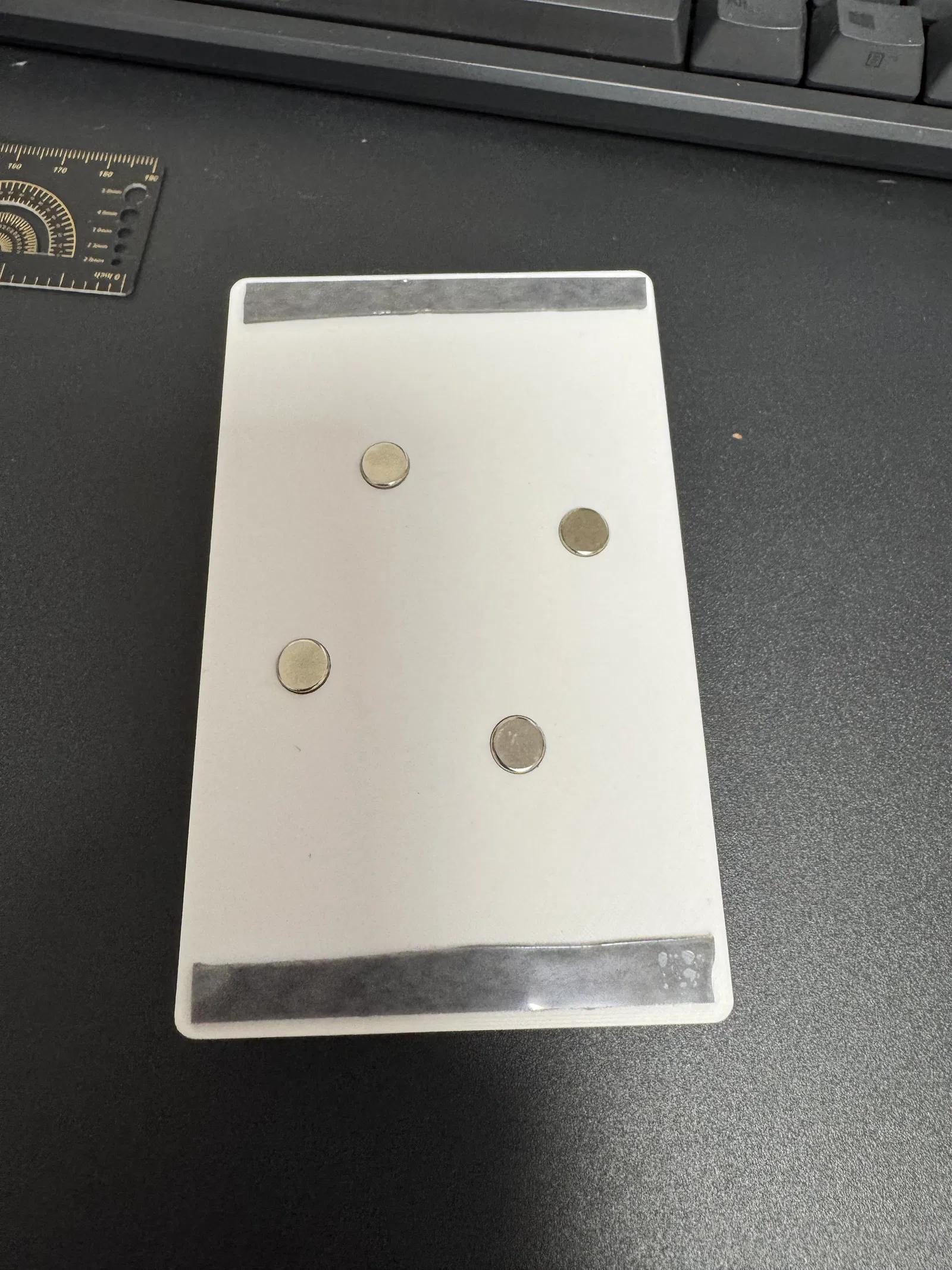 Kích thước mẫu là 117 x 75.5 x 7mm, cỡ bằng công tắc đèn Hàn Quốc thông thường. Nên dùng nam châm tròn đường kính 8mm, dày 2mm. Nam châm 8x3mm cũng được nếu bạn dùng băng keo dày.