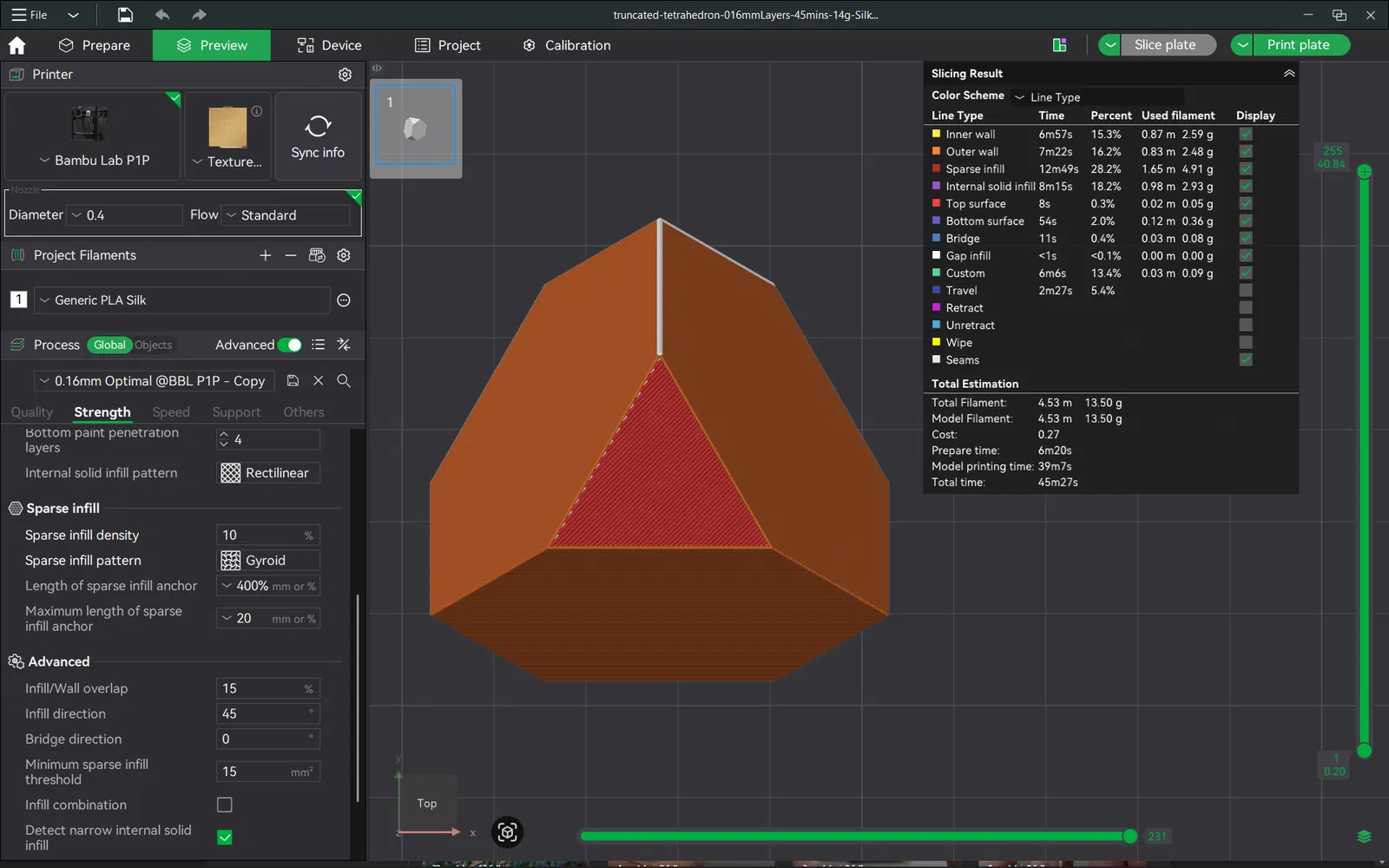 Đầu phun: 0.4 mm Chiều cao lớp: 0.16 mm với lớp đáy 0.2 mm Ruột: 10%, Gyroid Hỗ trợ: Không có