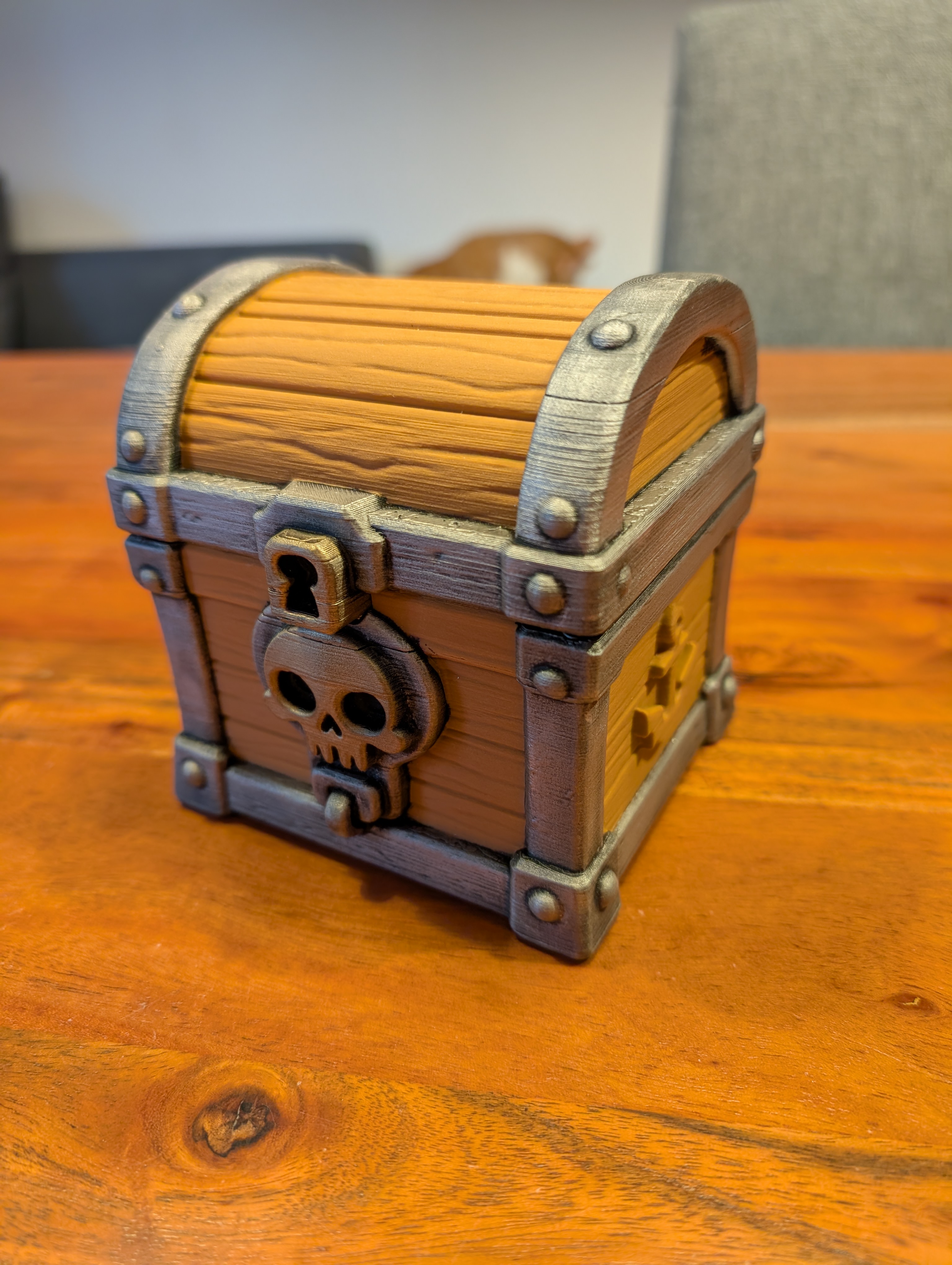 A lô, mấy huynh đệ! Đây là hộp đựng bài rương kho báu cướp biển, được chế tạo để chứa bộ bài commander hai lớp. Hộp dùng đinh làm bản lề và nam châm. In bằng PLA gỗ, sơn bạc & vàng. Cần supports để in.