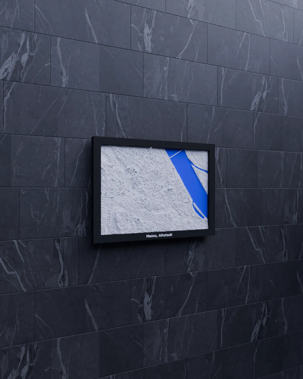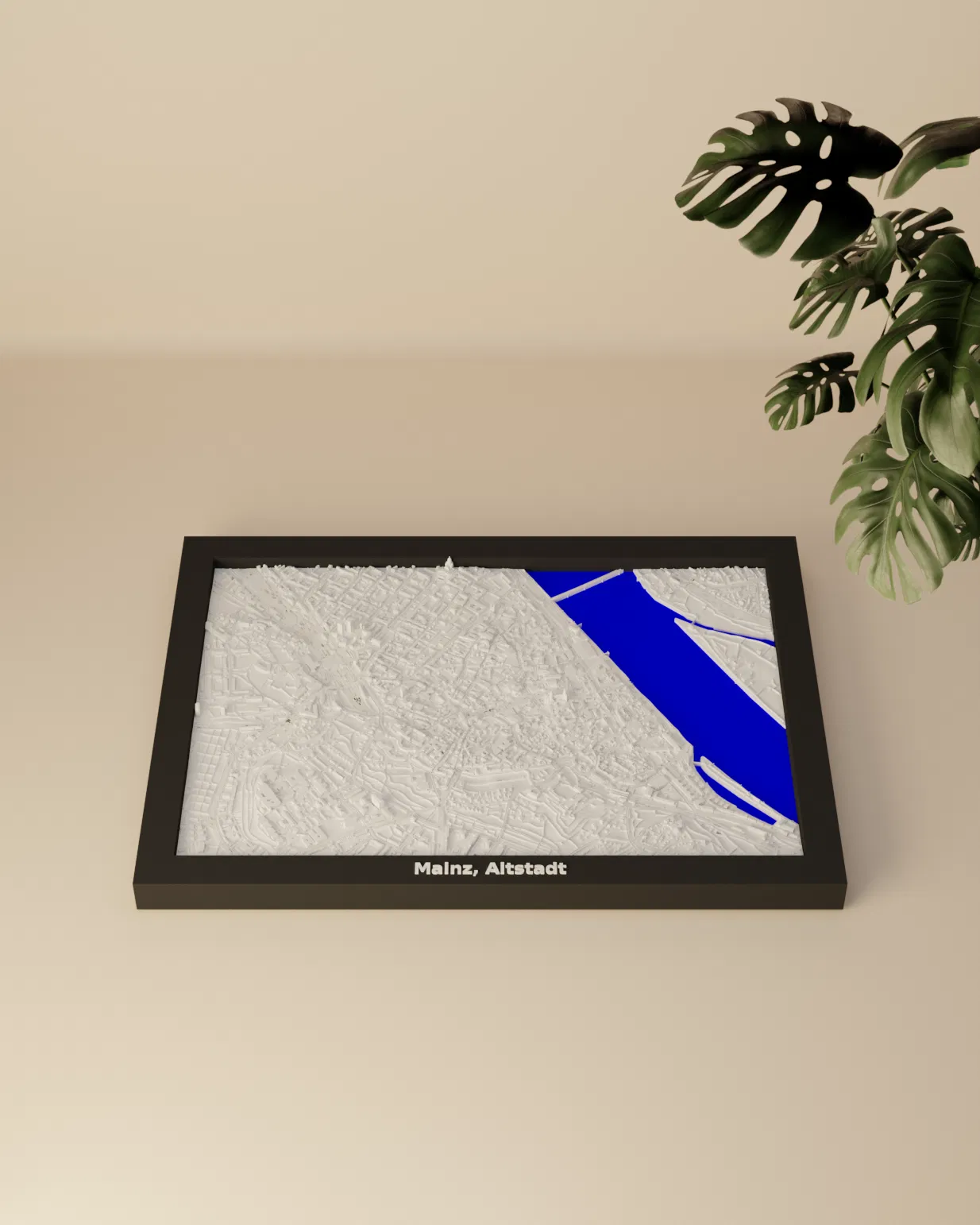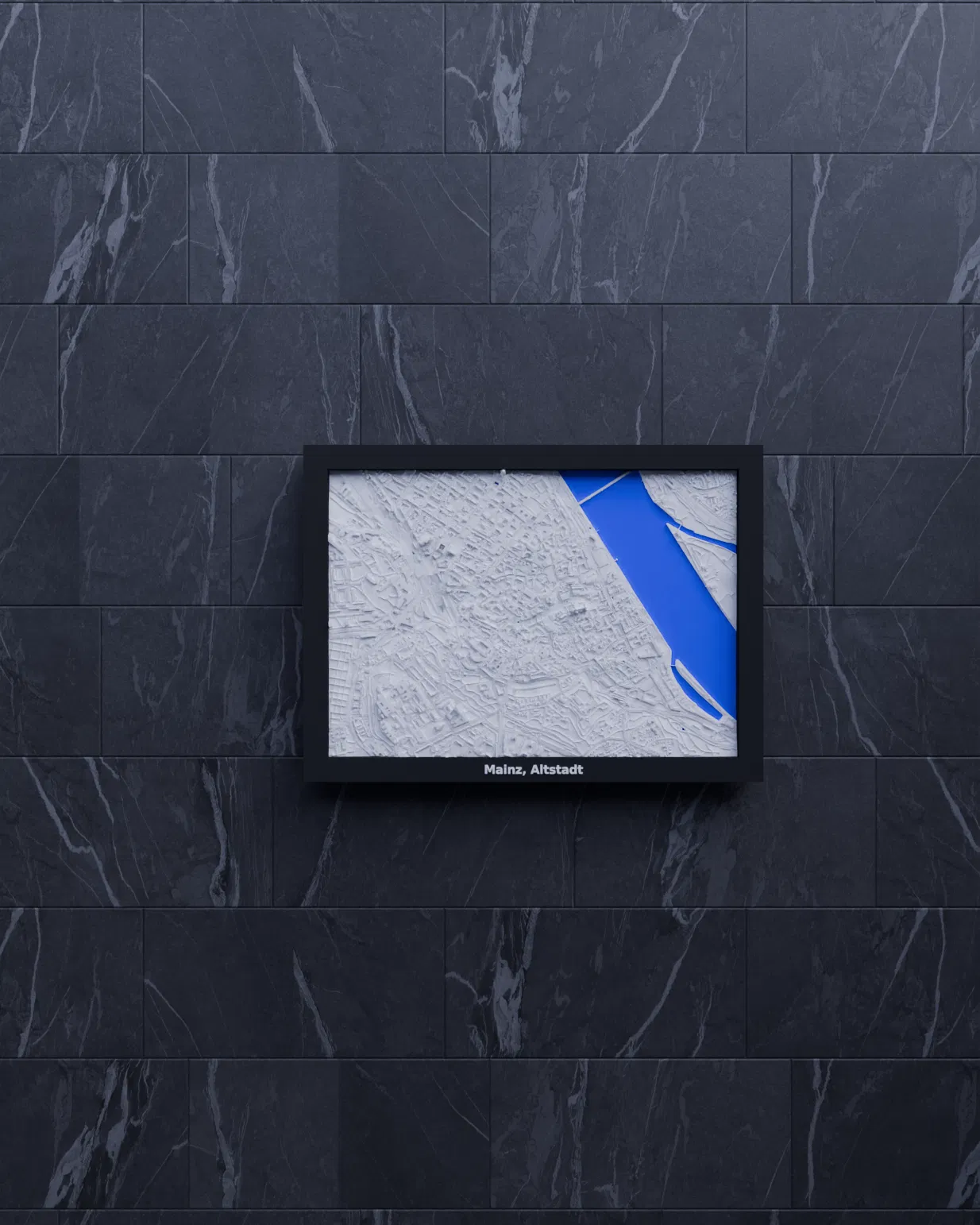 Lưu lại vẻ đẹp cảnh quan thành phố Mainz, Altstadt với mô hình địa hình thu nhỏ 3D có thể in. Kích thước thu nhỏ 170.5 mm x 119.5 mm, lý tưởng cho giáo dục, trang trí. Bao gồm nhiều tùy chọn khung in.