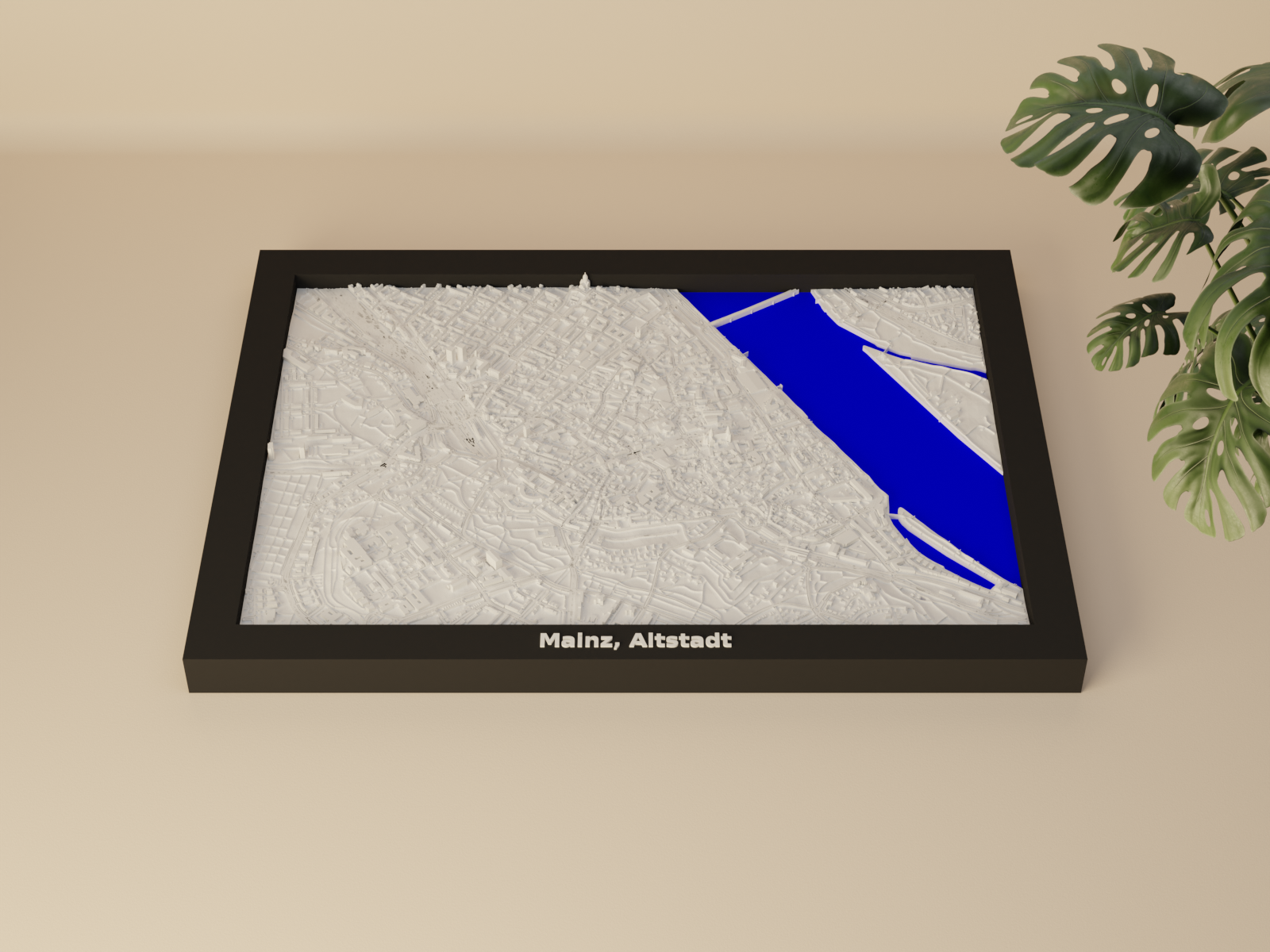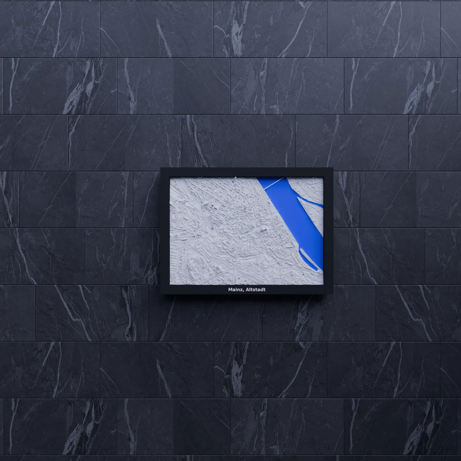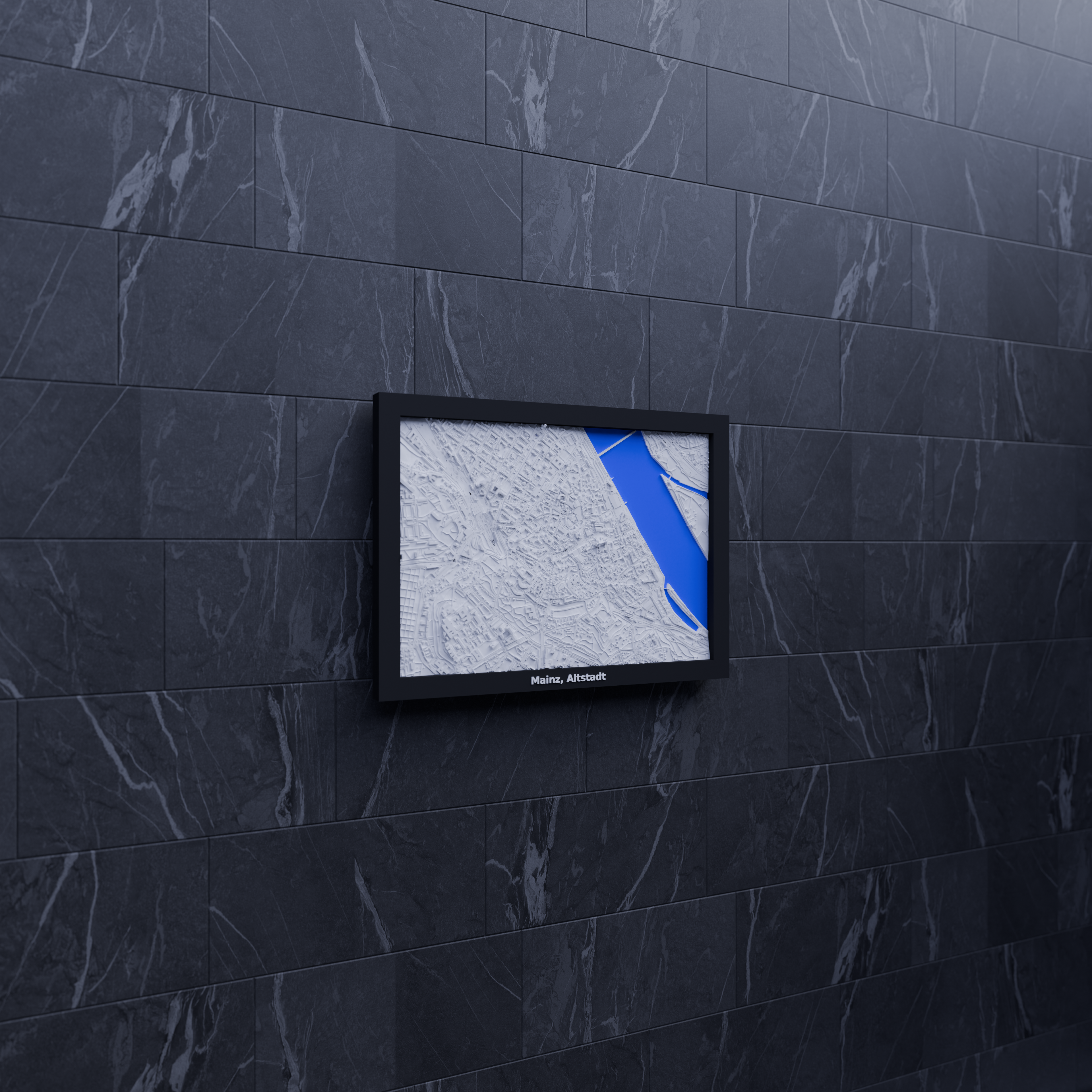 Lưu lại vẻ đẹp cảnh quan thành phố Mainz, Altstadt với mô hình địa hình thu nhỏ 3D có thể in. Kích thước thu nhỏ 170.5 mm x 119.5 mm, lý tưởng cho giáo dục, trang trí. Bao gồm nhiều tùy chọn khung in.