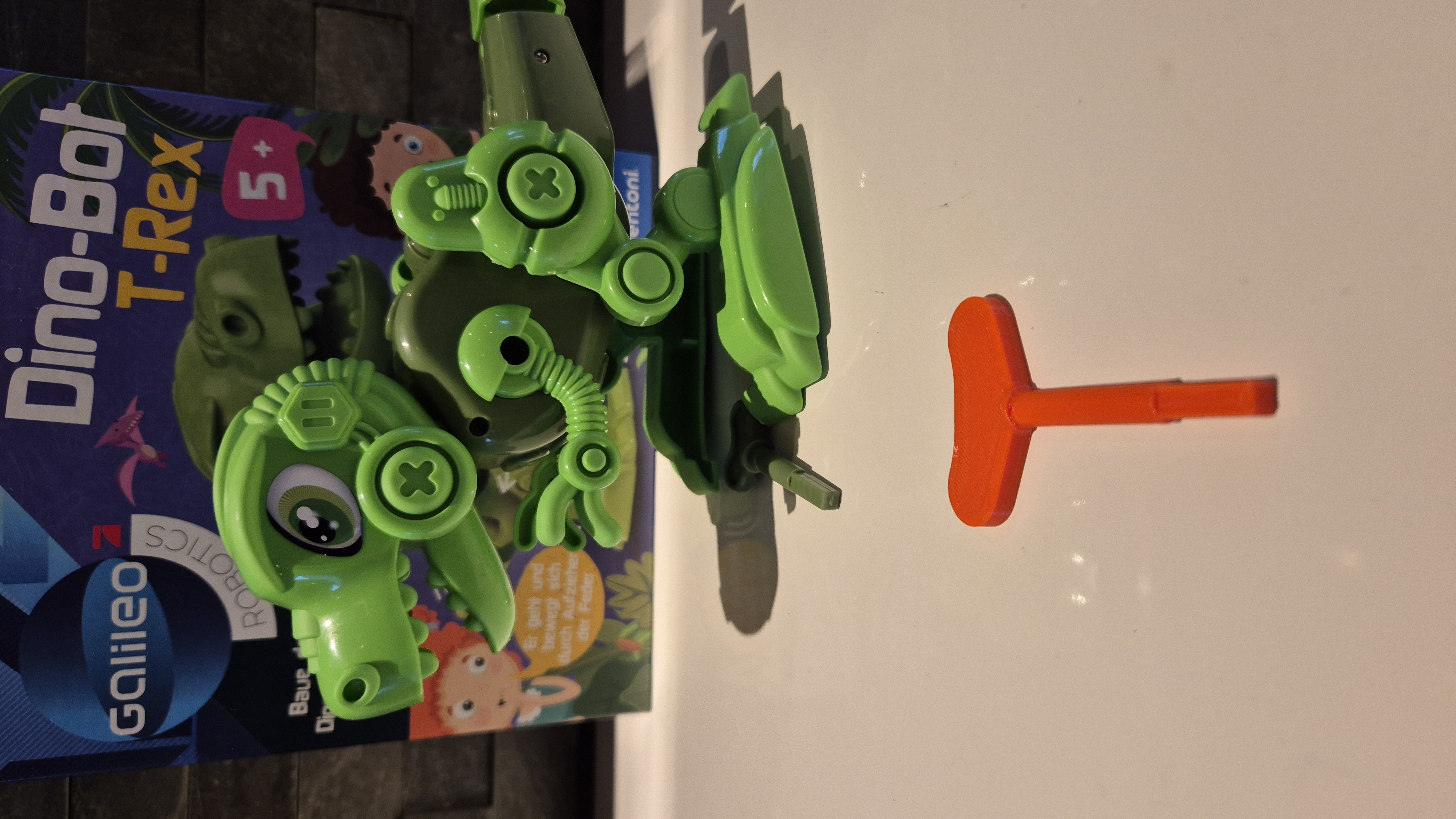 Cái chìa khóa zin để lên dây cho Dino-Bot T-Rex hơi nhỏ, con trai tui gặp khó khăn khi xài. Đây là một mẫu được làm lớn hơn và dễ cầm nắm hơn một chút để mấy đứa nhỏ xài cho tiện.