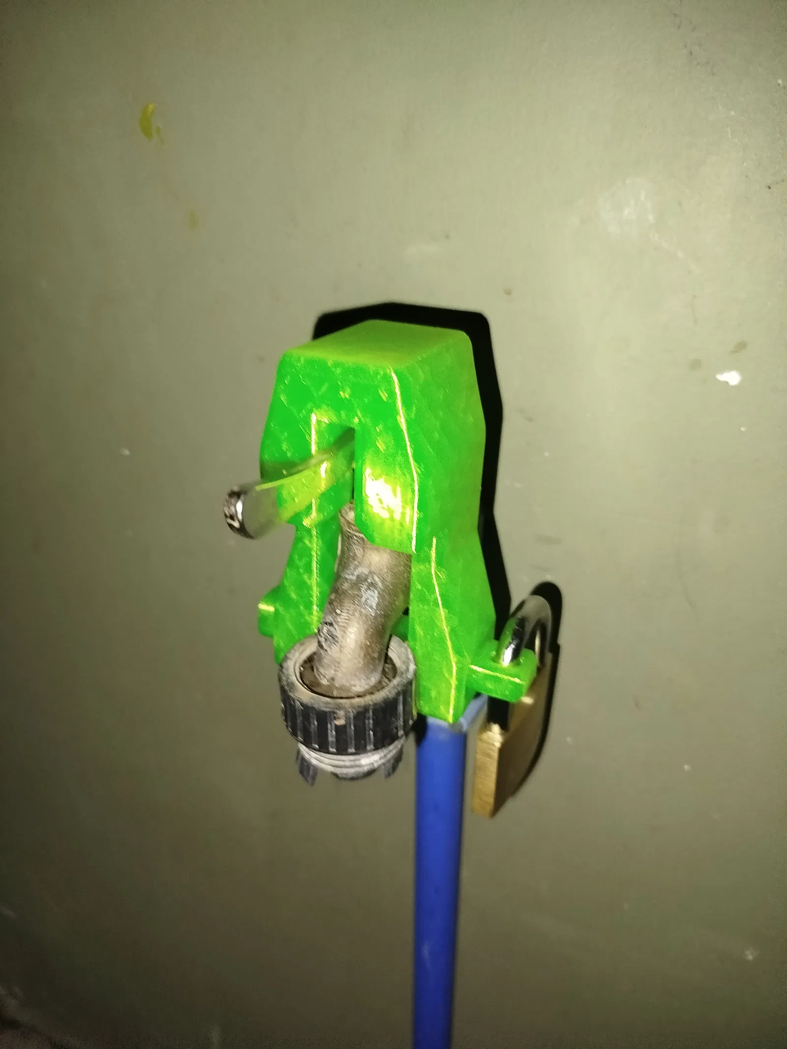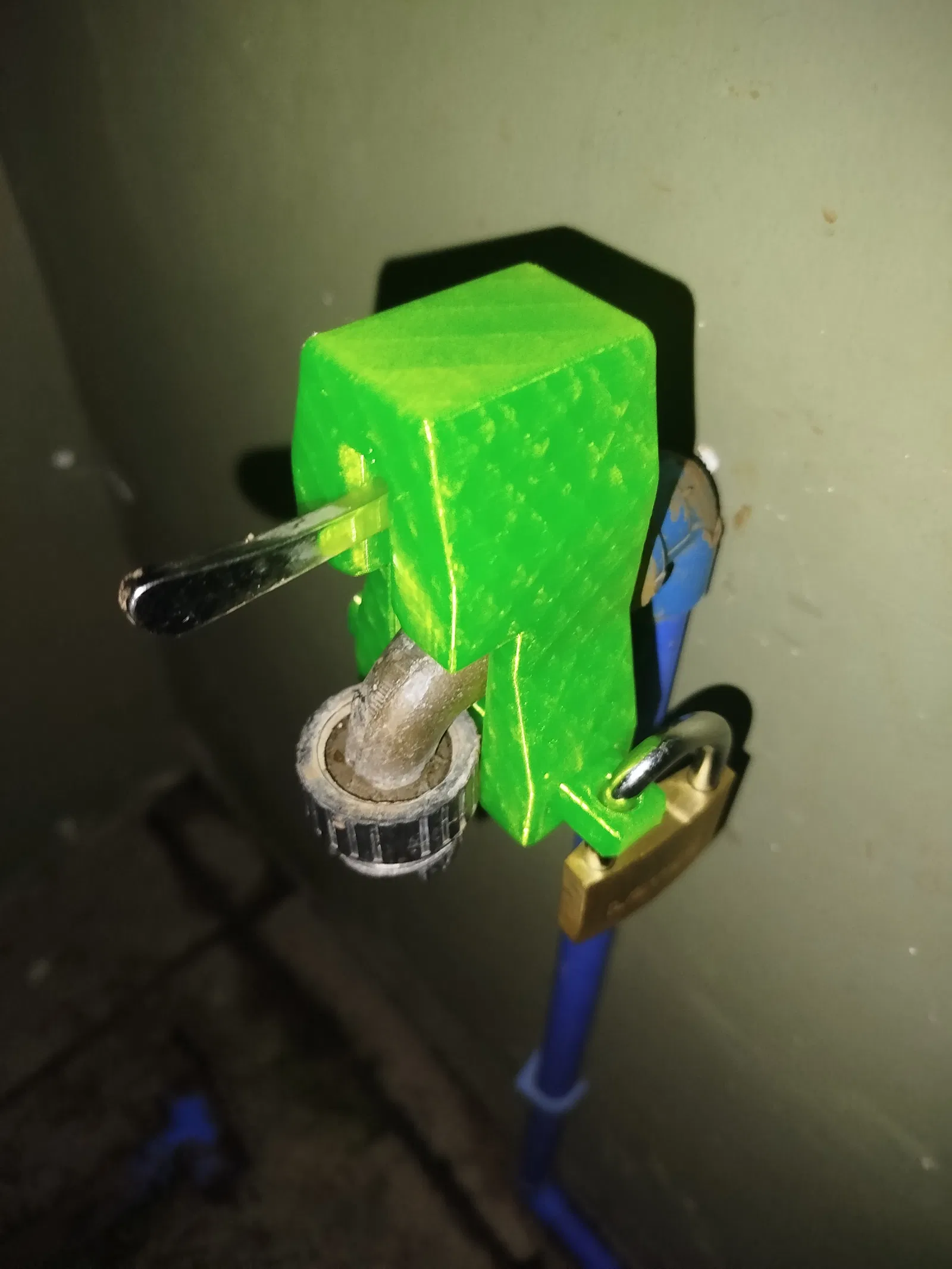 Khóa vòi nước ngoài trời này giúp ngăn tụi nhỏ nghịch nước. Vẫn cho phép chảy dòng nhỏ để rửa tay nhưng không mở hết cỡ được. In bằng PETG, 4 lớp tường, 20% độ đặc ruột.
