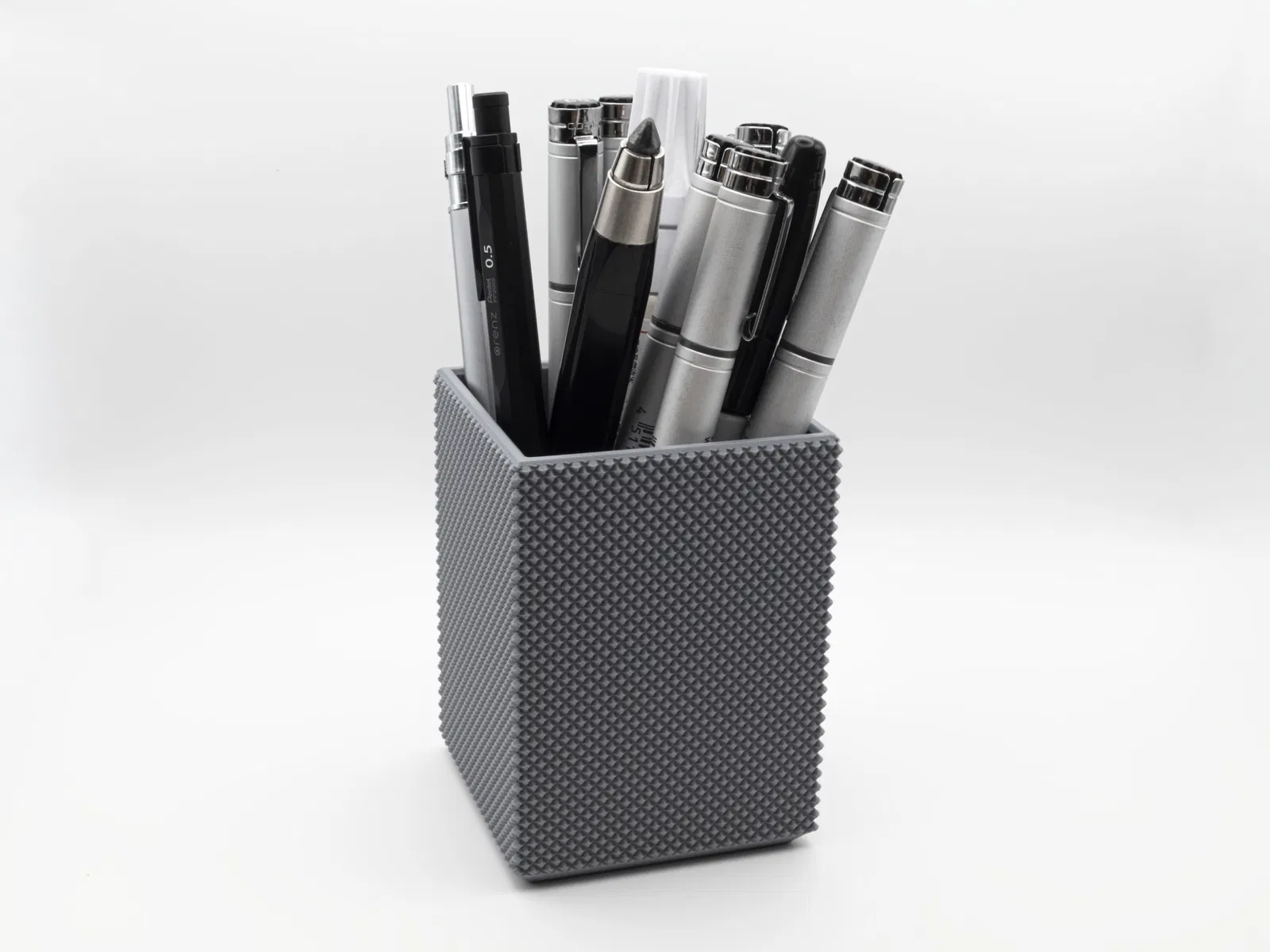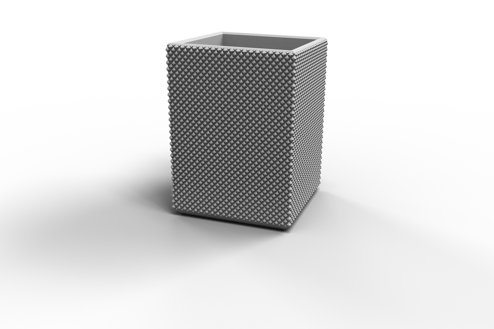 KHAY CẮM BÚT HÌNH CHỮ NHẬT VỚI CÁC MẶT NGOÀI ĐƯỢC VÂN XOÁY LỒNG VÀO NHAU THẨM MỸ. KÍCH THƯỚC BÊN TRONG = 54mm X 54mm X 81mm