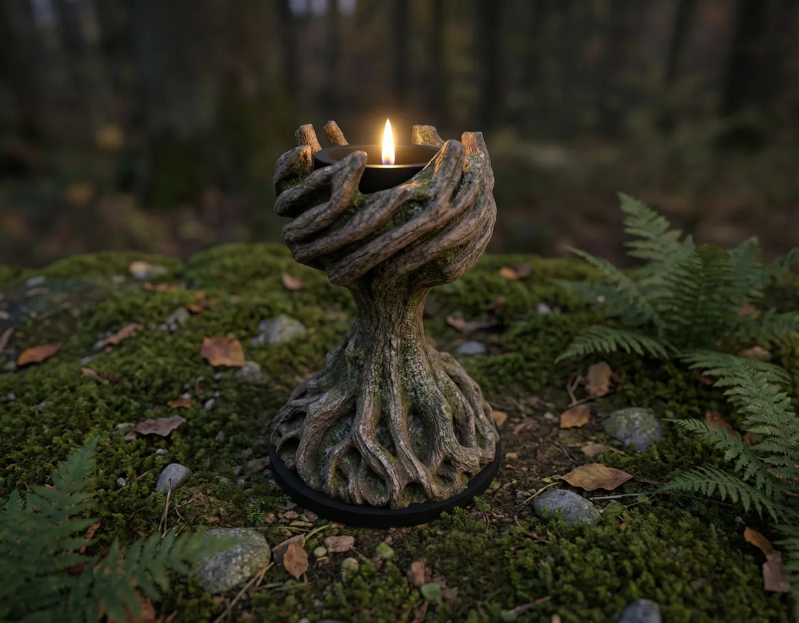 Cái chân nến hình cây này lấy cảm hứng từ mấy cái yếu tố thiên nhiên huyền ảo, với vân gỗ và rễ cây gợi nhớ đến rừng sâu. Nó mang một nét mộc mạc, đem cái không khí rừng núi về nhà mình.