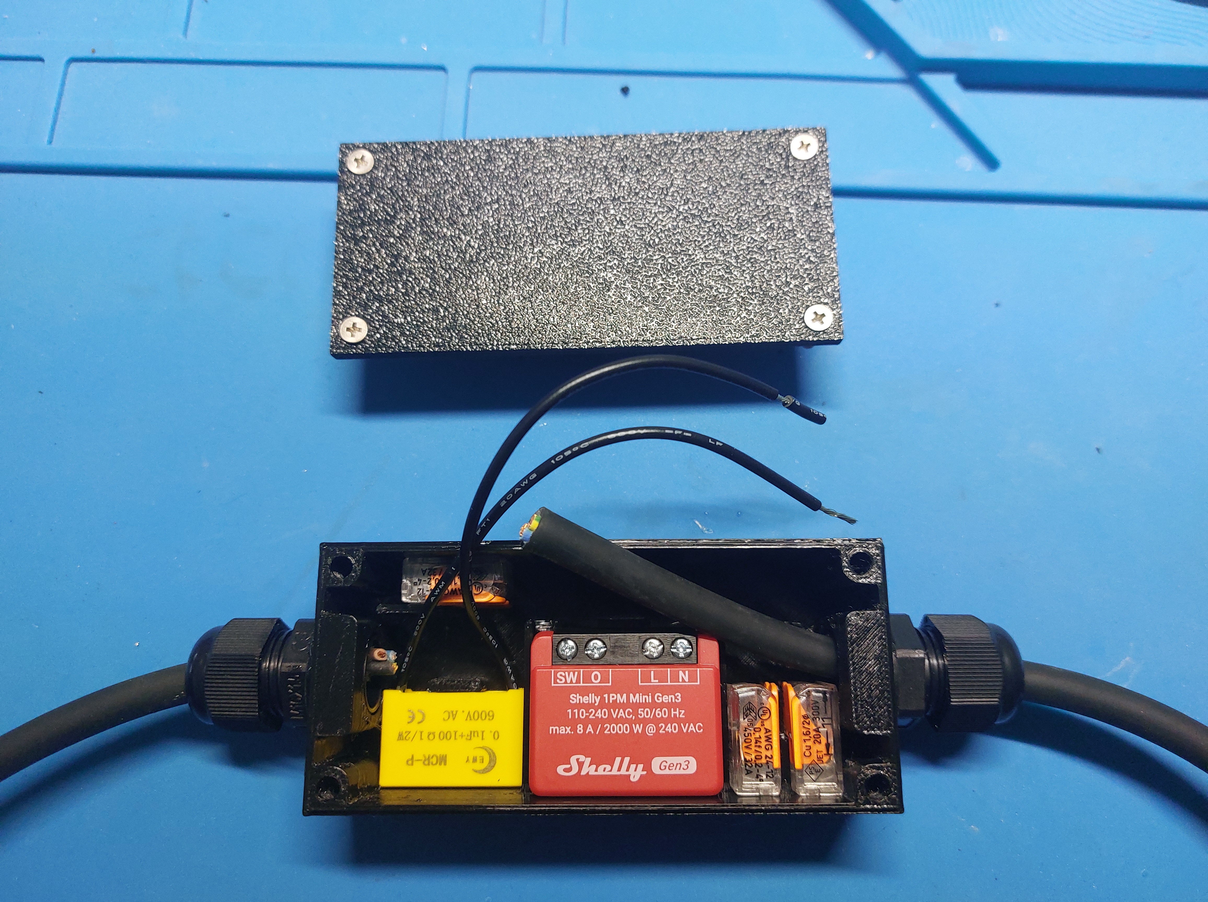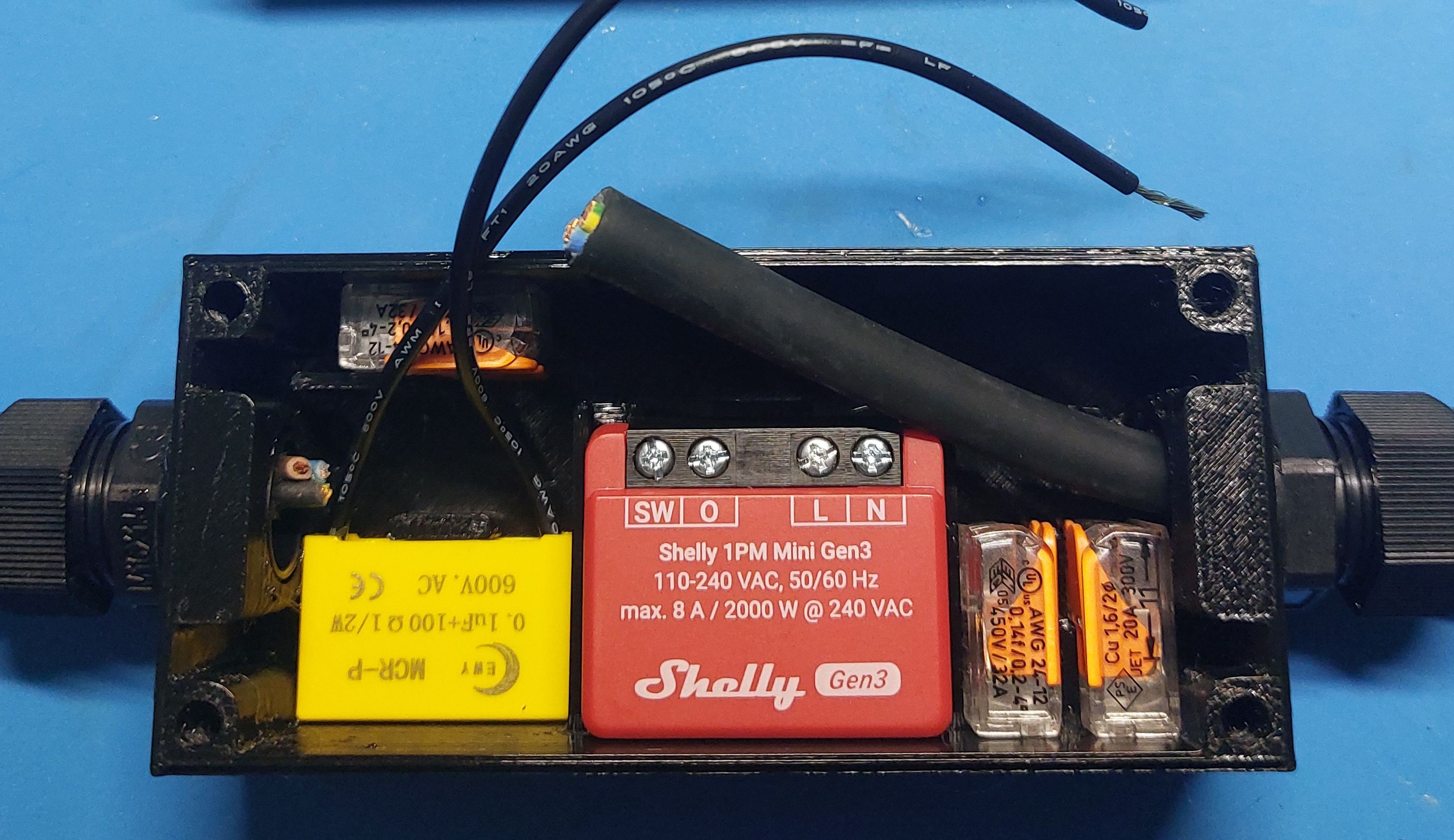 Vỏ Shelly 1 PM mini Gen3 với các loại đầu nối cáp và chỗ cho RC Snubber