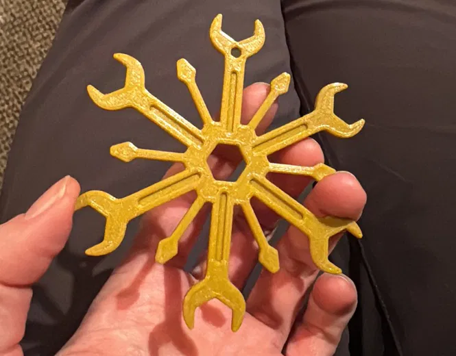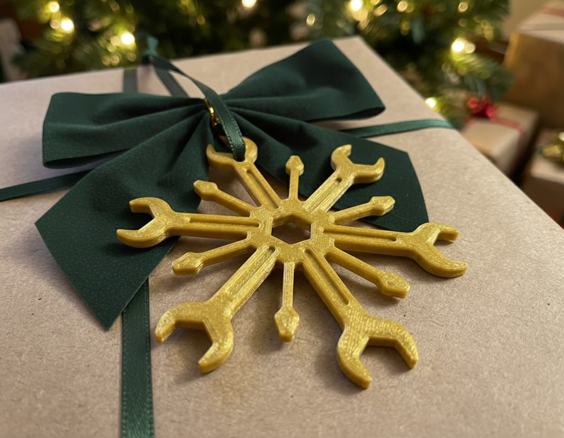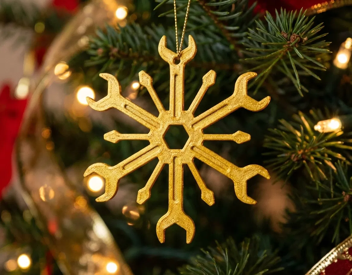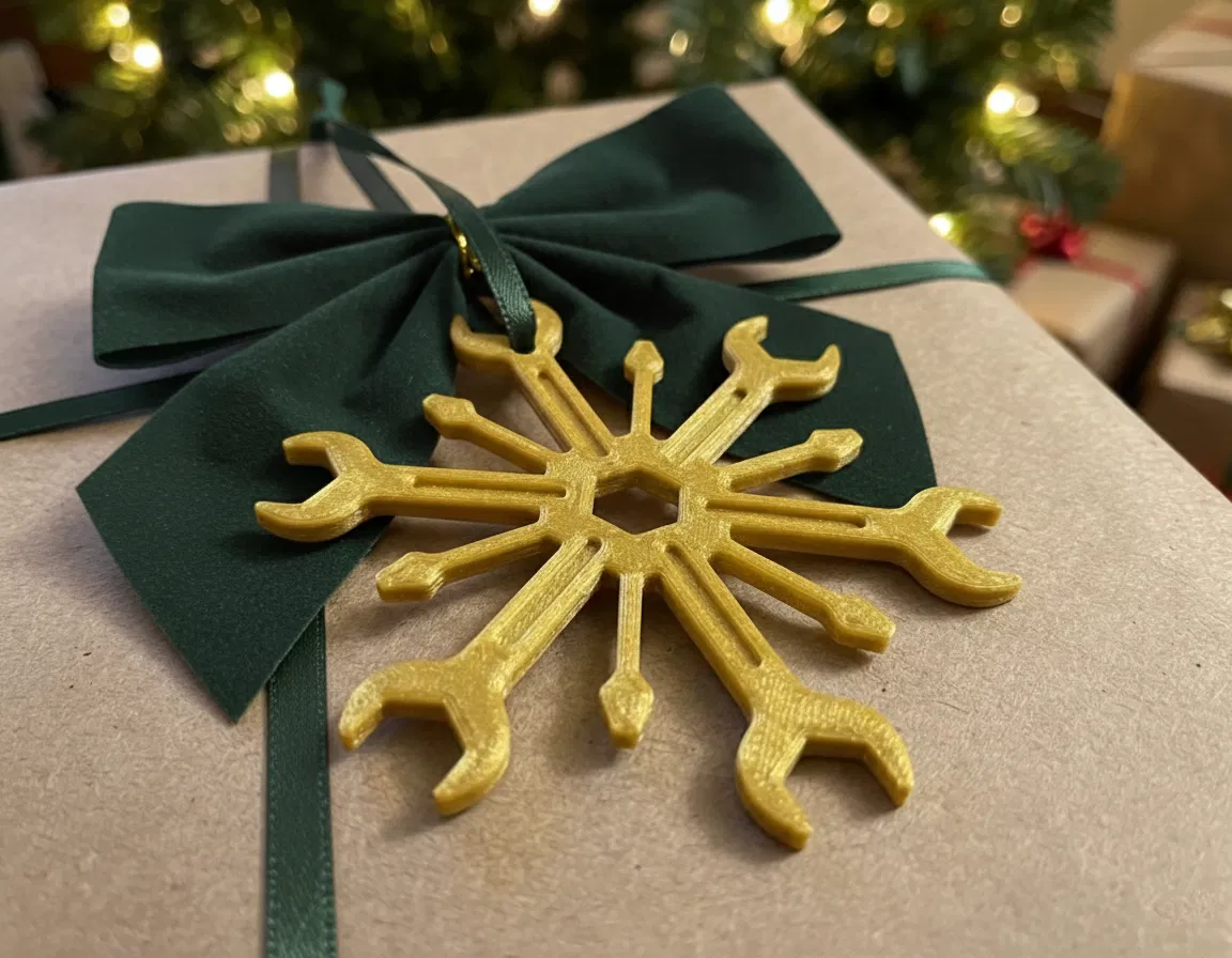 Một món đồ trang trí bông tuyết Giáng sinh độc đáo, kết hợp hình dáng của cờ lê và tua vít. Được làm từ PLA vàng, món đồ này mang đến nét sáng tạo cho cây thông Noel hoặc đồ trang trí nhà cửa của bạn, hoàn hảo làm quà tặng cho những người yêu thích đồ thủ công và cơ khí.