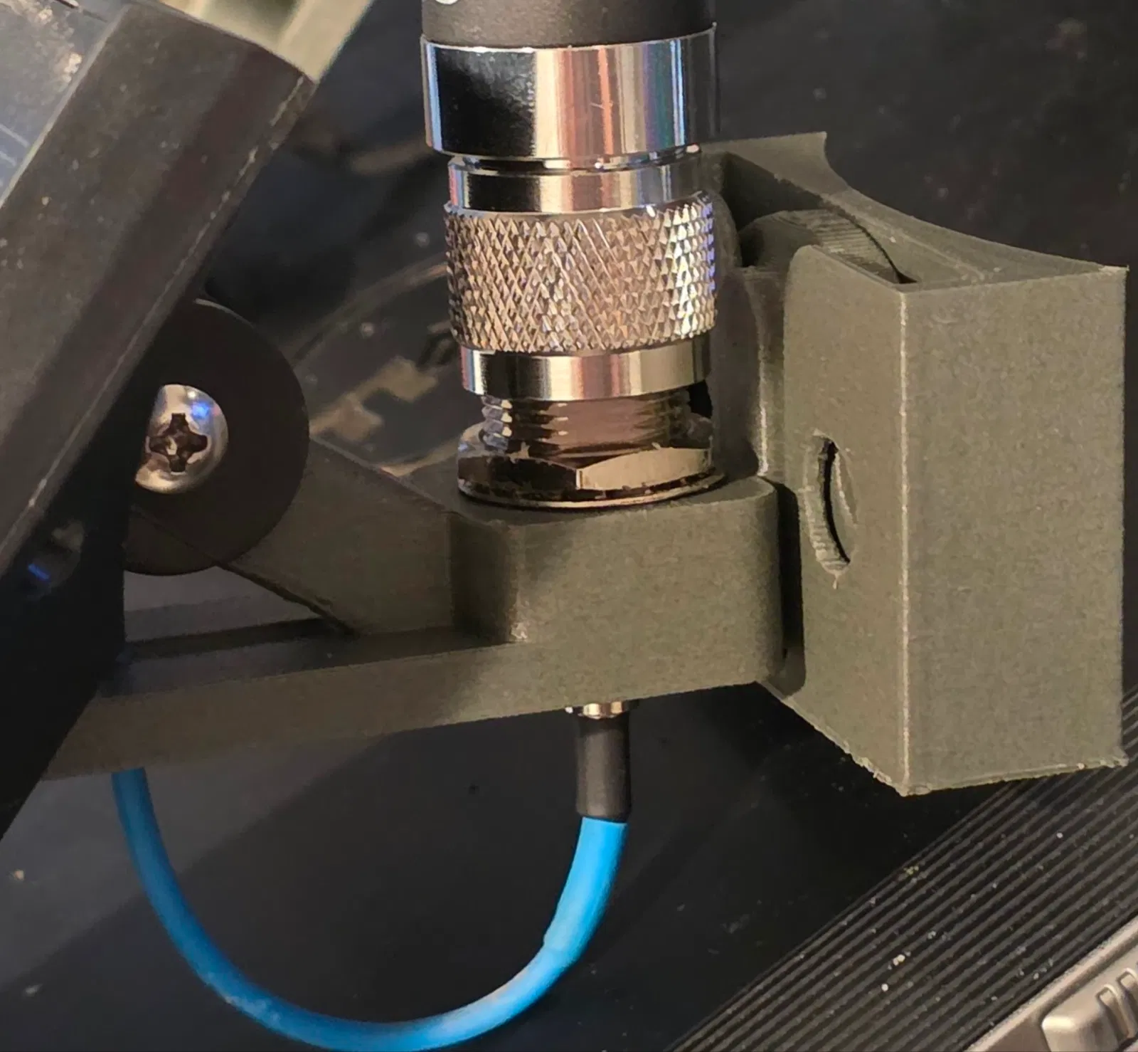 Đặt vòng khóa và vòng đệm cao su lên đầu nối N-Type và đặt đầu nối xuyên qua lỗ có rãnh của giá đỡ. Vặn chặt đai ốc để cố định.