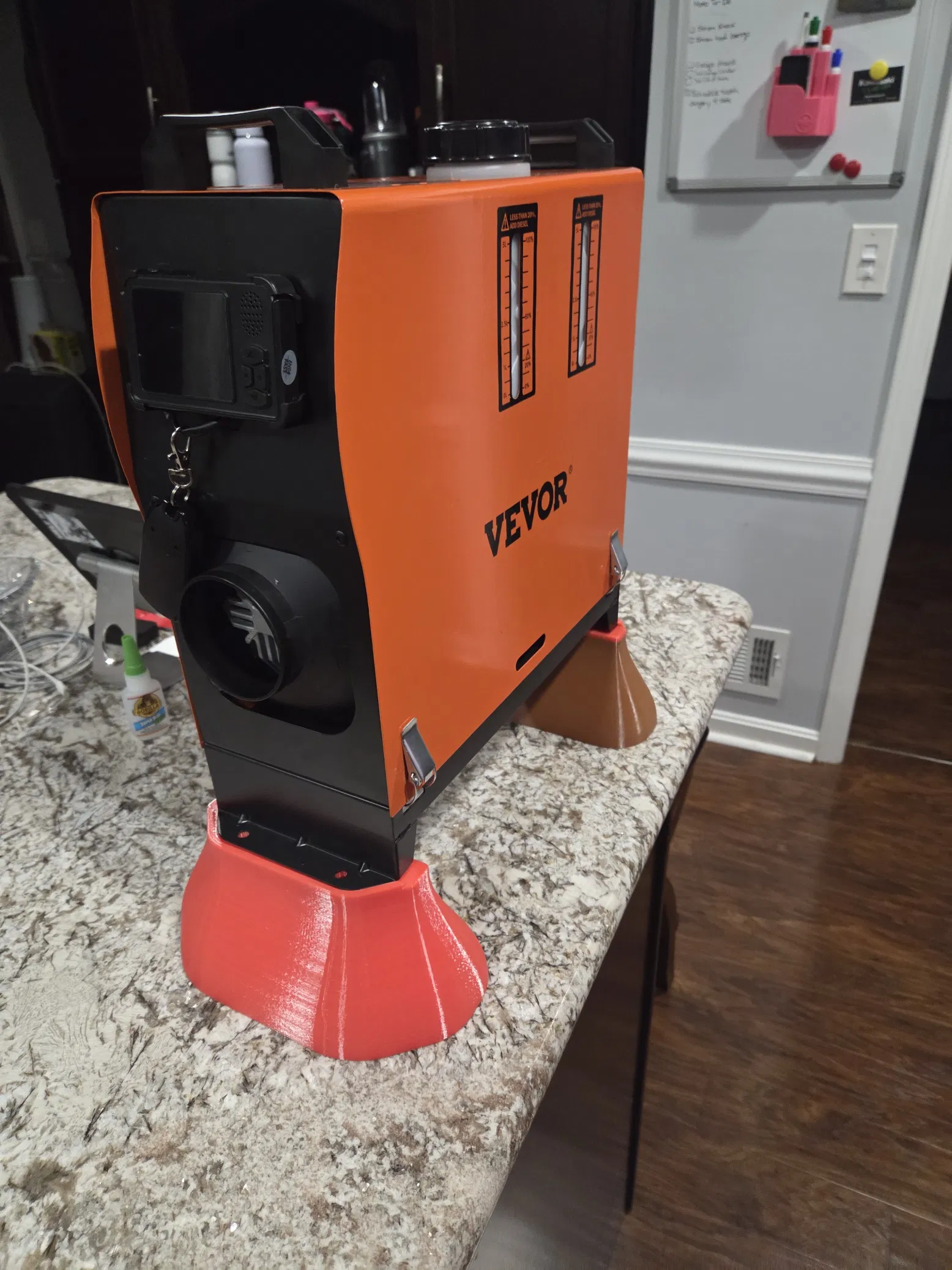 Chân đế máy sưởi dầu Vevor 5kw 8kw giúp máy không bị nghiêng, ống xả không bị gấp khúc. Dễ in, có file STEP chỉnh sửa. Khuyến nghị in bằng PETG, không dùng PLA. Có 2 phiên bản cho máy có hoặc không có cạnh vát.