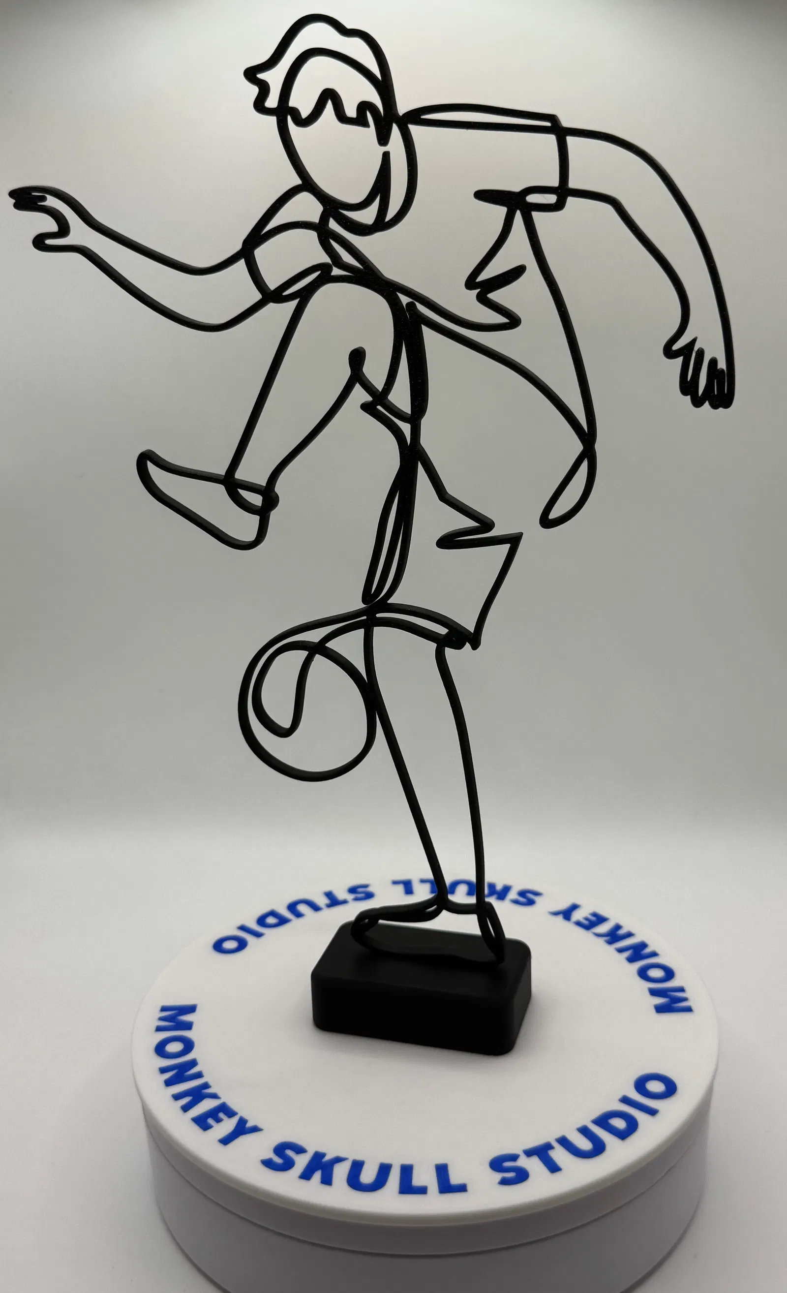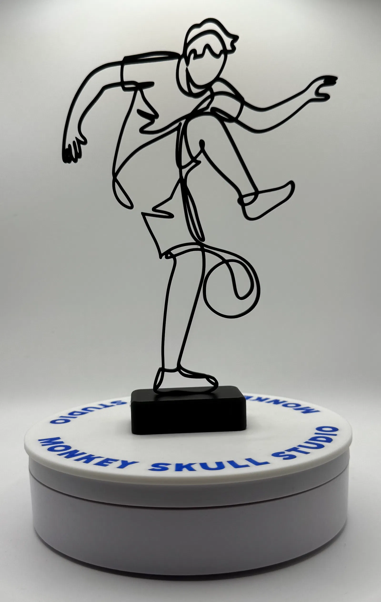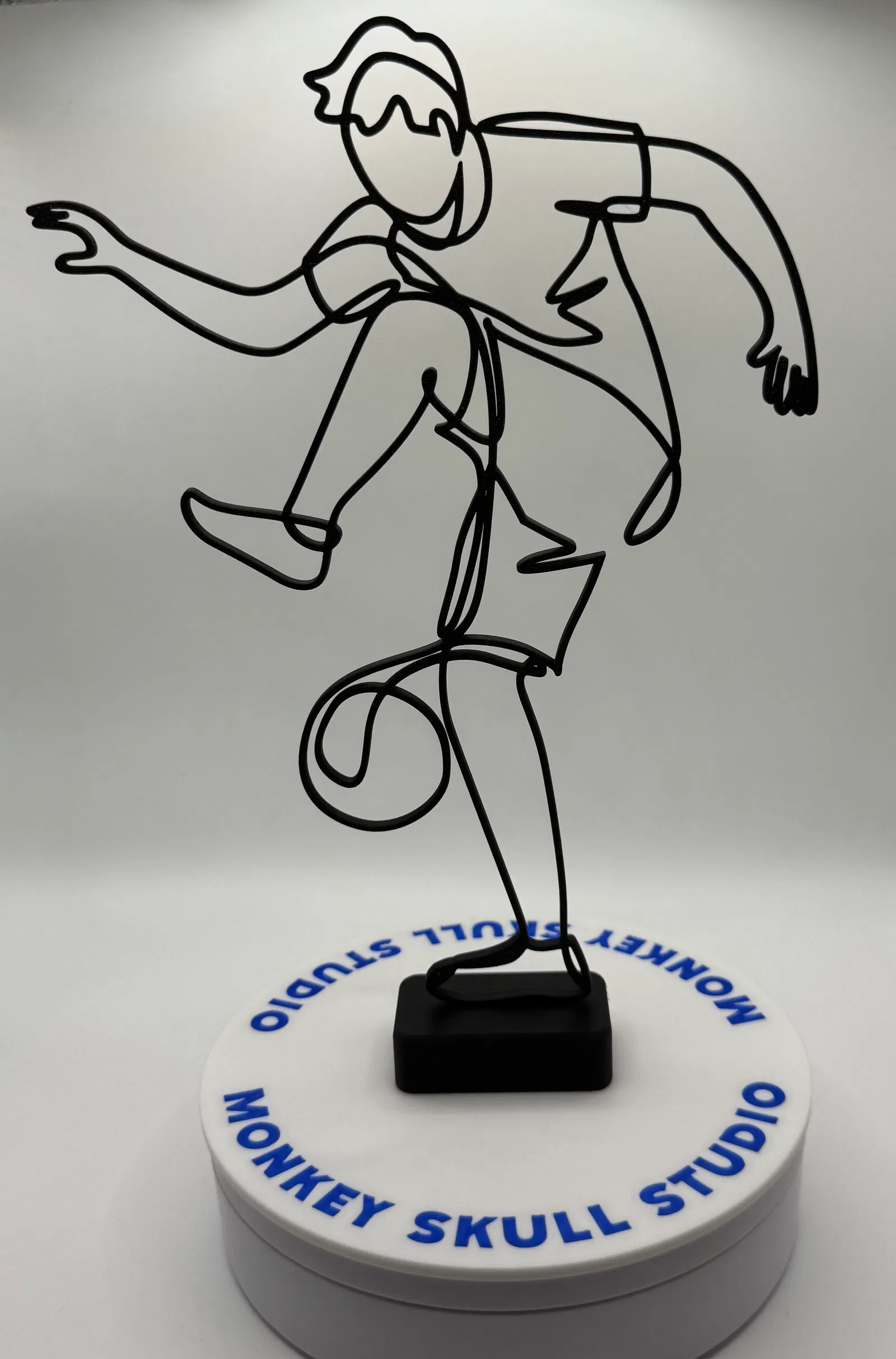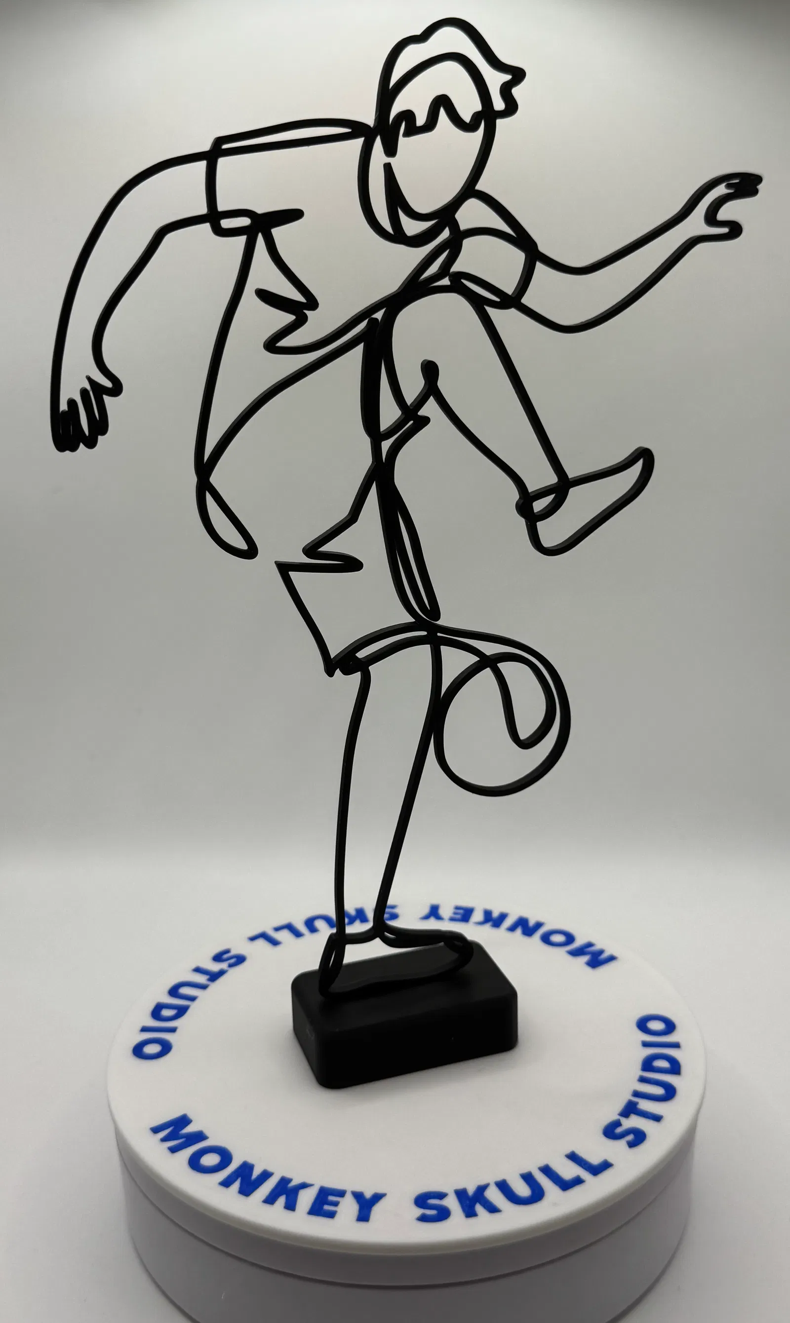 Mô hình điêu khắc nghệ thuật đường nét hiện đại, ghi lại chuyển động năng động của một cầu thủ bóng đá đang thi đấu. Được tạo ra như một đường viền sạch sẽ, uyển chuyển, tác phẩm này nhấn mạnh sự chuyển động và cân bằng, đồng thời giữ tính thẩm mỹ tối giản, lý tưởng cho bàn làm việc, kệ và nội thất đương đại.