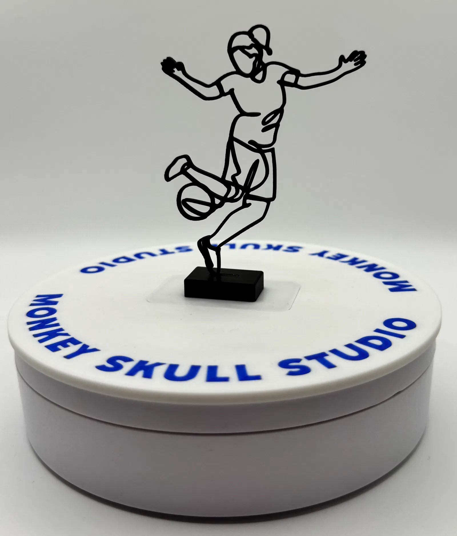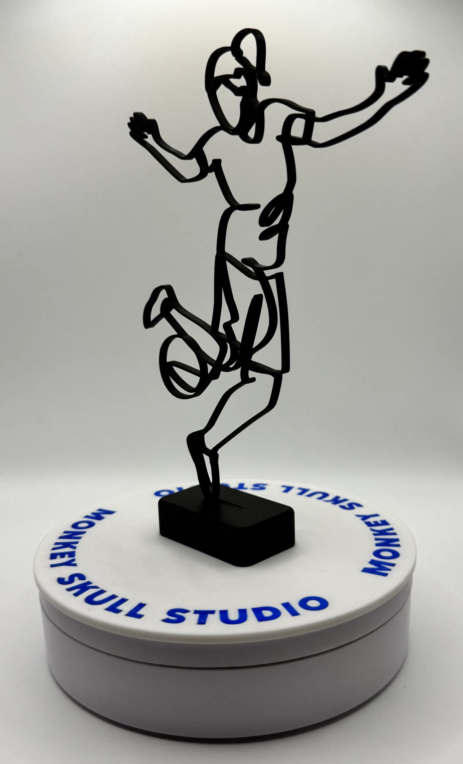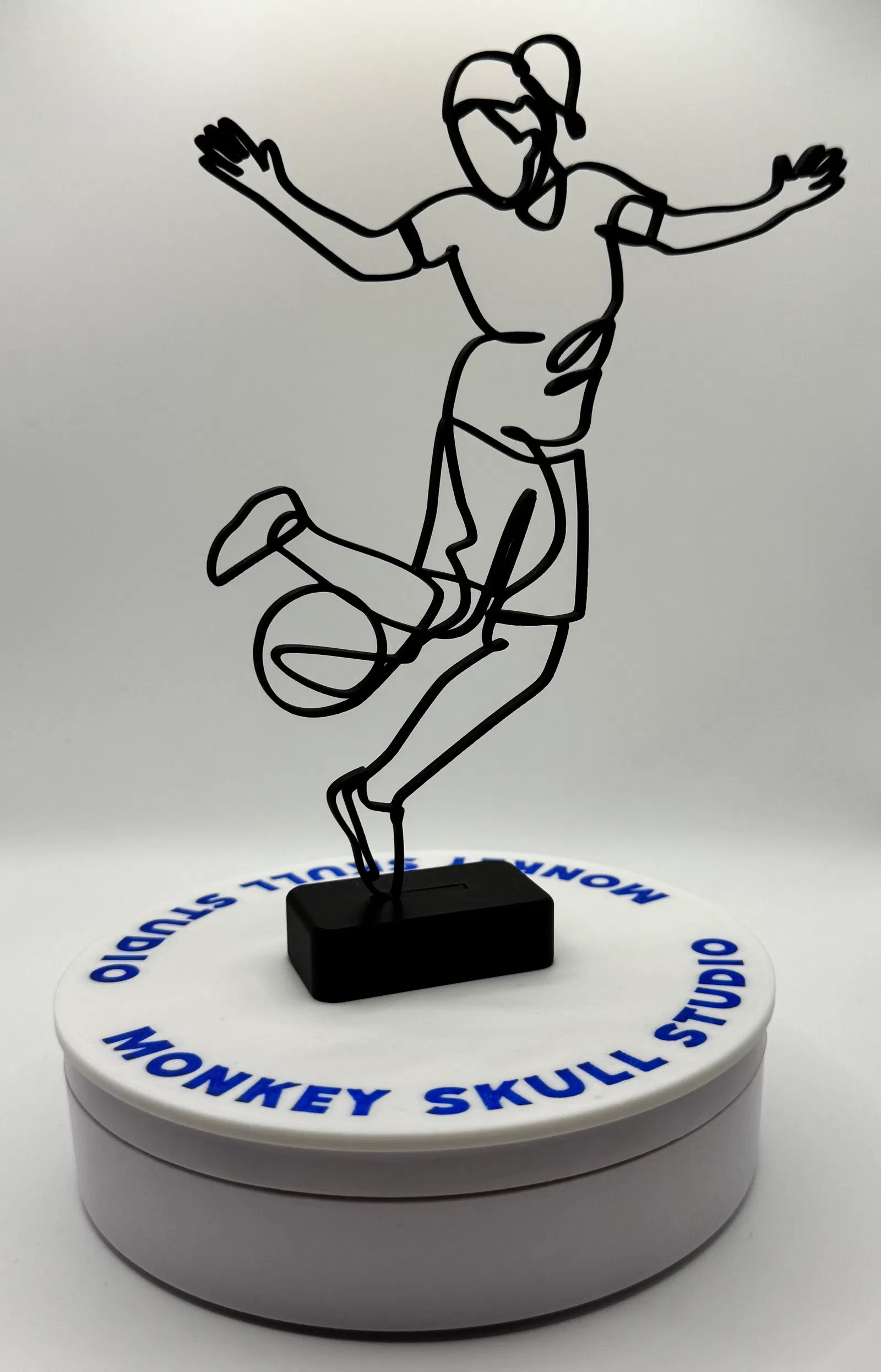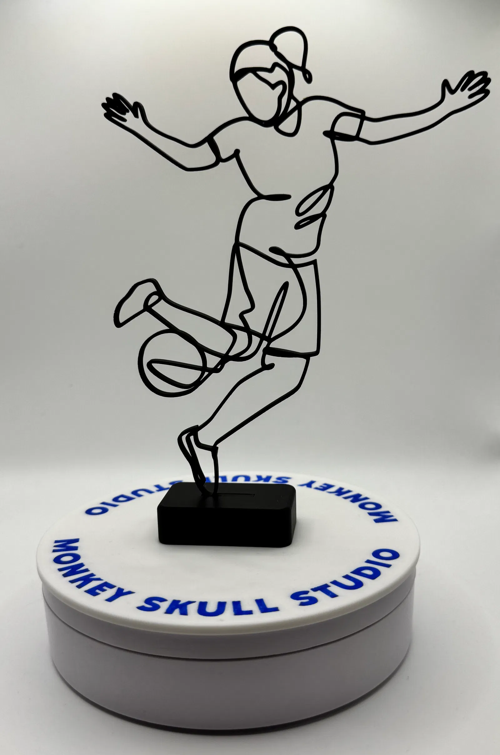 Kiệt tác điêu khắc tối giản theo phong cách dây, khắc họa nữ cầu thủ bóng đá đang chuyển động. Bản in không cần hỗ trợ, có đế tích hợp, dễ in với PLA. Hoàn hảo làm đồ trang trí.