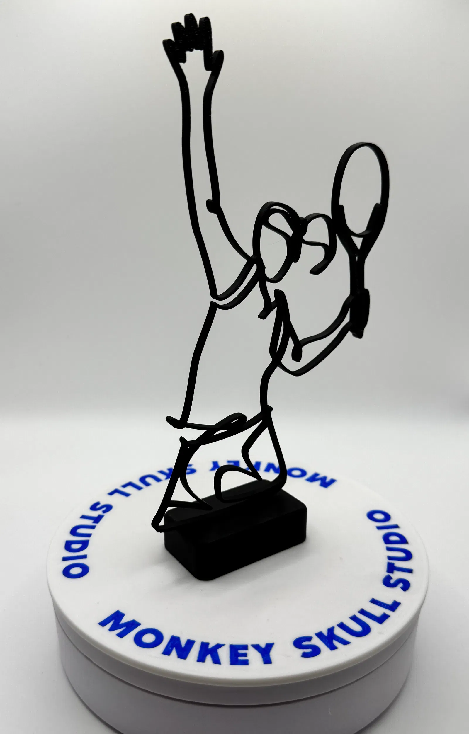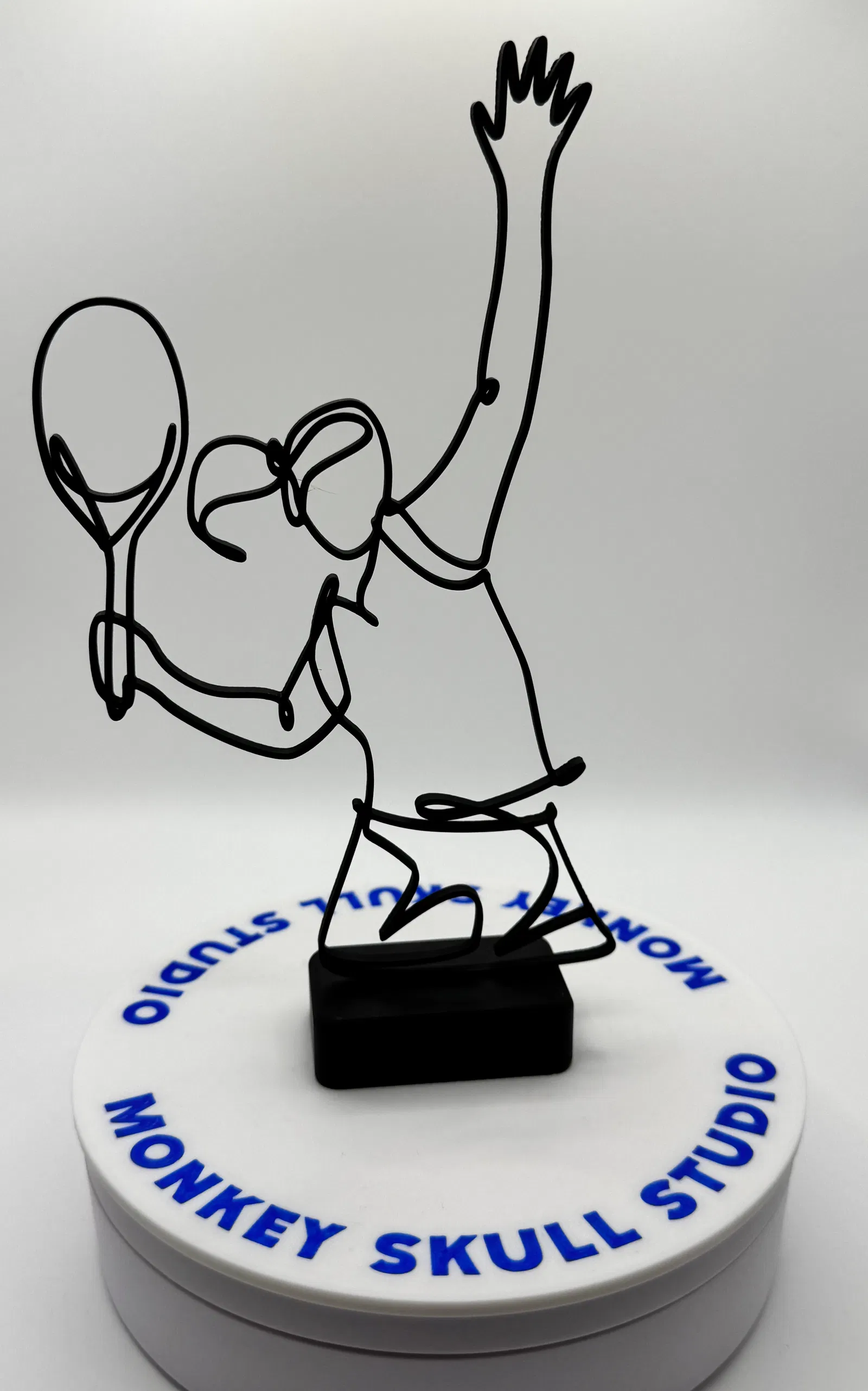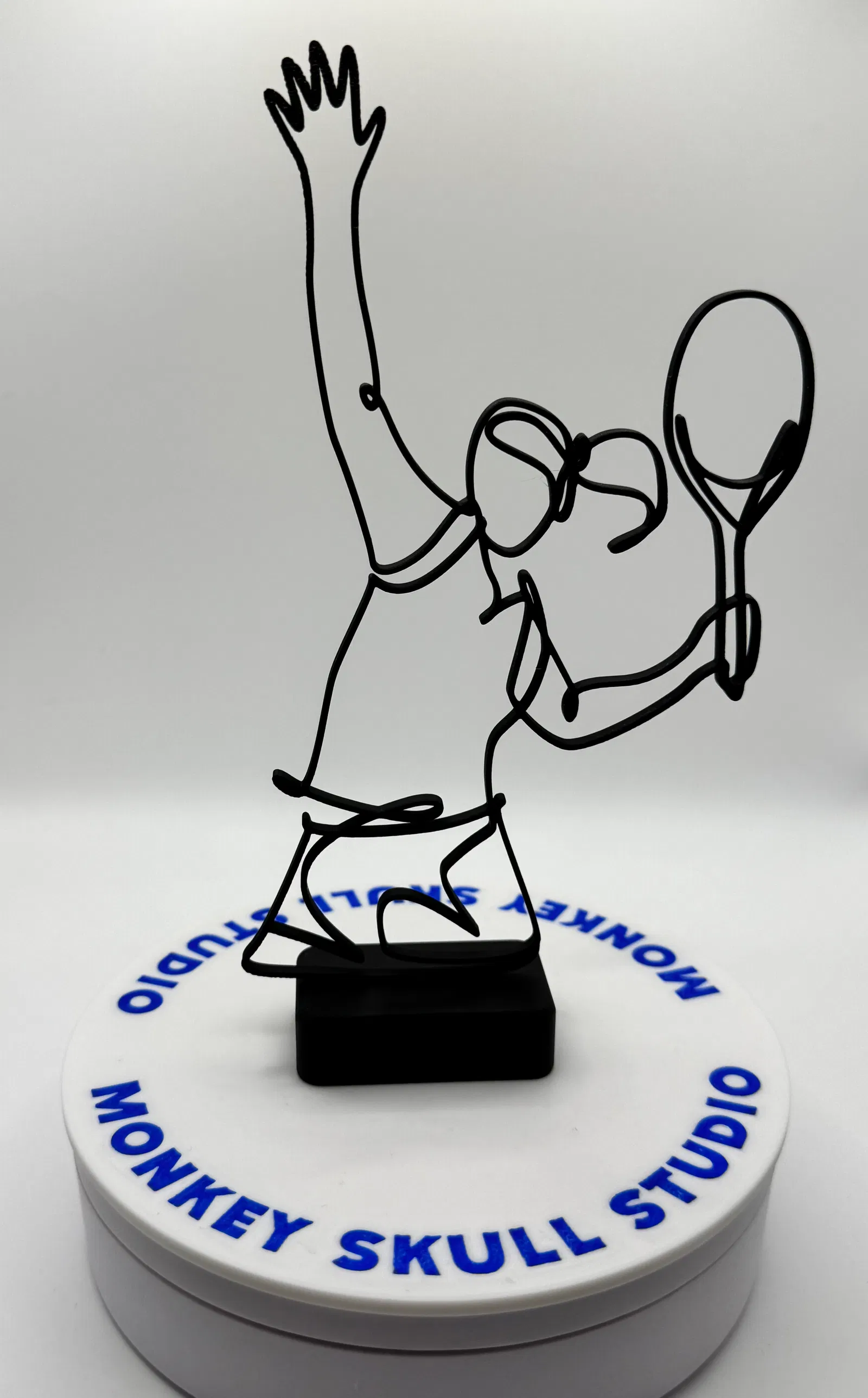 Kiệt tác điêu khắc tối giản theo phong cách dây nắm bắt sức mạnh và sự duyên dáng của cú giao bóng của vận động viên tennis nữ. Bản in không cần hỗ trợ với đế tích hợp, hoàn hảo cho bàn làm việc hoặc kệ sách.