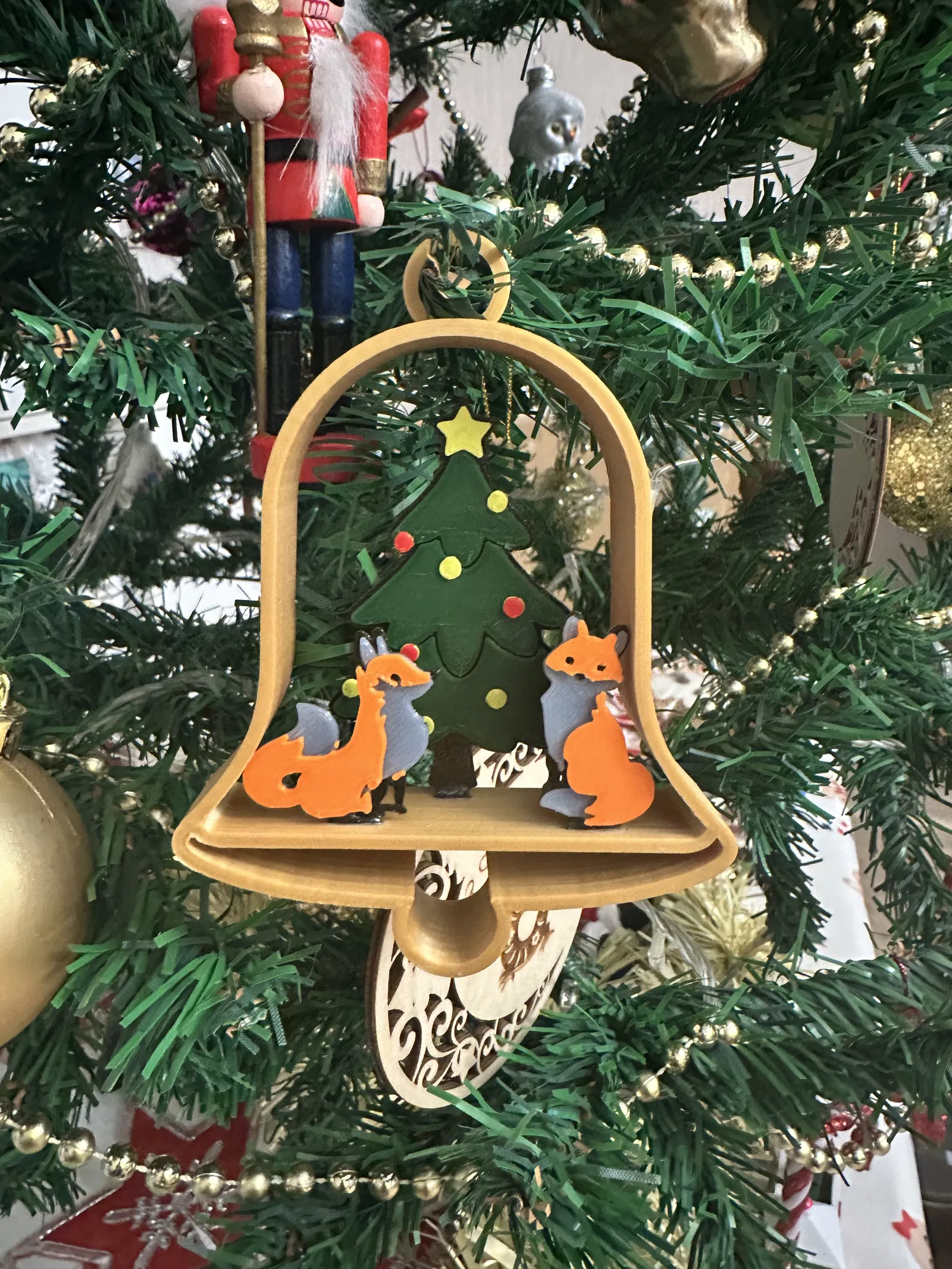 Đây là một món đồ trang trí cây thông Noel đẹp. Bạn có thể tách lớp để in phần con cáo và cây thông riêng lẻ để tạo hiệu ứng đa sắc màu như trong hình của tôi. Có những khe nhỏ để lồng các hình vào bên trong quả chuông. Tôi đã dùng keo siêu dính để làm cho nó chắc chắn hơn. Đã đính kèm file STL và GCODE mà tôi đã dùng để tạo ra sản phẩm trong hình.