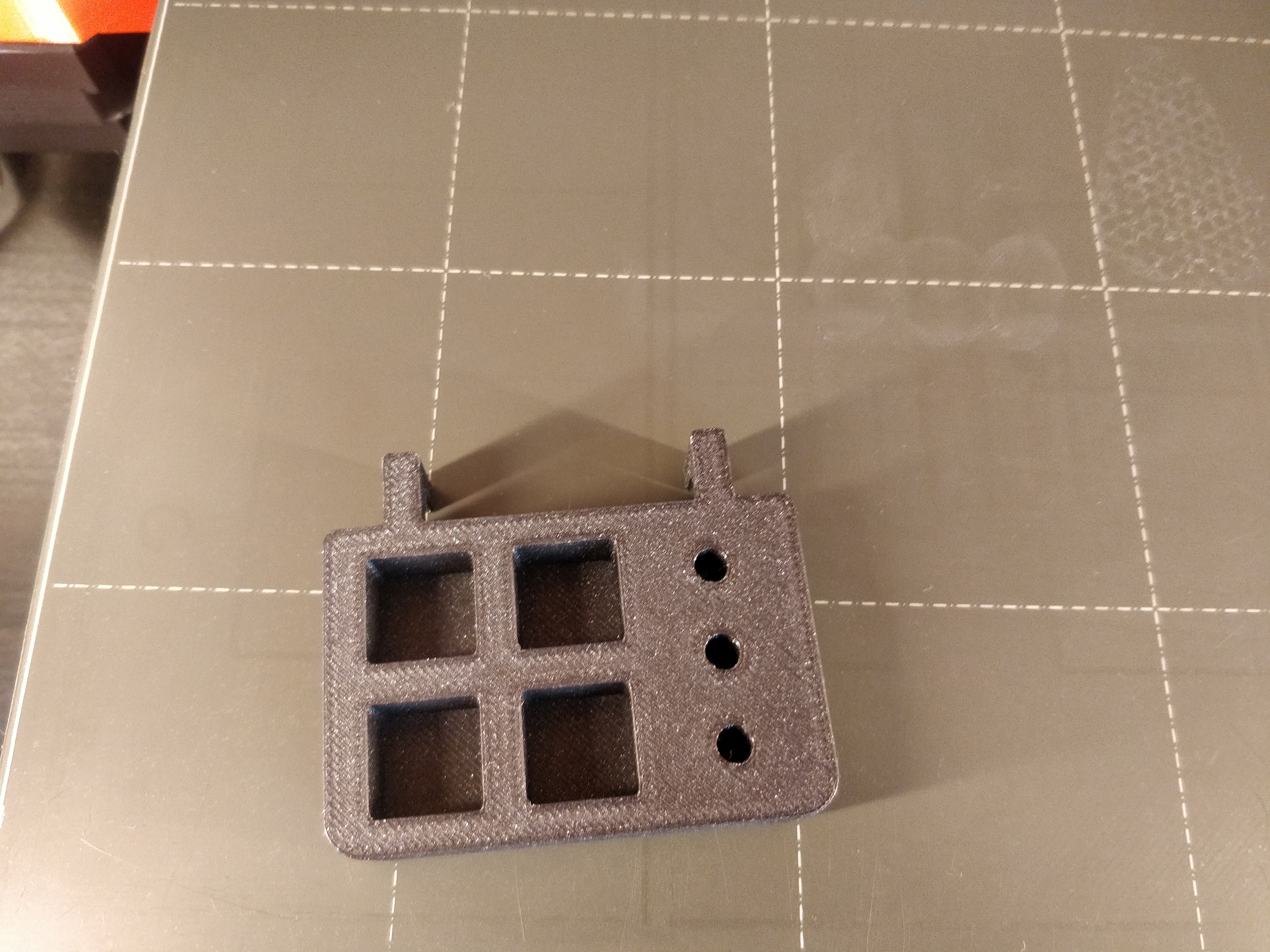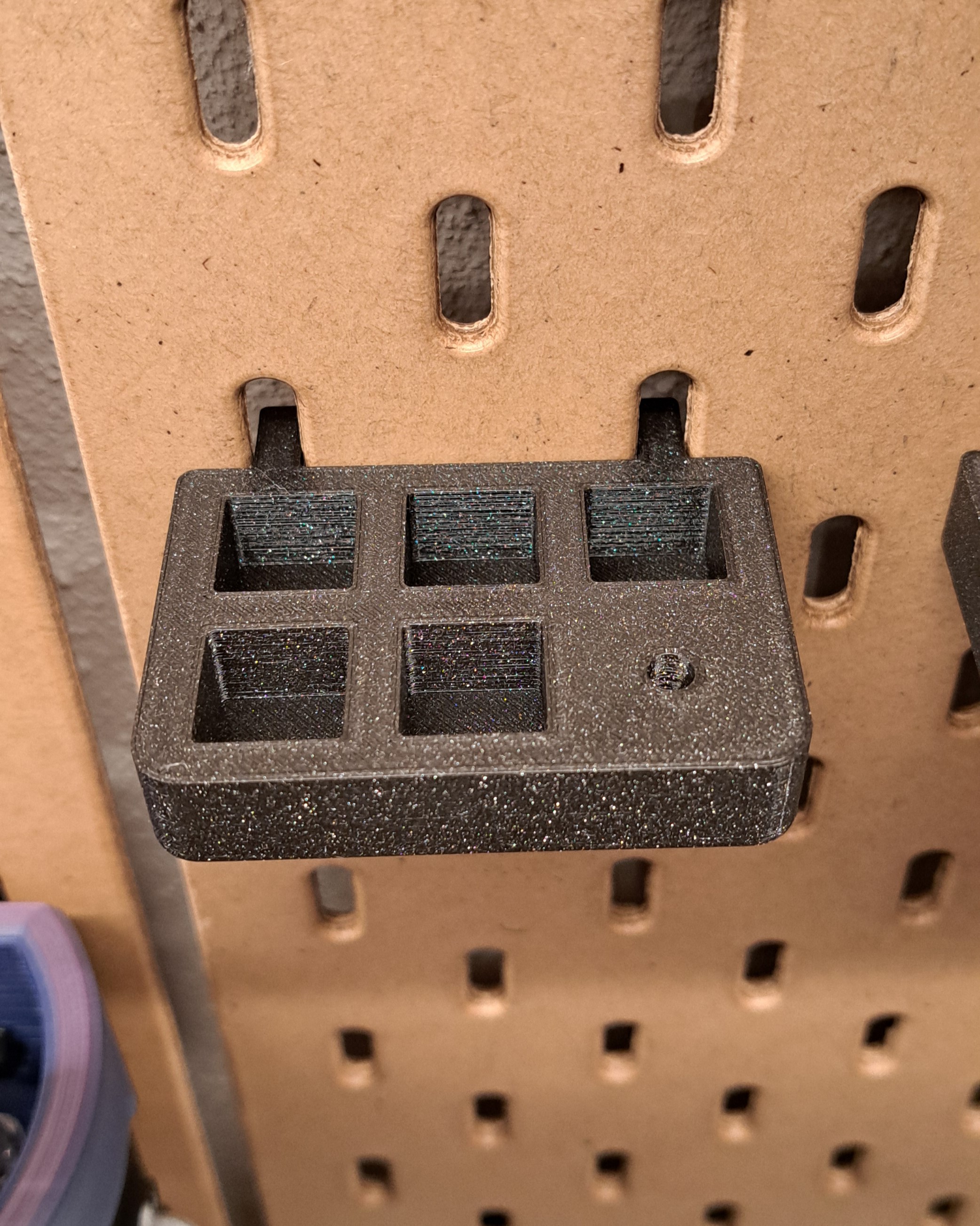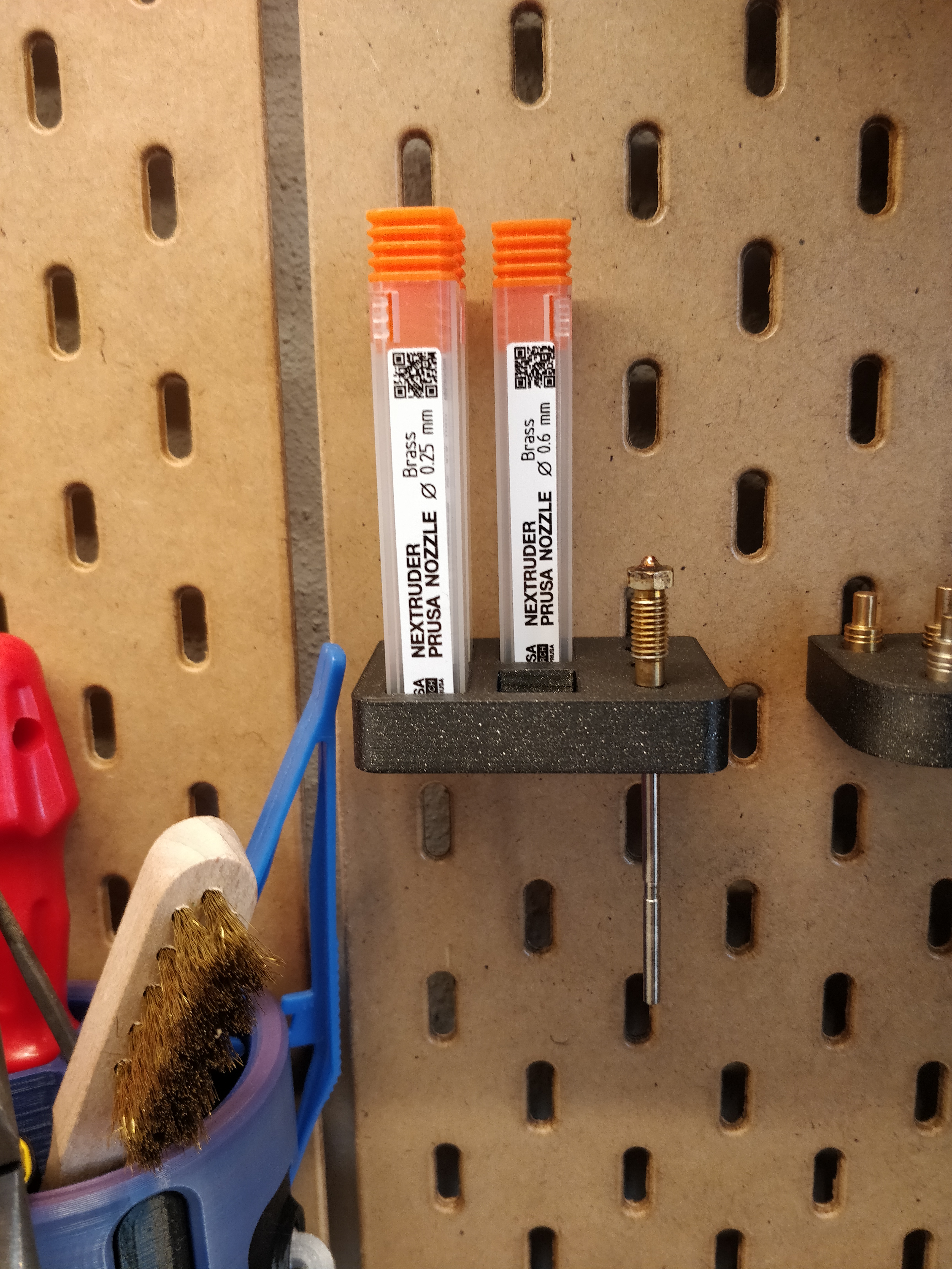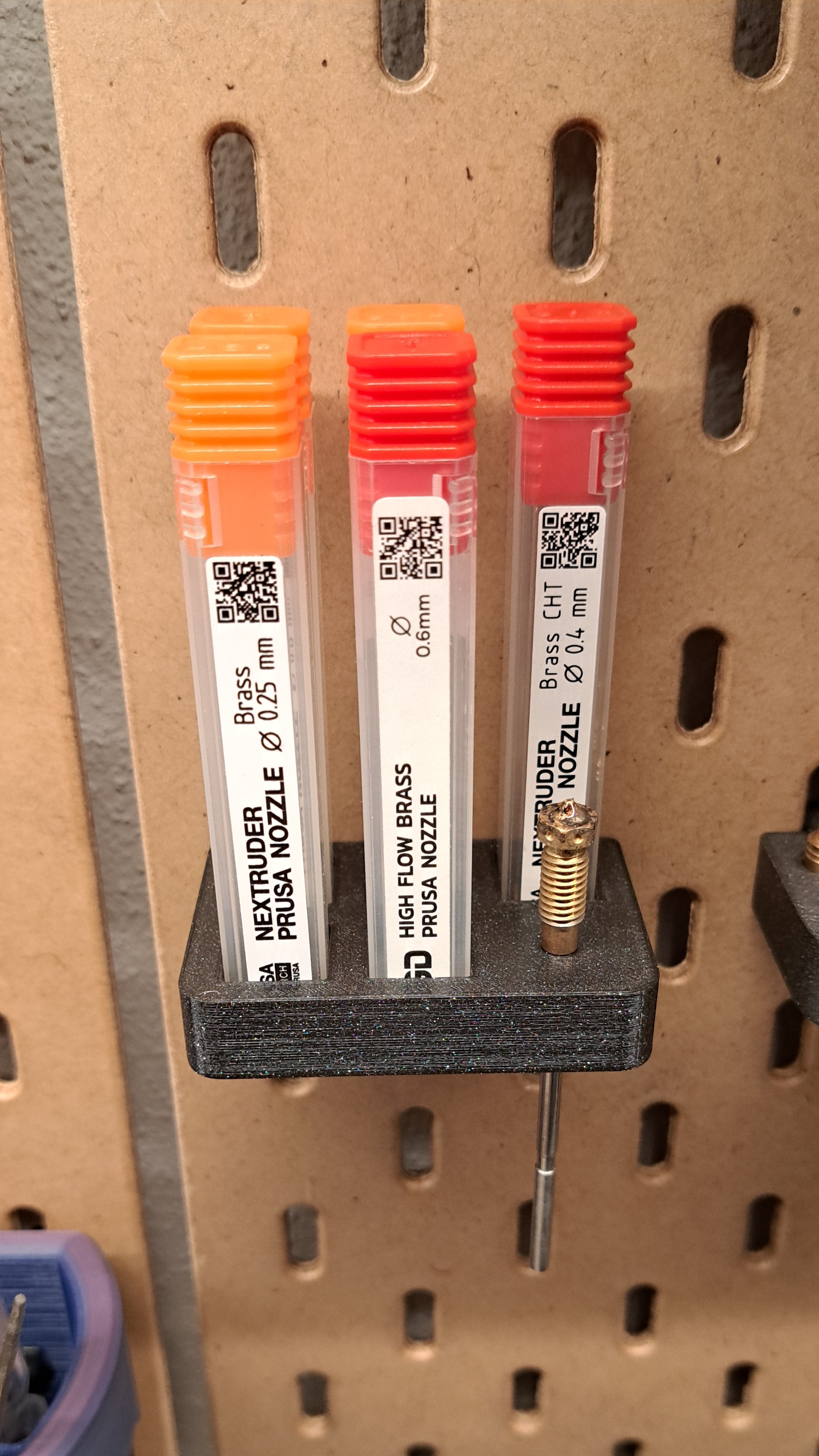 Cái giá đỡ Skadis cho đầu phun Nextruder này có thể chứa được tới bảy đầu phun. 4 cái bên trong hộp đựng nguyên bản và 3 cái để trần. Bạn có thể in mà không cần hỗ trợ, nhưng có thể thêm một ít hỗ trợ bên dưới phần cầu nối của chi tiết. Tuy nhiên, mình khuyên bạn nên dùng brim hoặc một cái đĩa hỗ trợ (helper disc) từ PrusaSlicer xung quanh các móc nhỏ.
