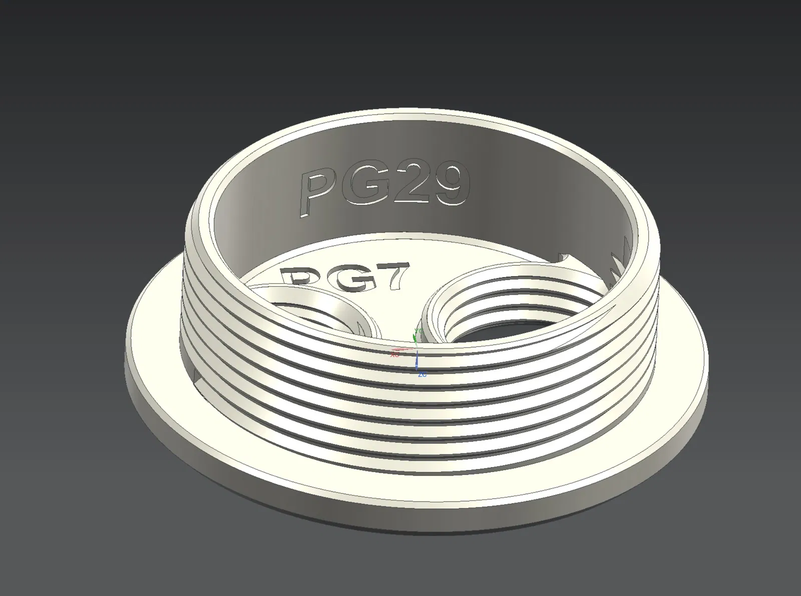 Chặn ren PG29 dùng để đóng các lỗ PG29 chưa sử dụng trên vỏ hộp. Bộ chuyển đổi này cho phép lắp đầu nối cáp PG9, dùng cho dây có đường kính nhỏ hơn, trong khi lỗ PG7 còn lại có thể được đóng bằng chặn PG7. Có sẵn file model gioăng TPU tùy chọn cho PG29, PG9 và PG7.
