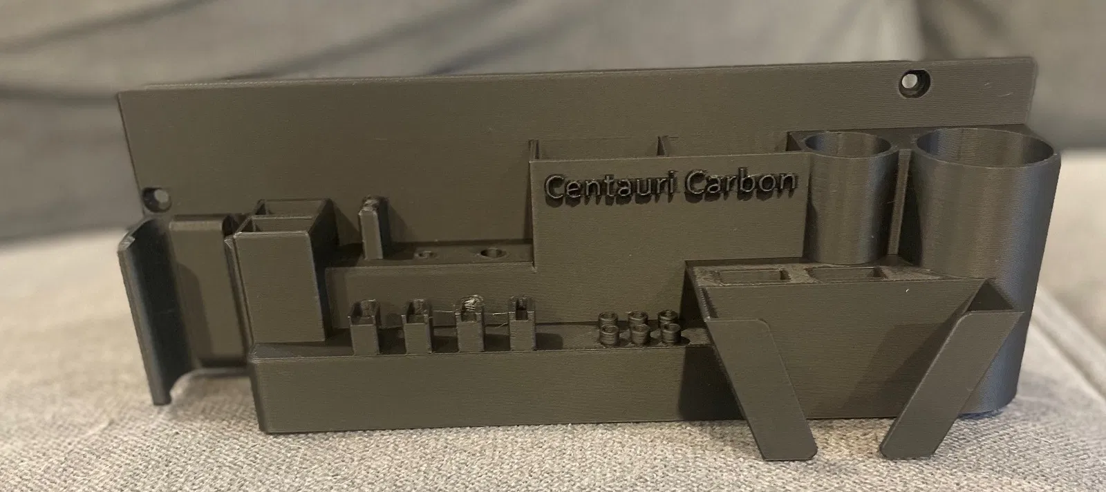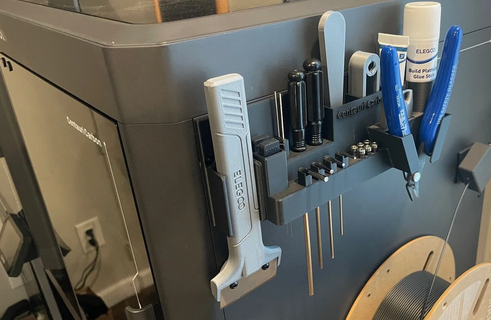 Khay đựng dụng cụ Centauri Carbon gắn vào bên hông máy in Elegoo CC, sử dụng vít có sẵn, không cần nam châm. Thiết kế gốc với nhiều ngăn chứa vít giường, USB, vòi phun, miếng vệ sinh silicone và dụng cụ cạo. Có phiên bản có và không có chữ 'Centauri'.