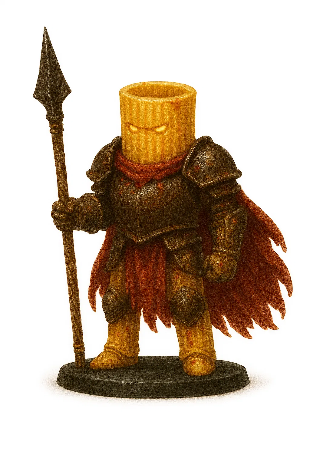 Macaroni sừng sững trên đầu phàm nhân, khoác trên mình bộ giáp rèn từ những chiếc nồi obsidian và những chiếc vá chiến tranh. Vương miện của ông ta là một cái rây xoắn, và áo choàng của ông ta nhỏ giọt không ngừng với sốt cà chua đỏ thẫm. Người ta nói rằng giọng nói của ông ta vang vọng như tiếng nước sôi lục bục, và hơi thở của ông ta thoang thoảng mùi tỏi và sự diệt vong.